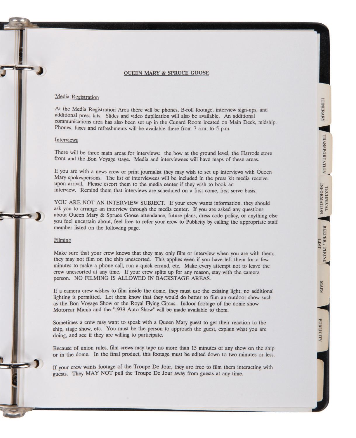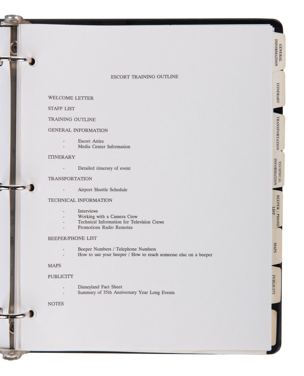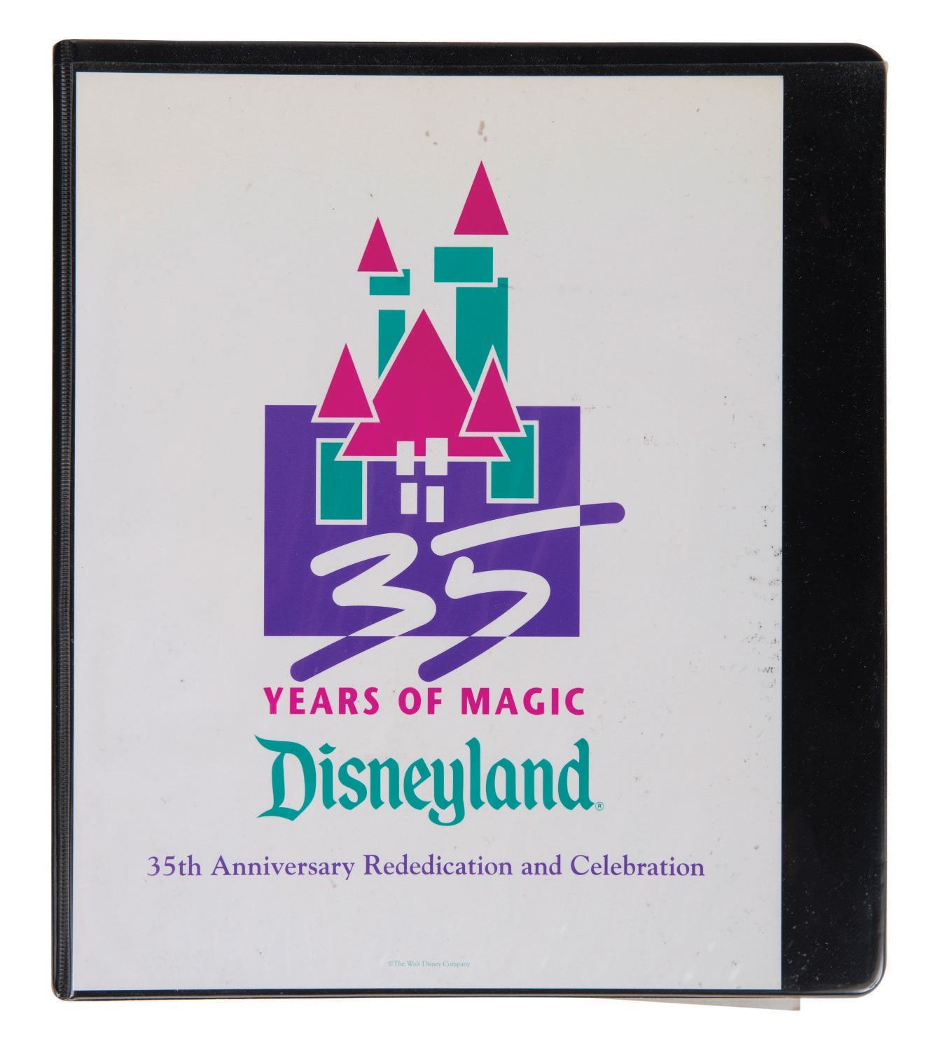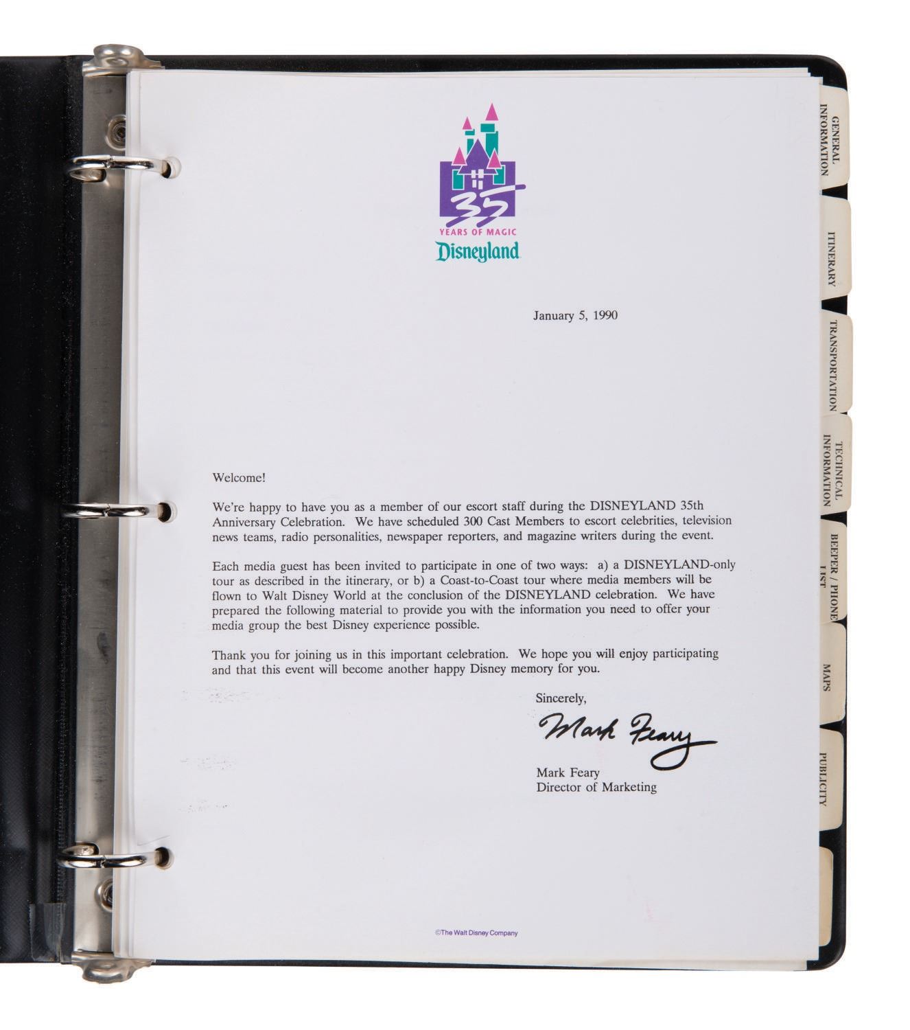(Disneyland, 1990) A Disneyland 35th Anniversary Rededication & Celebration Media Escort Staff materials binder. Among the contents are general information and an itinerary of the 35th anniversary celebration including events held at the Disneyland Hotel and the Queen Mary Christening. Measuring 10"x11.5" , the ringed binder with materials includes 43 pages with dividers and is in very good overall condition. From the estate of Milt Albright.