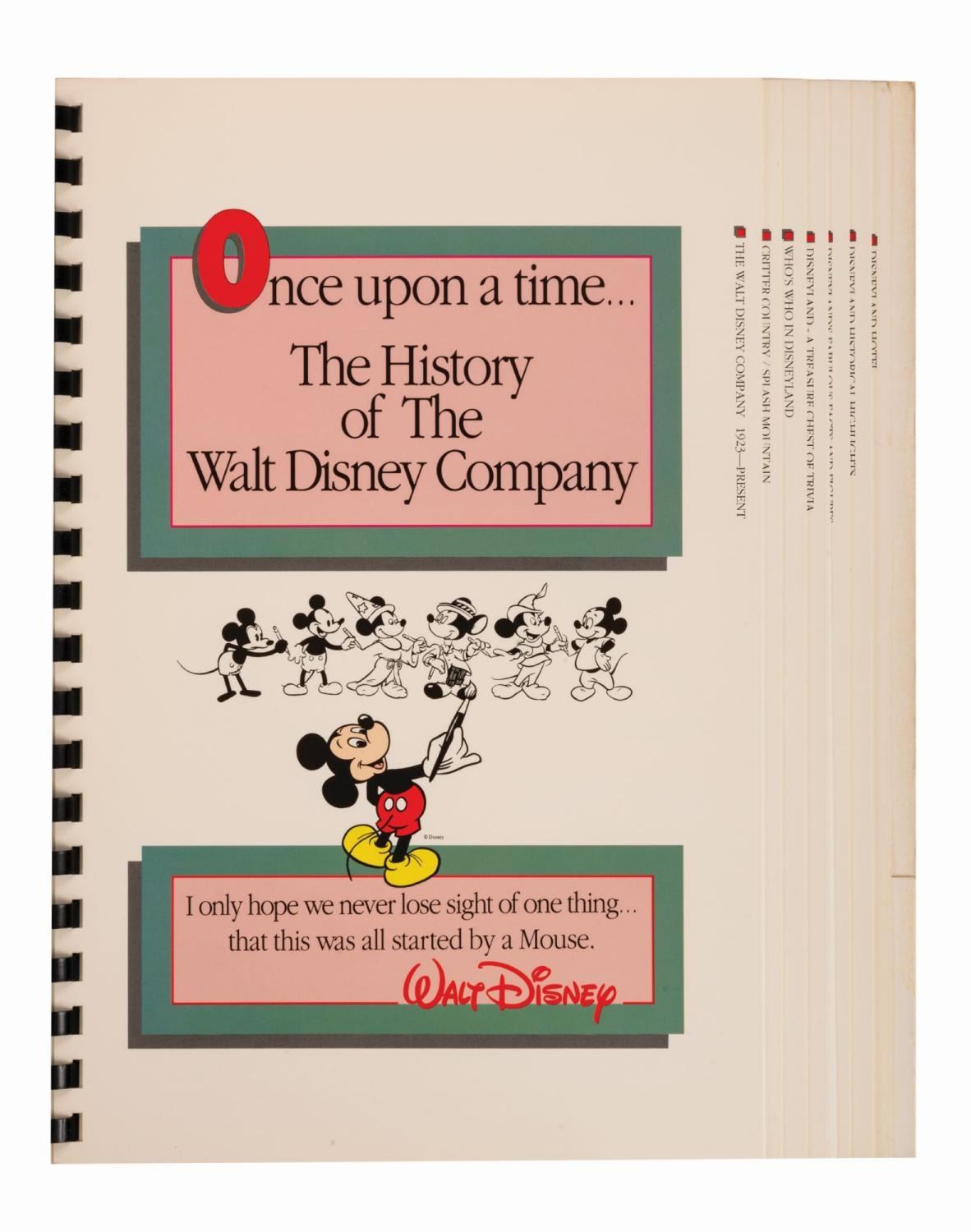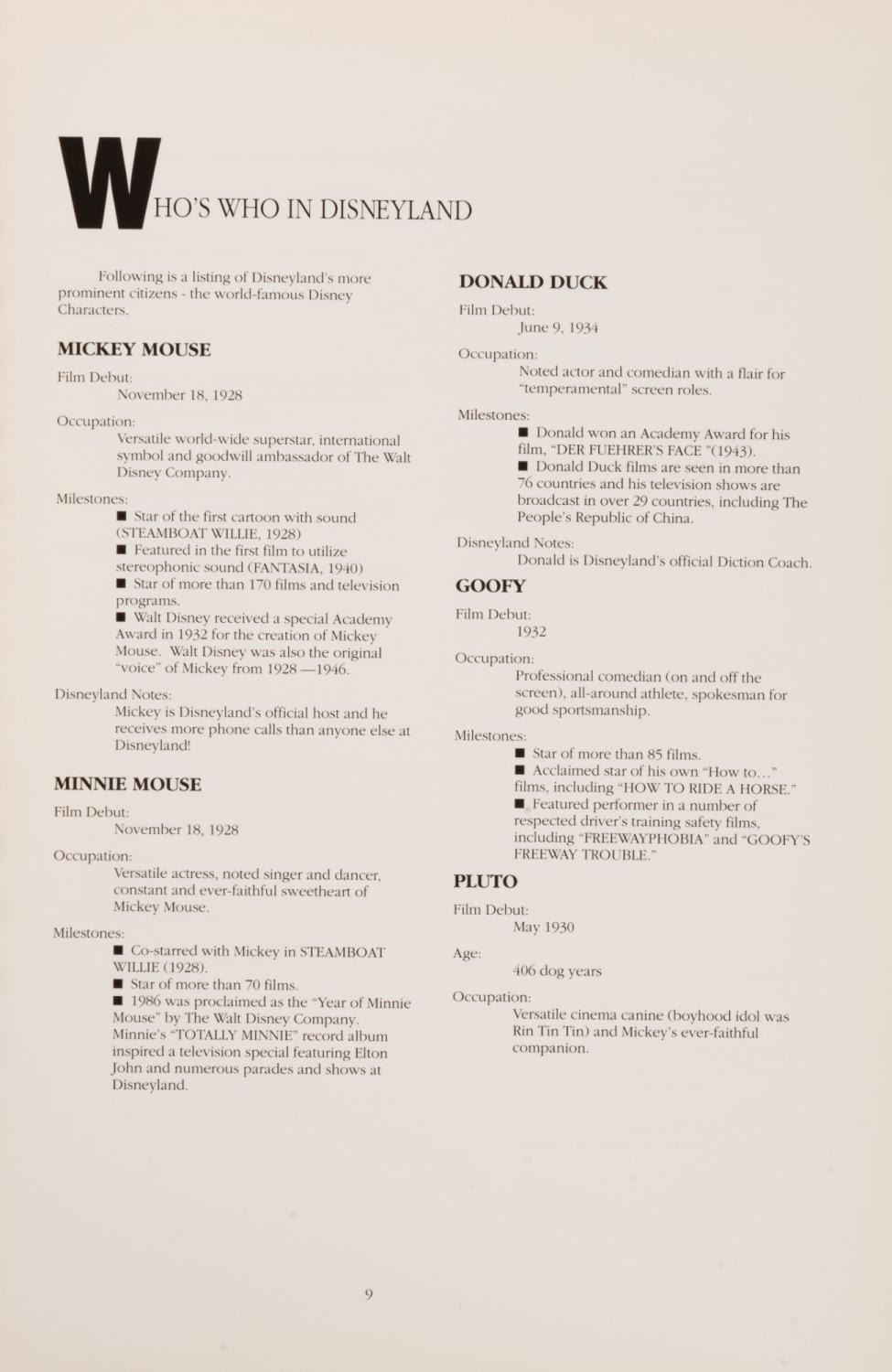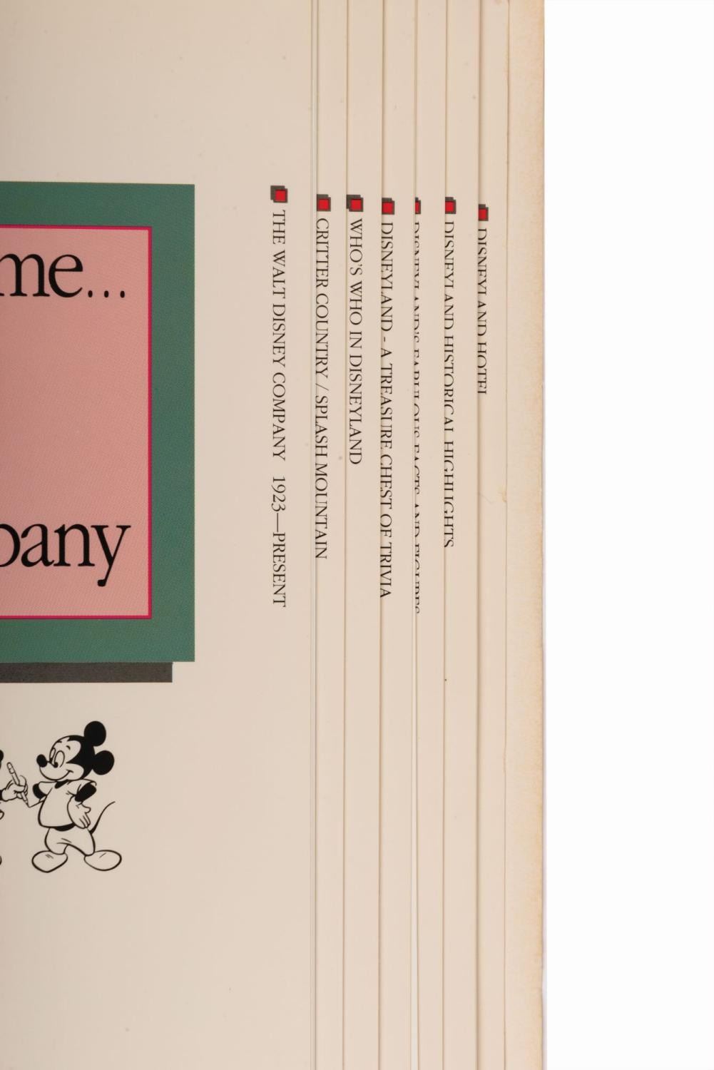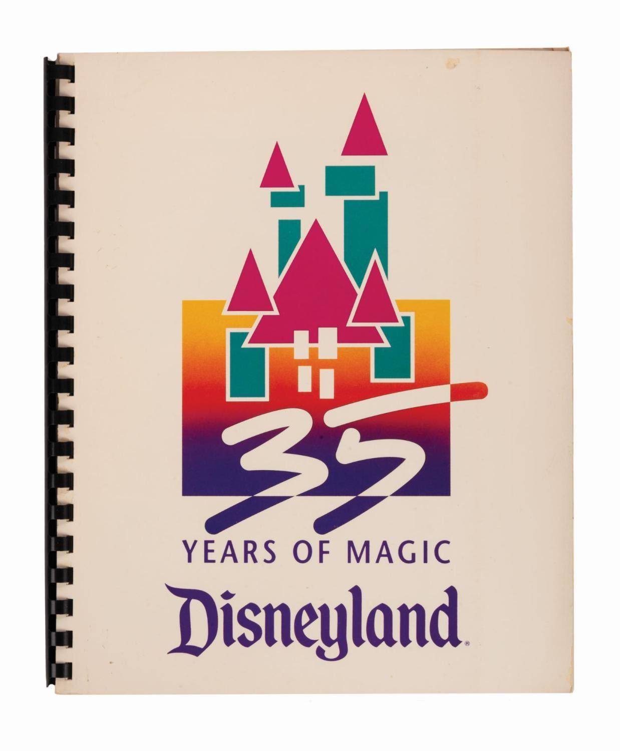 (Disneyland, 1990) A Disneyland information guide created for members of the press for Disneyland's 35 Years of Magic publicity campaign. The spiral-bound, 26-page book features tabbed sections consisting of a Walt Disney Company timeline, a list of industry plaudits such as Academy Awards, facts and figures about Splash Mountain, a guide to the Disney Characters, Disneyland trivia, attraction lists for each land, important events in Park history, and detail about the Disneyland Hotel. Two additional pages list Disney animated characters available for interview as well as sample interview questions. Measuring 11.5"x9.5", the book is in very good condition with very minor spot soiling, natural toning from age, and minimal edge wear to the covers.