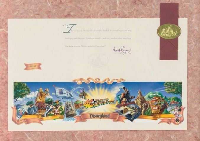 (Disneyland, 1995) A commemorative passport created to mark Disneyland's 40th Anniversary. Titled "40 Years of Adventure", this passport is framed with its die-cut envelope and is numbered 01857. This item measures 15.25"x20" framed, and is in good condition with a thin 0.25" tear along the paper ribbon of the envelope.