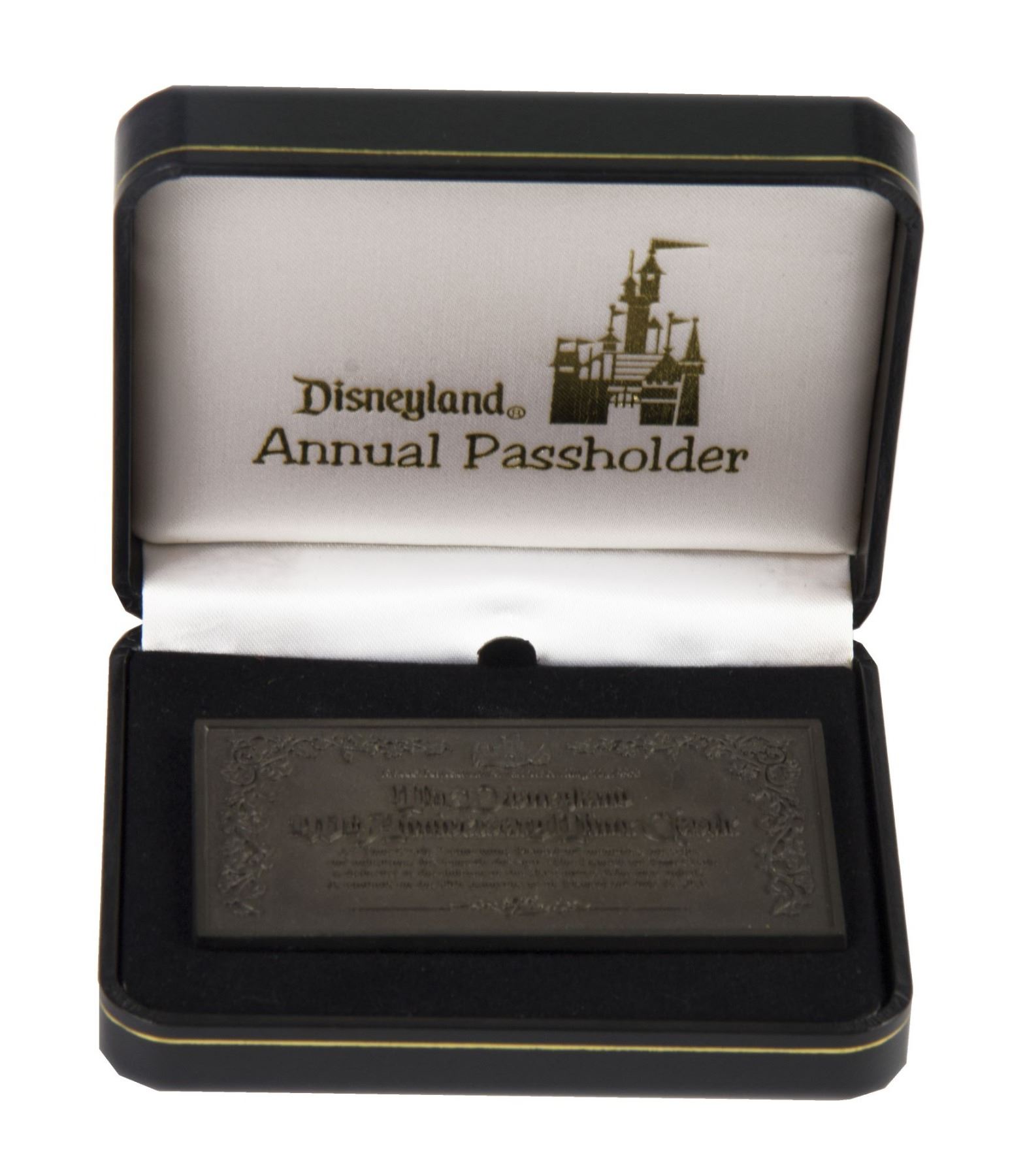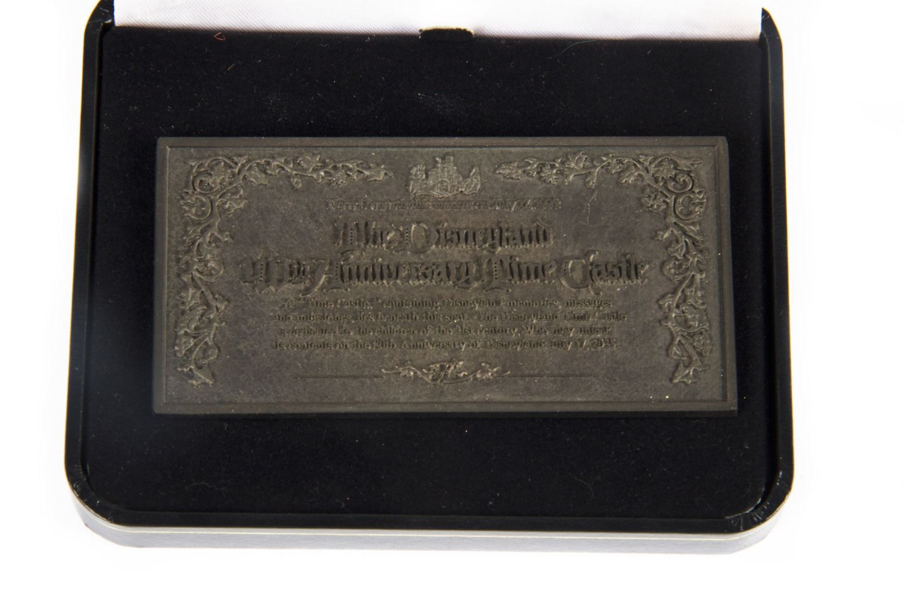 (Disneyland, 1995) A limited edition annual passholder exclusive pin from Disneyland's 40th Anniversary. The pin resembles the Disneyland "Time Castle", a Sleeping Beauty Castle shaped time capsule that was buried in Disneyland for the 40th Anniversary and will be opened on July 17, 2035. The metal pin is marked on the back as number 593/4800, and comes in an elegant clamshell box. Measuring 1.75"x3.5", the pin is in very good condition with little wear.