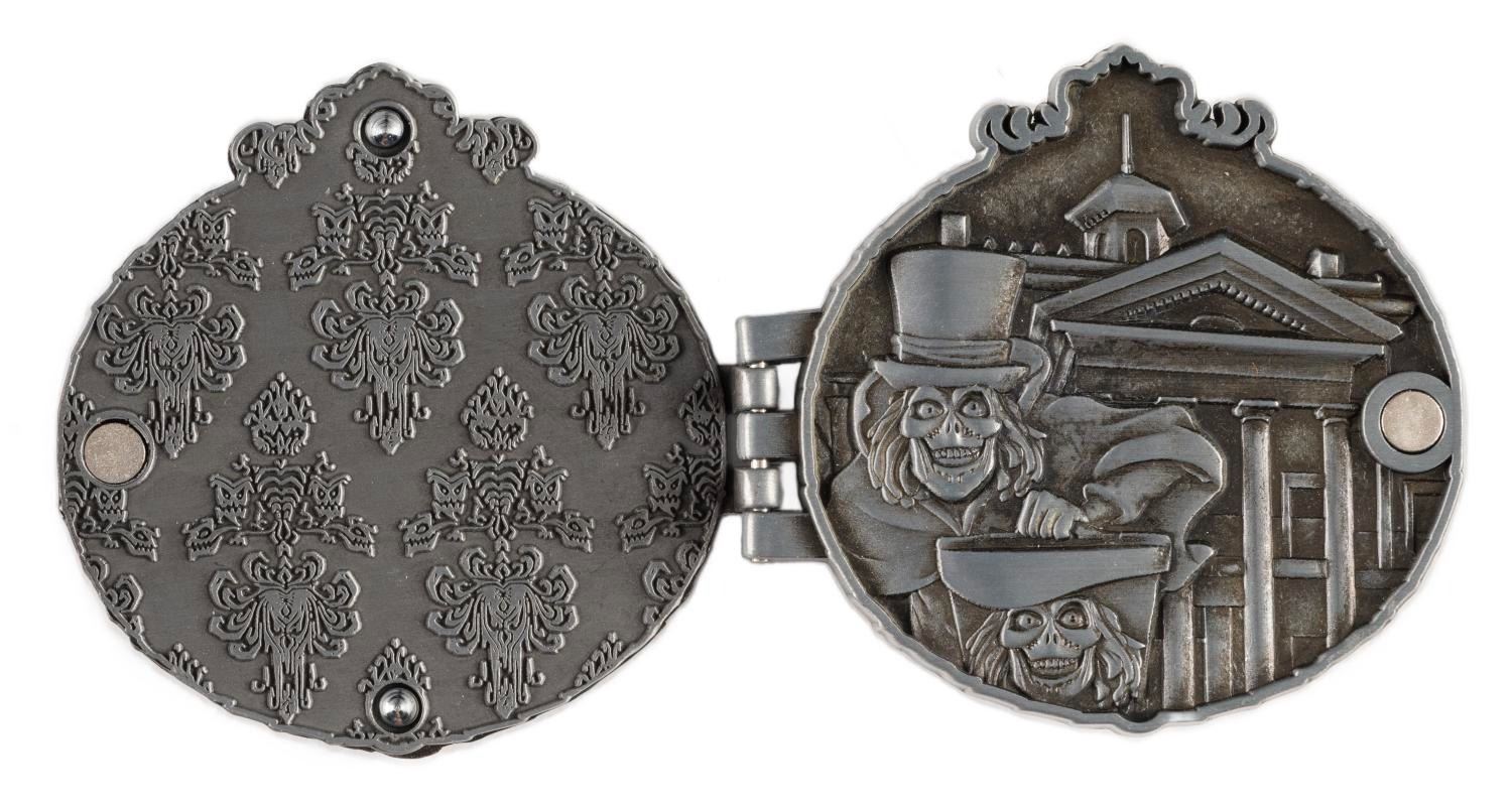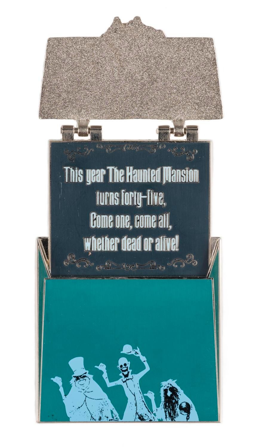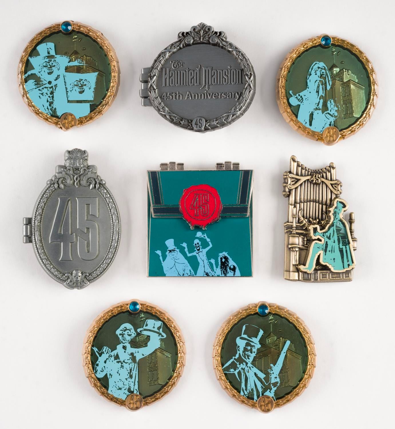 (Disneyland, 2014) A collection of eight pins from the 45th Anniversary of The Haunted Mansion at Disneyland. Included is a Walt Disney Imagineer-exclusive hinged pin featuring the attraction's entrance plaque with the number "45". Each pin is in fine condition with a few signs of wear from handling.
