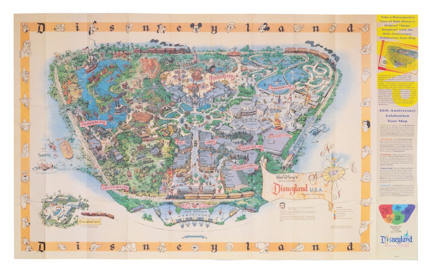 (Disneyland, 2000) A collection of 45th Anniversary memorabilia from Disneyland themed around Sam McKim's original 1958-A Disneyland map. Included are a folded reproduction of the map, an "I Walked in Walt Disney's Original Magic Kingdom" button, a pin of the map, and a pin reproducing the Disneyland U.S.A. logo and scroll seen on the map. Measuring between 1.75"x1" to 2.5"x3.5", the pins and buttons are in fine unused condition. The map measures 26"35.25" when open, and is in fine unused condition, with folds and creases as originally released.