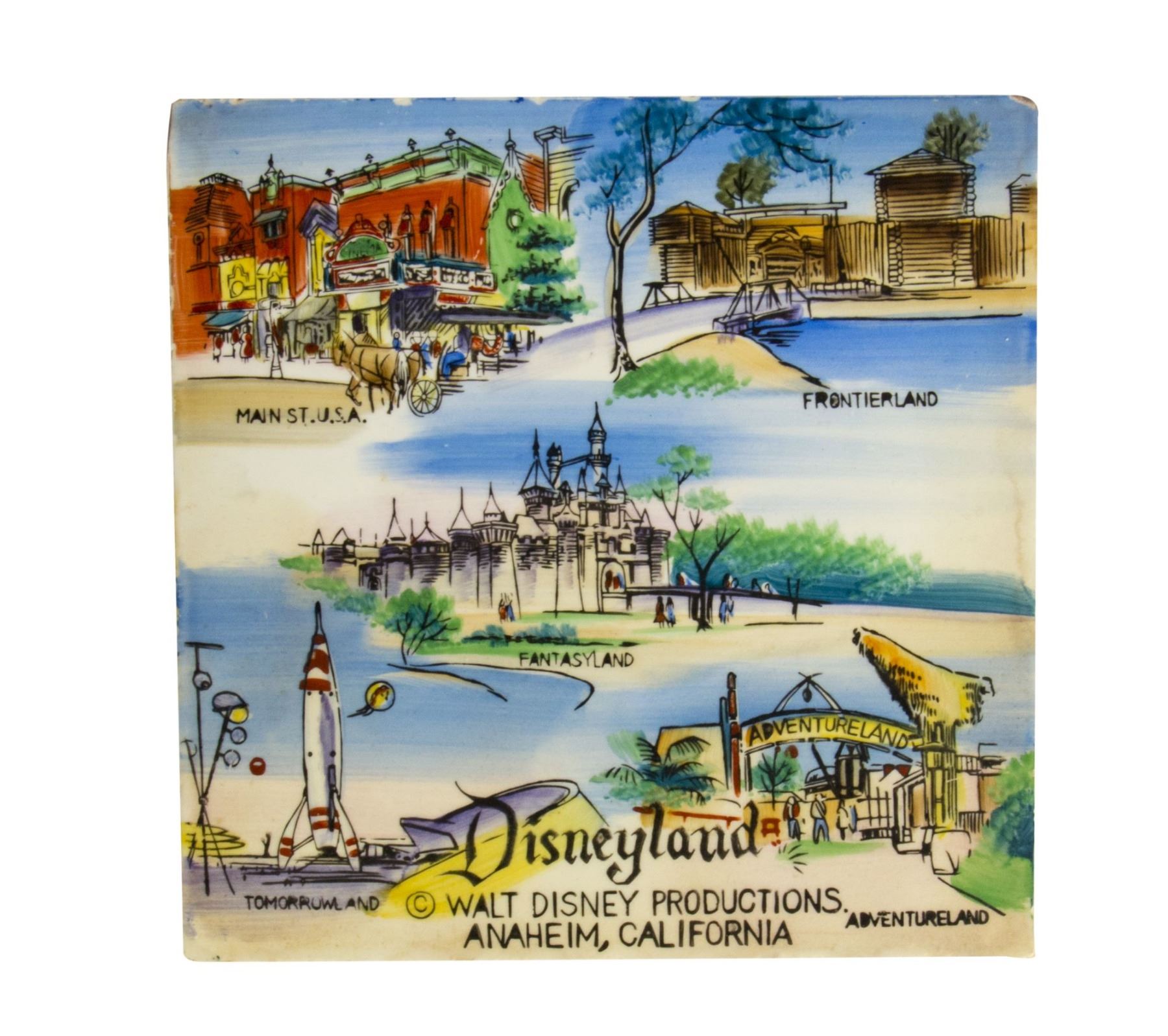 (Disneyland, c.1950s-60s) A hand-painted ceramic tile featuring the original five lands of Disneyland. The tile highlights the "Main Street Cinema", "Fort Wilderness", "Sleeping Beauty Castle", "Rocket to the Moon", and the entrance to Adventureland. Measuring just over 6"x6", the tile is in good condition with some small chips and wear around the edges and some yellowing to the bottom side.
