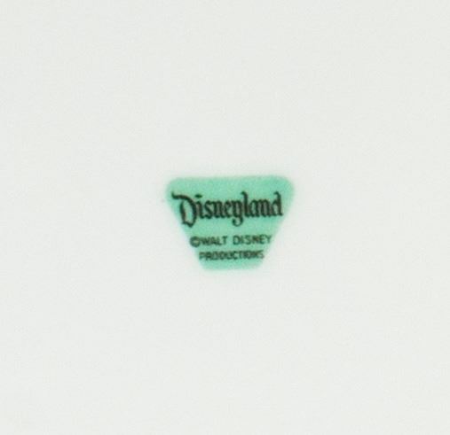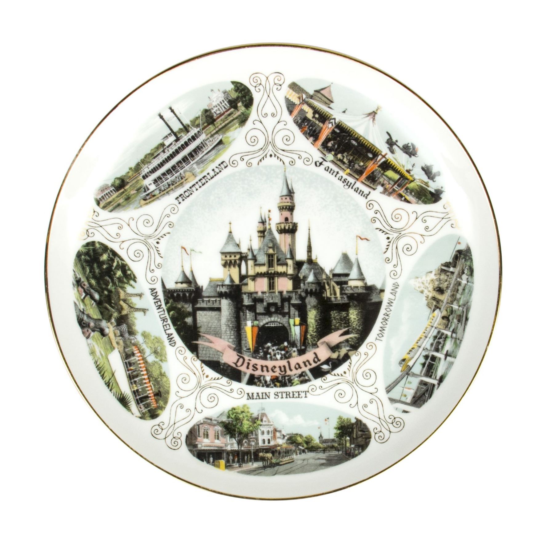 (Disneyland, c.1961) A colorful plate depicting Disneyland's 5 original lands with a large center image of Sleeping Beauty Castle. In addition to the images of the "Jungle Cruise", "King Arthur Carousel", and the "Mark Twain", the Tomorrowland section of the plate includes rare promotional imagery of the yellow Monorail train which debuted in 1961. The plate measures 9.5" in diameter and is in very good condition with minor wear.