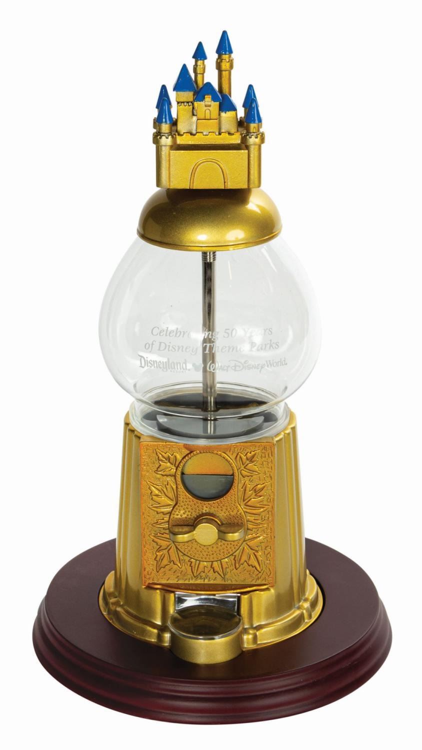 (Disneyland, 2005) A classic coin-operated candy dispenser created to celebrate Disneyland's 50th anniversary. This machine has been attributed as a press gift and consists of a gold-colored metal body and cap with a glass globe, and a metal Sleeping Beauty Castle topper. The globe reads "Celebrating 50 Years of Disney Theme Parks" with both resort names beneath, and the dispenser comes with a wooden stand for display. Measuring 12.75" tall with the stand and topper included, the dispenser is in good condition with minimal wear to the main machine. The castle topper displays some cracking to both paint and metal, most prominently seen on the two tallest spires.