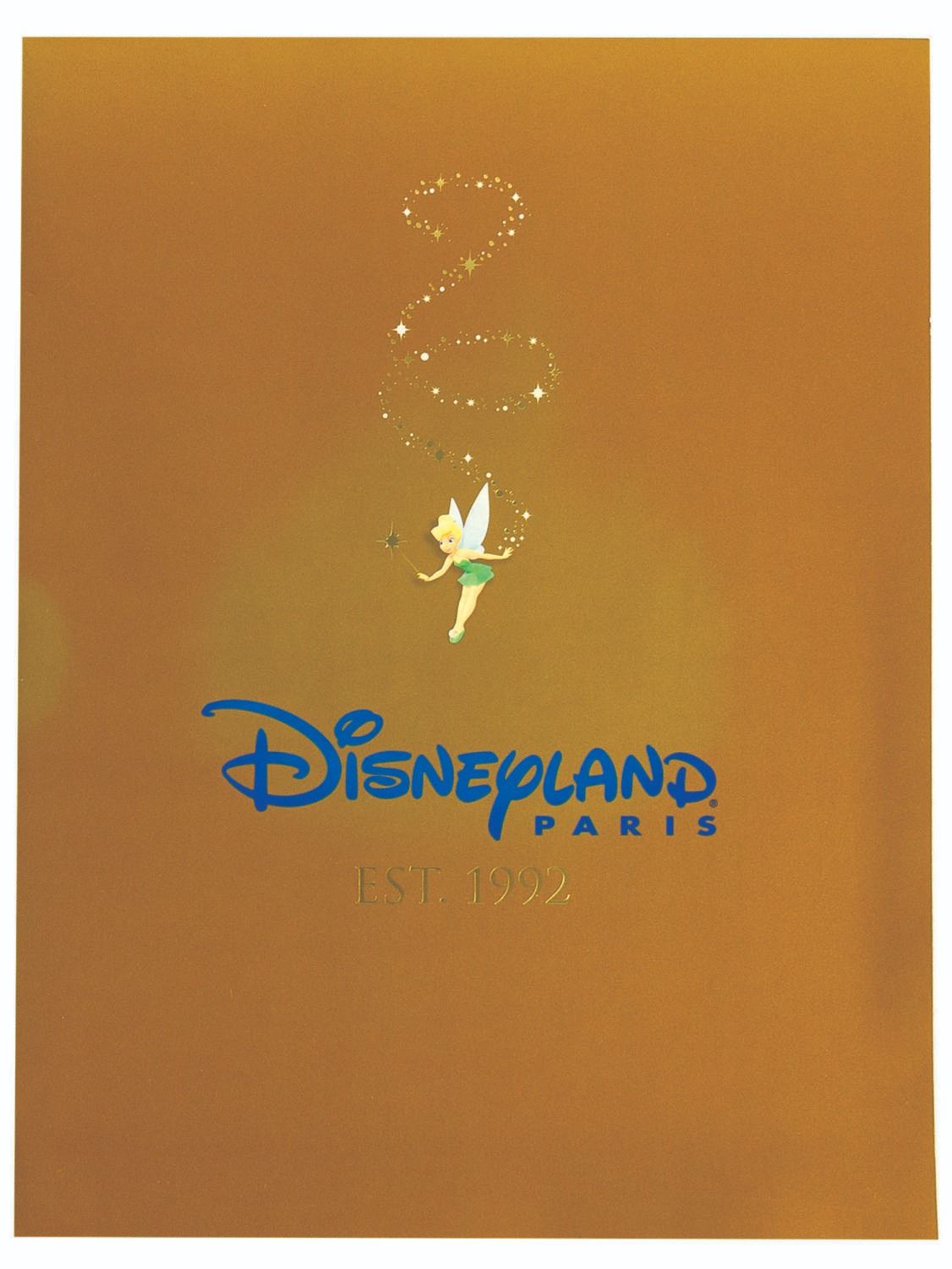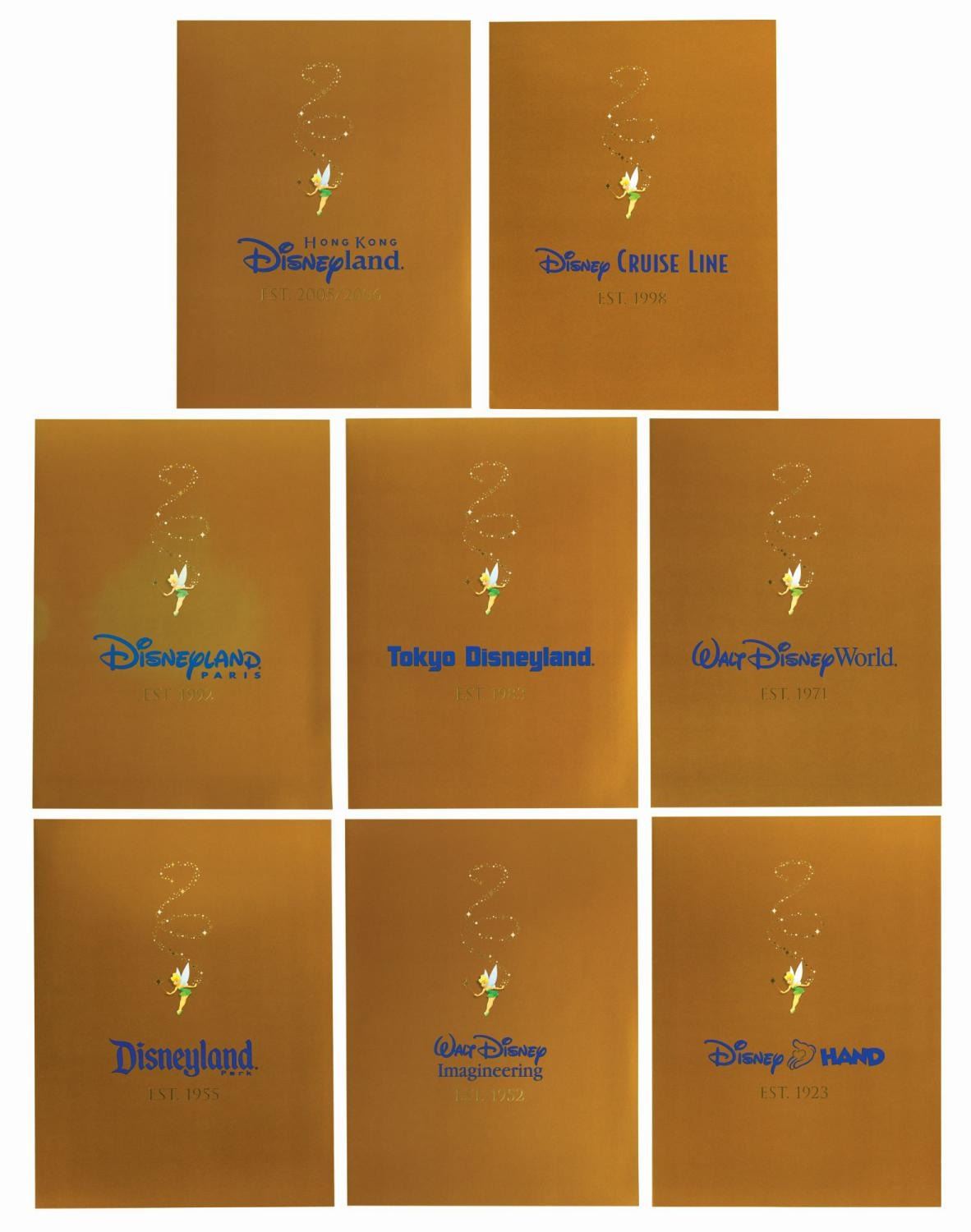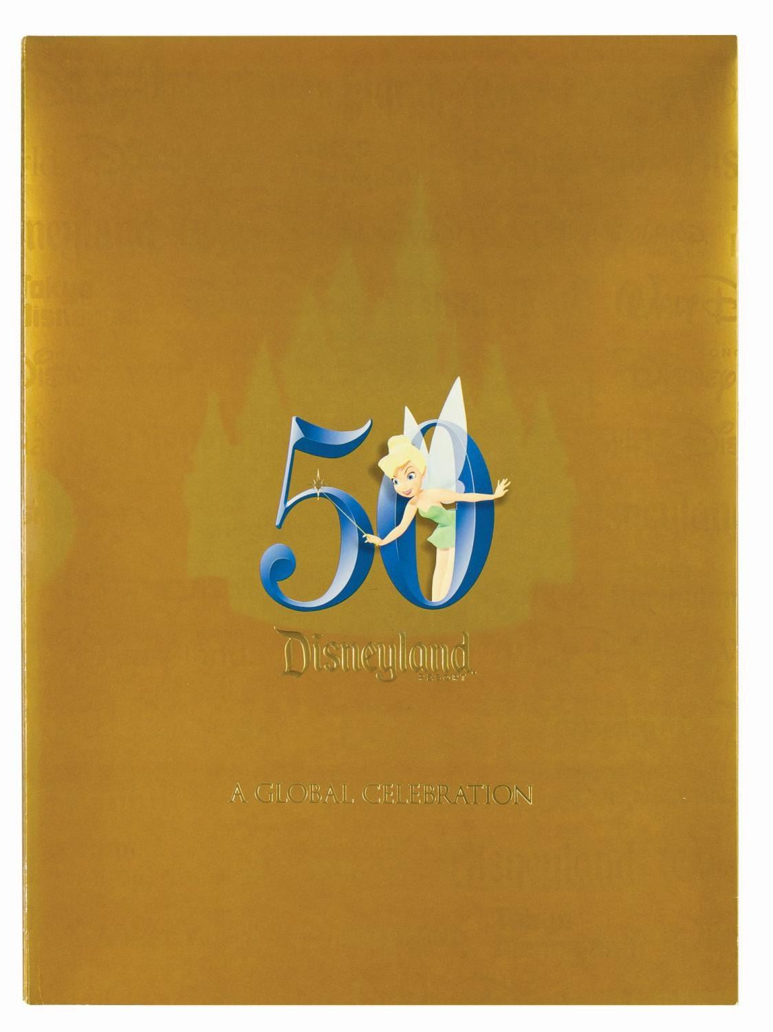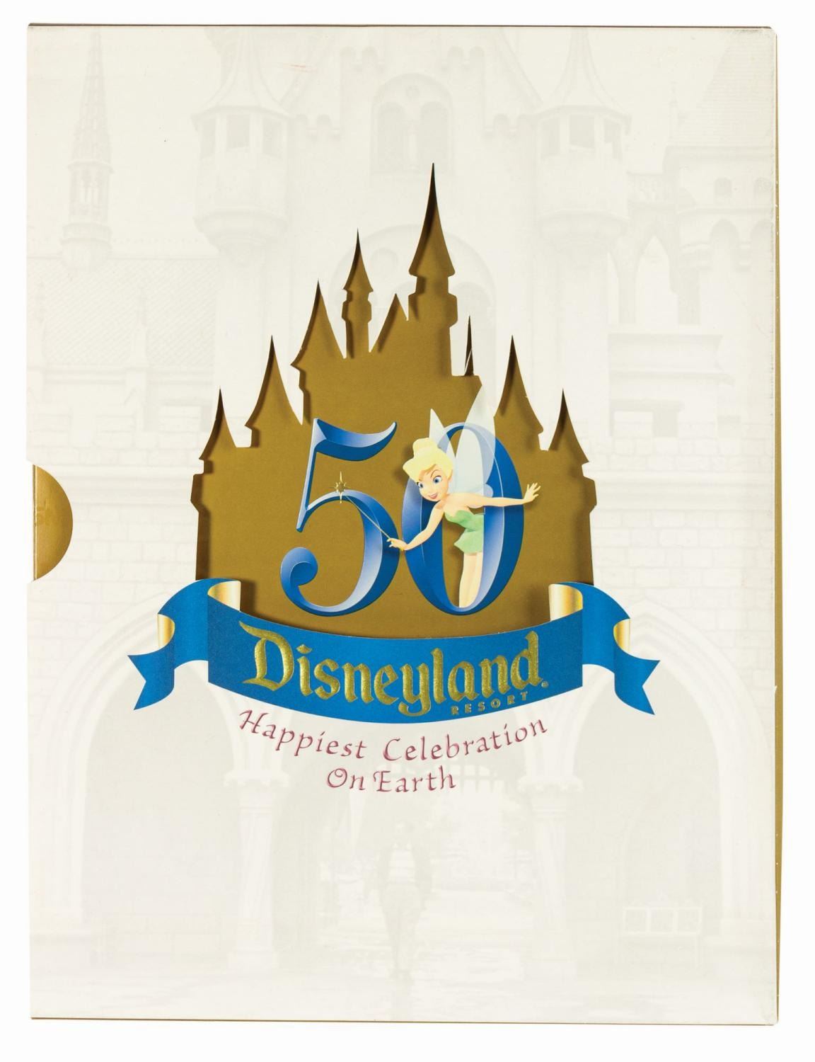 (Disneyland, 2005) An original press kit created to promote the Disneyland 50th Anniversary: A Global Celebration festivities world-wide. The set consists of a slipcase containing a master folder that opens to reveal a large holographic image of Sleeping Beauty Castle festooned with anniversary regalia. A side pocket in the folder houses an additional series of (8) press kit folders, each containing a press release and photo print. Measuring 12.25"x9" assembled, the set is in very good condition with minor crushing to the slipcase and side pocket of the master folder.