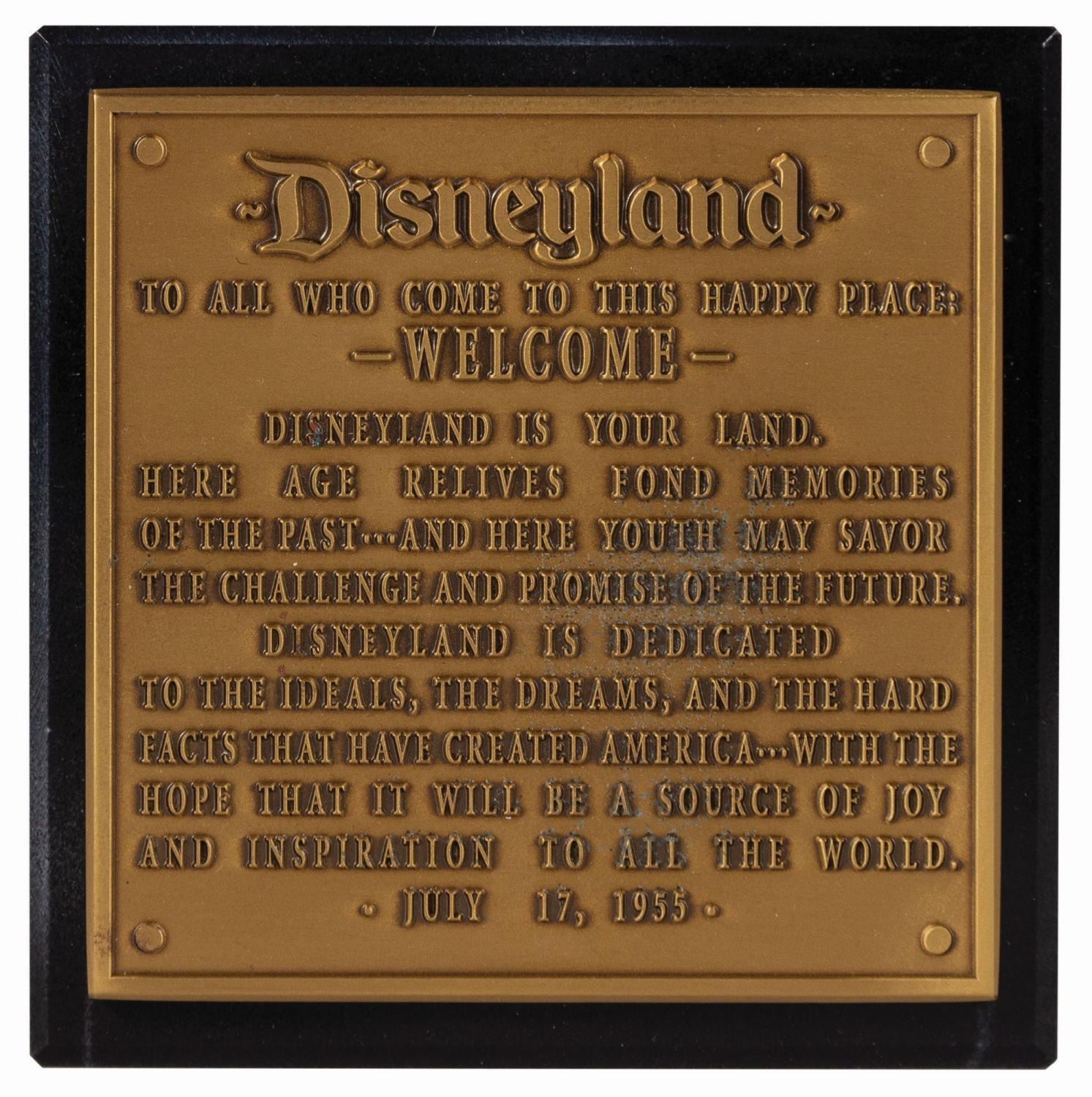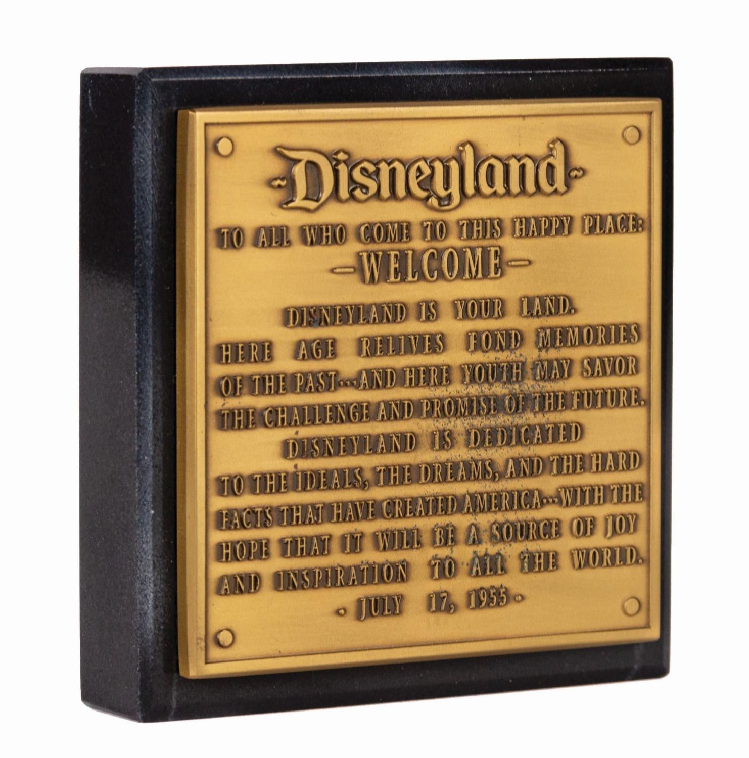 (Disneyland, 2005) A miniature replica of the original Disneyland dedication plaque presented by Walt at the park's grand opening ceremony on July 17th, 1955. The plaque, created in celebration of Disneyland's 50th anniversary, consists of a cast metal face with relief text and a polished black stone base with a felted bottom. The original cardboard presentation box is included. The plaque measures 4"x4" and 0.5" deep and is in very fine, as-new condition. The box is 5.75"x5.75" and 1.75" deep with some minor surface wear.