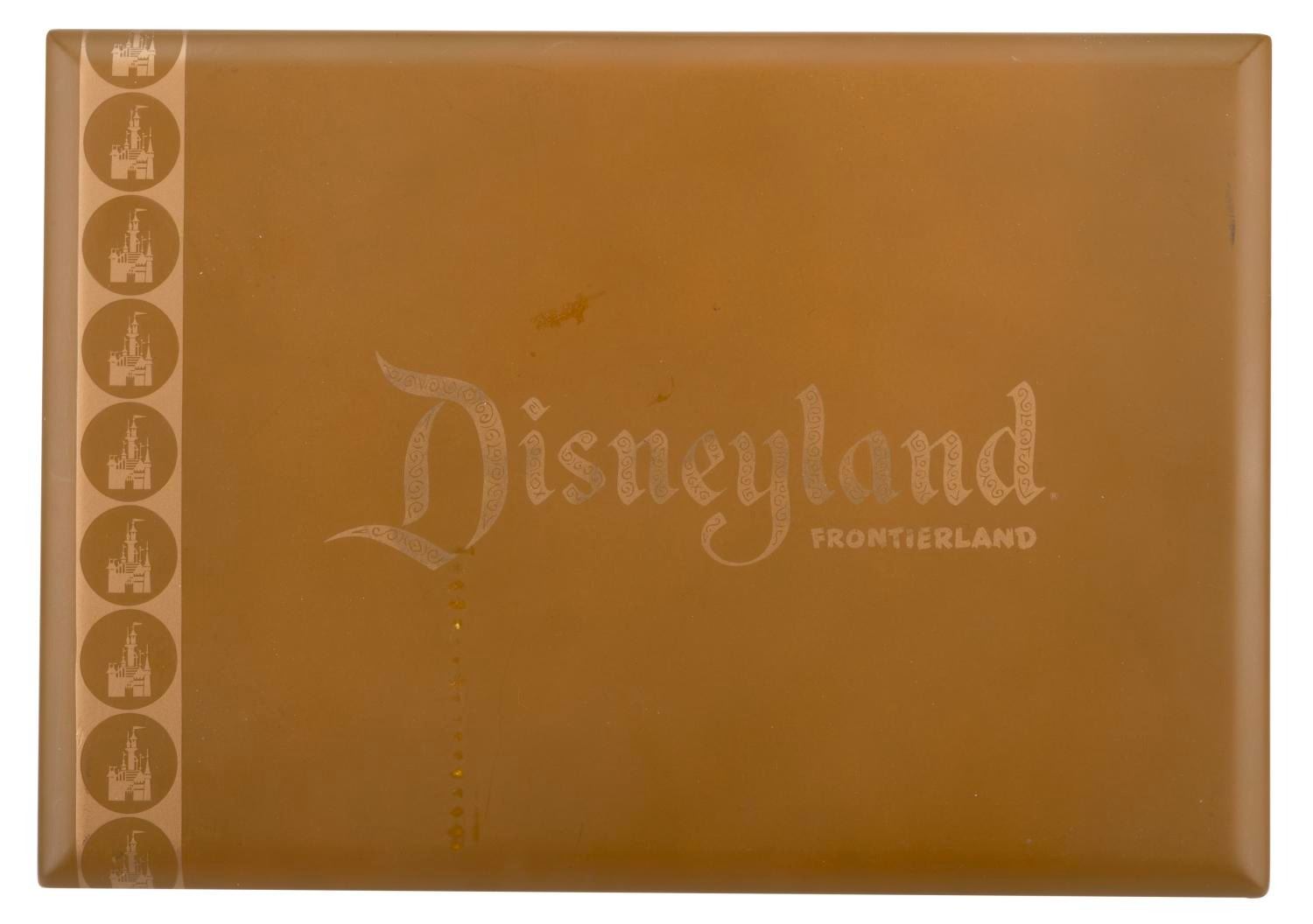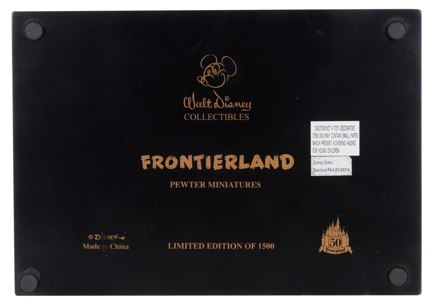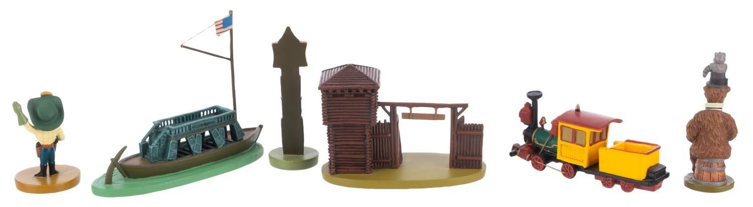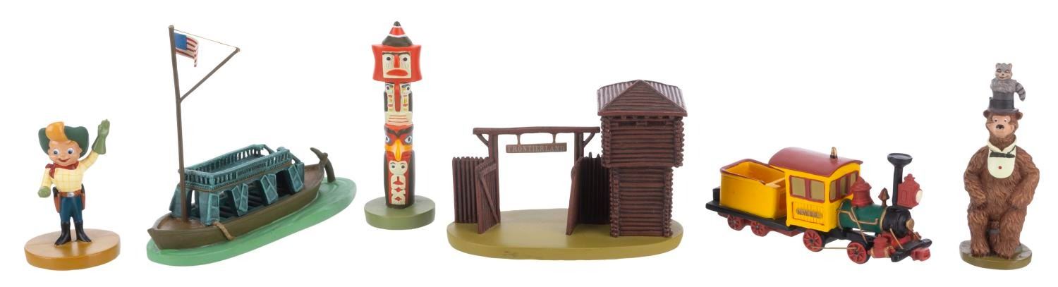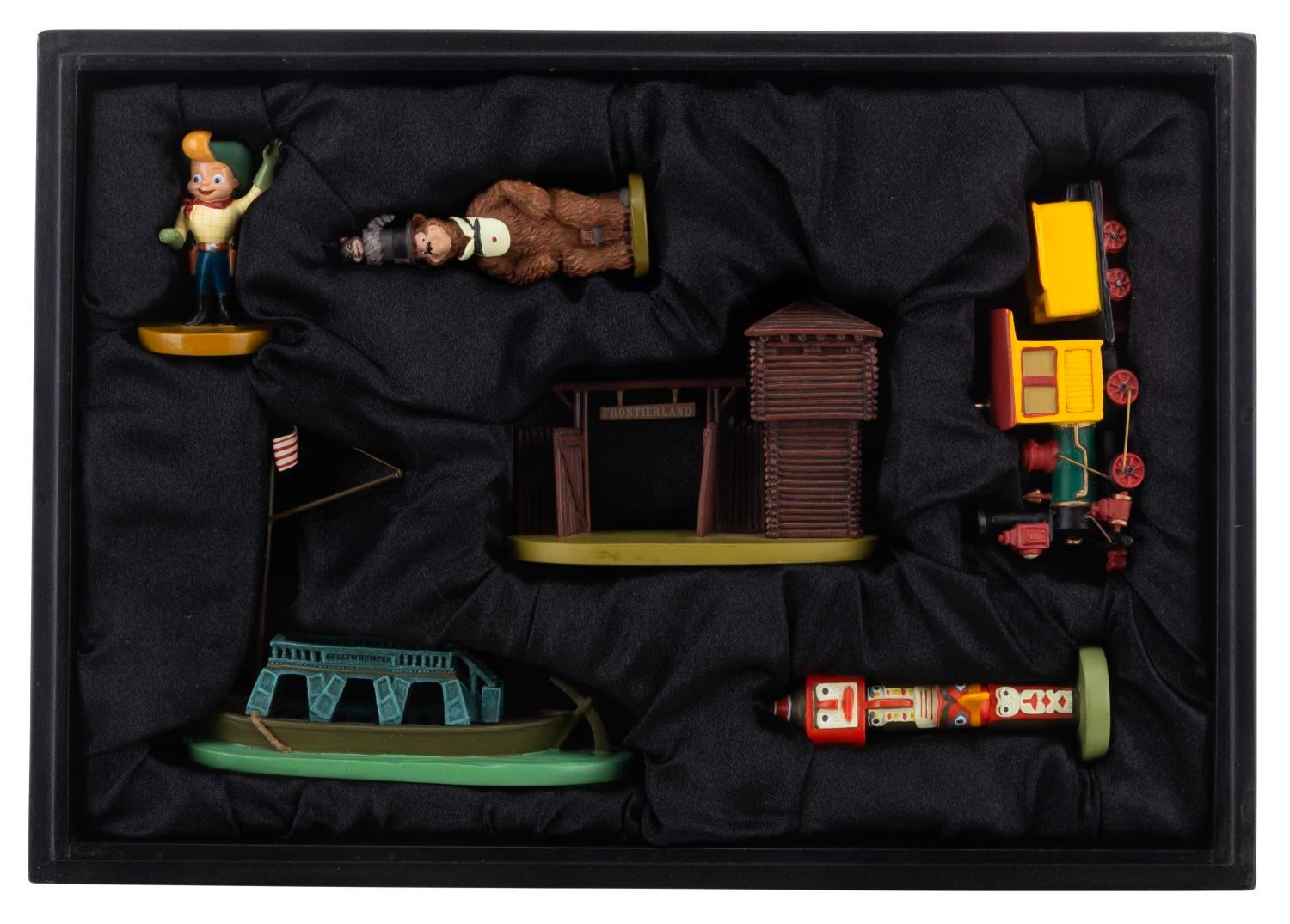 (Disneyland, 2005) A set of six Frontierland miniatures designed by Kevin Kidney and Jody Daily. Released for the 50th anniversary of Disneyland in an edition of 1500, the pewter miniatures include the Nature's Wonderland Mine Train, the Frito Kid, Country Bear Henry, the Frontierland Stockade entrance, an Indian Village totem pole, and the Gullywhumper Keel Boat. The figurines range in size from 1.75" to 3" tall and are in very good to fine condition with a stain to the base of the Stockade. The figurines are accompanied by a COA in the original 7” x 10” x 3.5” resin box in good condition with light wear, chips, and stains.