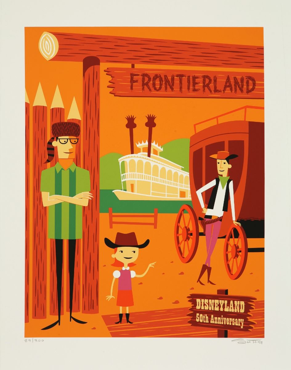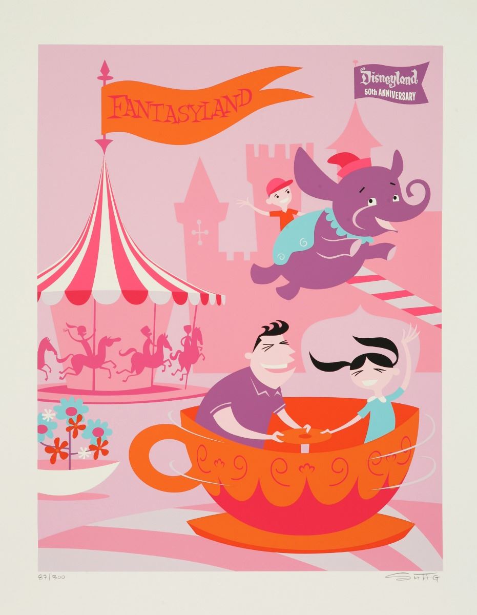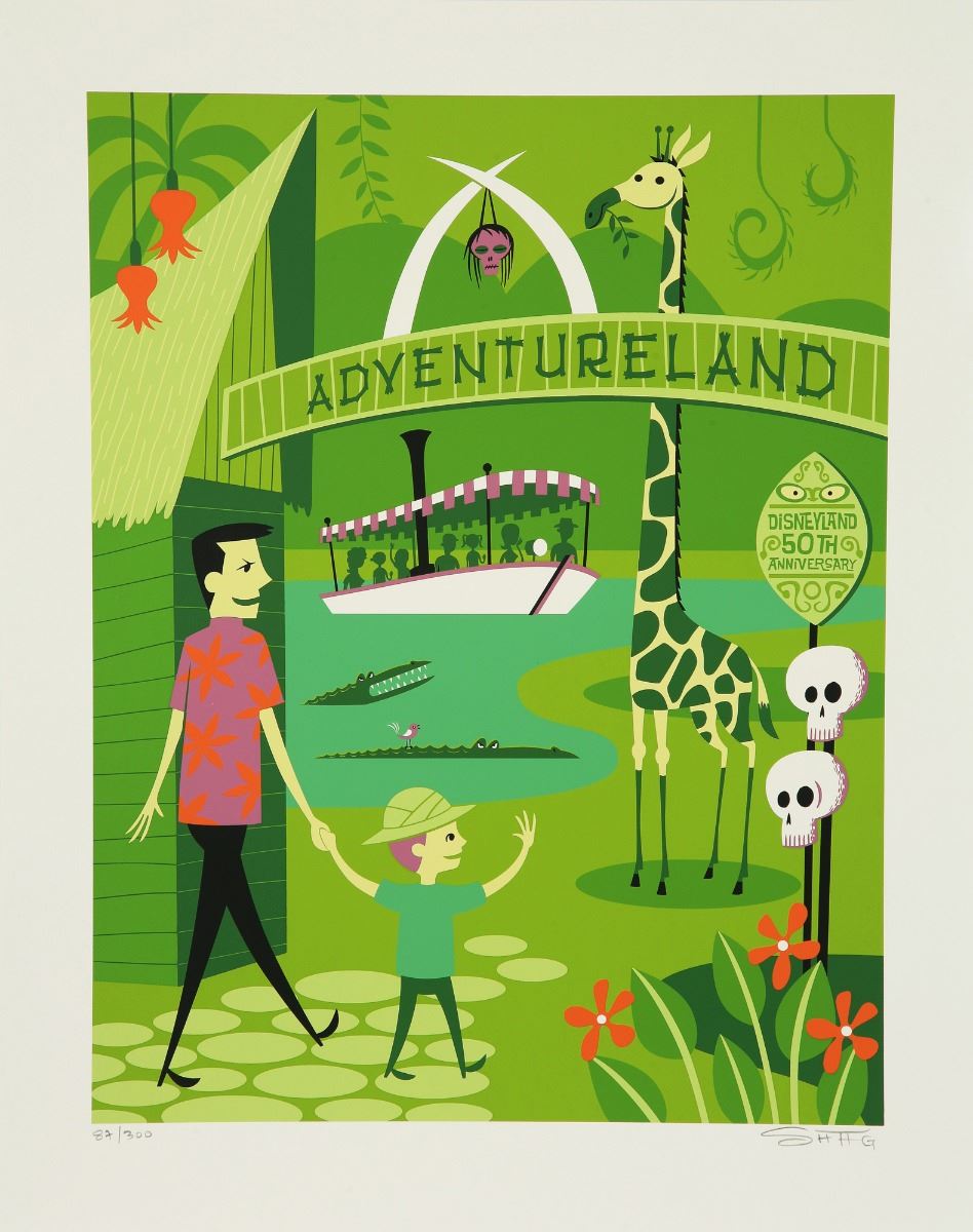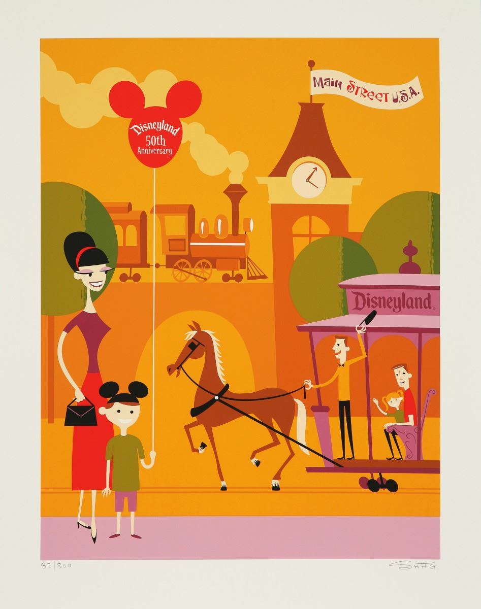 (Disneyland, 2005) Hard-to-find limited edition set of pop artist Shag's interpretations of the Disneyland Lands. Created for the 50th Anniversary of the park, the boxed set contains (5) 27"x21" prints, each signed by the artist. Included are Tomorrowland, Adventureland, Frontierland, Fantasyland, and Main Street U.S.A. Only 300 sets were made for this edition and this set is numbered 87/300. In fine condition.