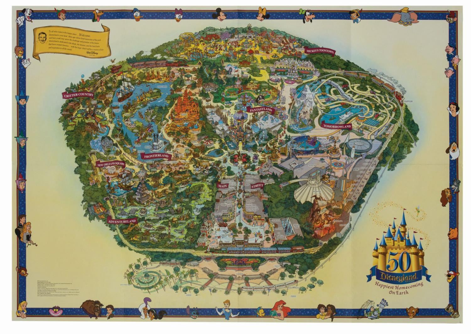 (Disneyland, 2005) A Disneyland souvenir map created for the park's 50th anniversary. The stylized illustrated map features the first appearances Big Thunder Ranch and the Buzz Lightyear Astro Blasters. Folded as issued, the map measures a full 27"x39" and is in fine condition with minor fold wear.
