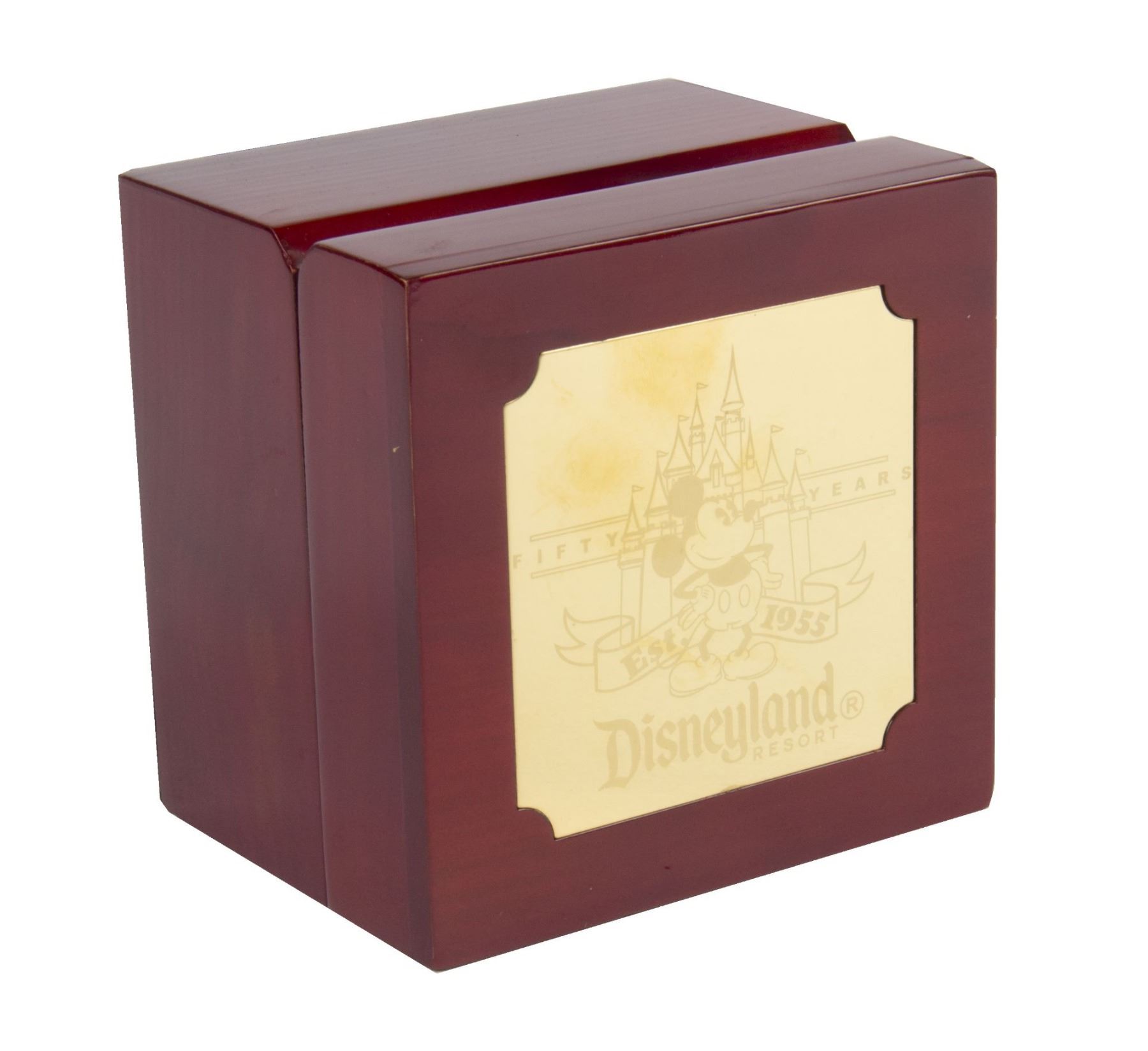 (Disneyland, 2005) A souvenir pocket watch created for Disneyland's 50th Anniversary. The watch features Mickey with Sleeping Beauty Castle on the front, and the watch face has a Mickey-ears logo and notes the 50th Anniversary. The back of the watch is separated so that a battery can be added. The watch comes in a wooden box with a "D" emblem pin. Measuring 2" in diameter, the watch is in very good condition with little wear.