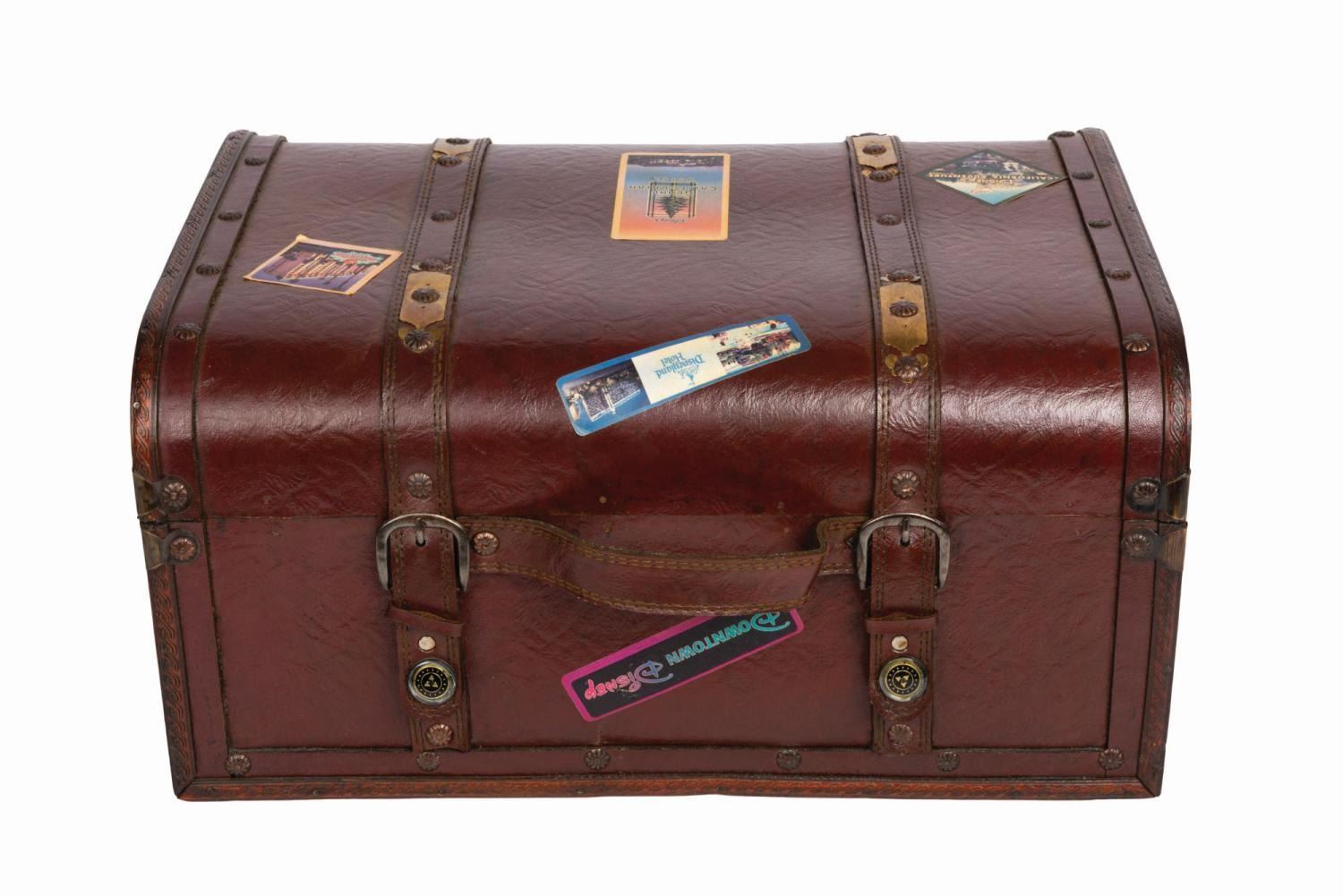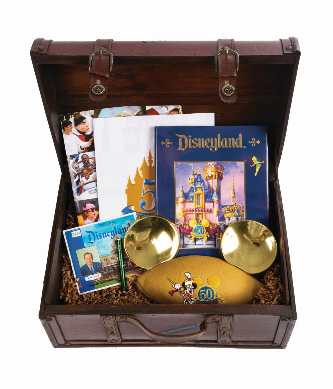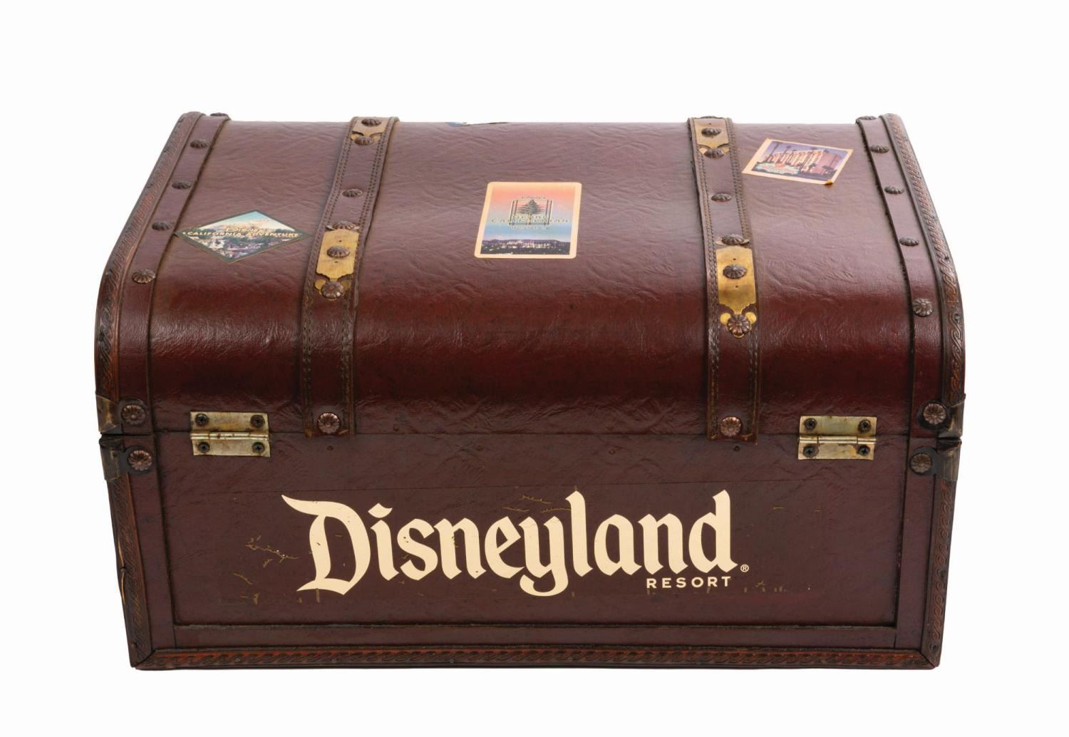 (Disneyland, 2005) A Disneyland 50th Anniversary Press Kit enclosed in decorated suitcase. The Press Kit was distributed in conjunction with a "Disneyland Resort - Happiest Homecoming on Earth" Press Event held at the St. Regis Hotel in New York City. The kit contains a Pair of Golden Mickey Ears, Copy of "Disneyland: Then, Now, and Forever" a 192-page hardcover by Bruce Gordon & Tim O'Day, (2) Press Kits (containing News Releases, color Press Photographs, Fact Sheets, and much more. Measuring 16.5"x12" and 8.25" deep, the 1990s-style wood and leatherette prop "suitcase" is in good used condition, featuring distressed labels bearing imagery and indicia of Disneyland Resort destinations.