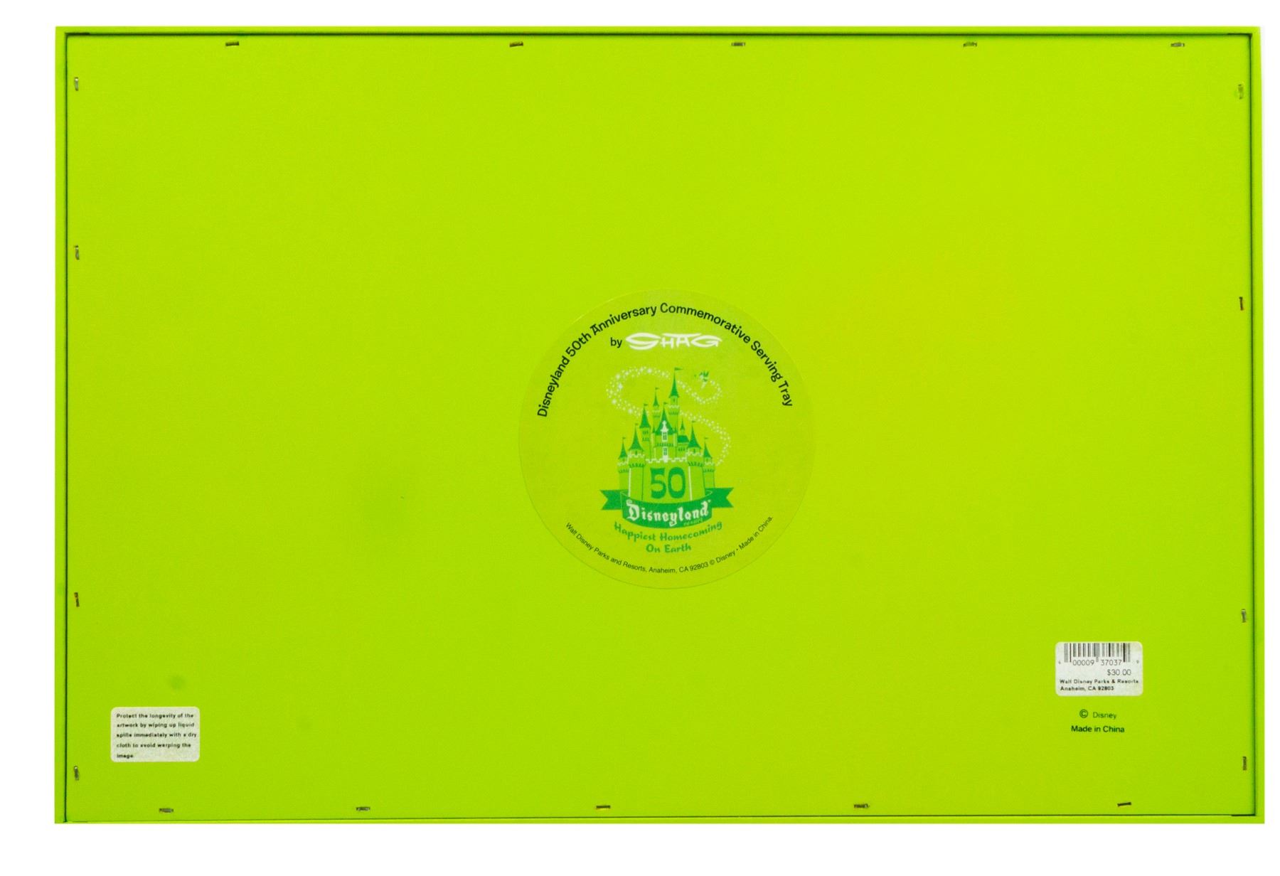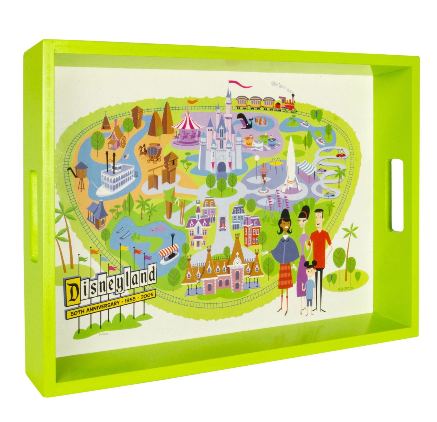 (Disneyland, 2005) A stylish serving tray designed by the artist Shag for Disneyland's 50th anniversary. Accomplished in Shag's iconic style, the tray features a depiction of a Disneyland park map within the green wooden tray frame. The tray measures 12.25"x18" and 2.25" deep and is in good condition overall with minor surface wear from light use. The tray comes in its original box.