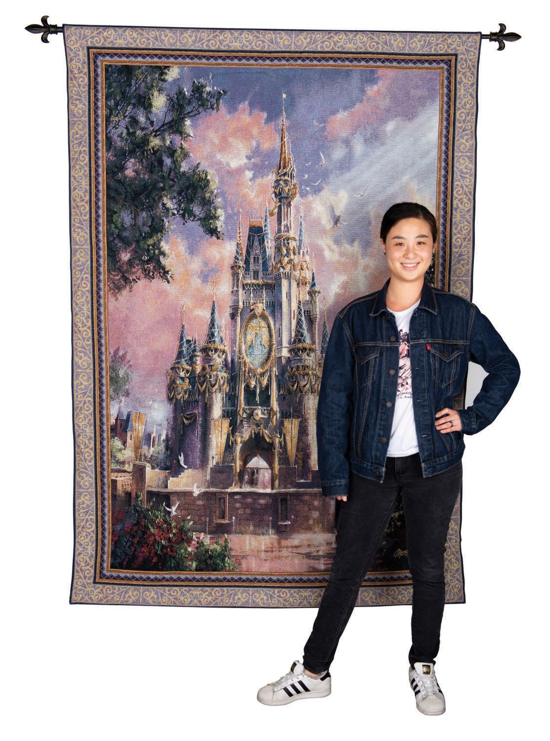 (Disney Parks, 2005) A 50th Anniversary Magical Celebration Cinderella Castle Tapestry available during the 50th Anniversary of Disneyland. This beautiful large tapestry was the Walt Disney World Edition and features an image of Cinderella's Castle as it appeared for the 2005 Celebration. Available through the Disney Store and Disneyland, the tapestry is made of heavy woven fabric and was produced in a limited edition of 500 pieces. Measuring a very large 4'x7', the wall hanging is in fine as-new condition, and comes with an adjustable hanging rod.