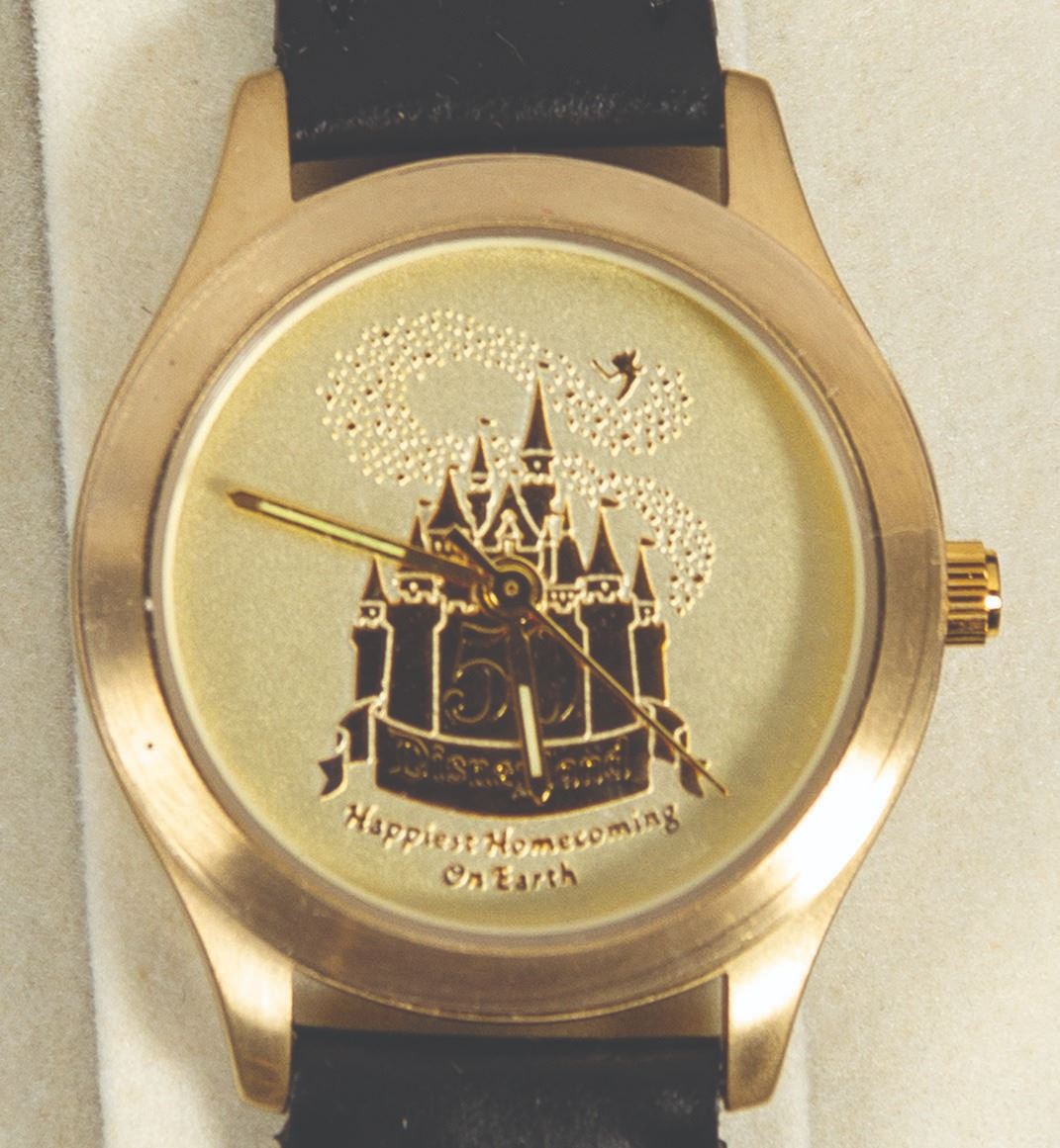 (Disneyland, 2005) A Disneyland 50th anniversary wristwatch manufactured by Ballanda. The Japan movement watch features a gold-tone brushed metal case and bezel with a raised Sleeping Beauty Castle 50th anniversary logo on the face. The watch strap is black leather with a gold-tone metal buckle. The wristwatch is housed in the original leatherette and board presentation box with felted form fitted insert and a Disneyland 50th anniversary print in a die-cut window on the lid. The watch measures 8.5"x1.25" and is in very fine, as-new condition with the protective plastic cling still attached. The box is 6"x2.75" and 1.75" deep with minimal wear.