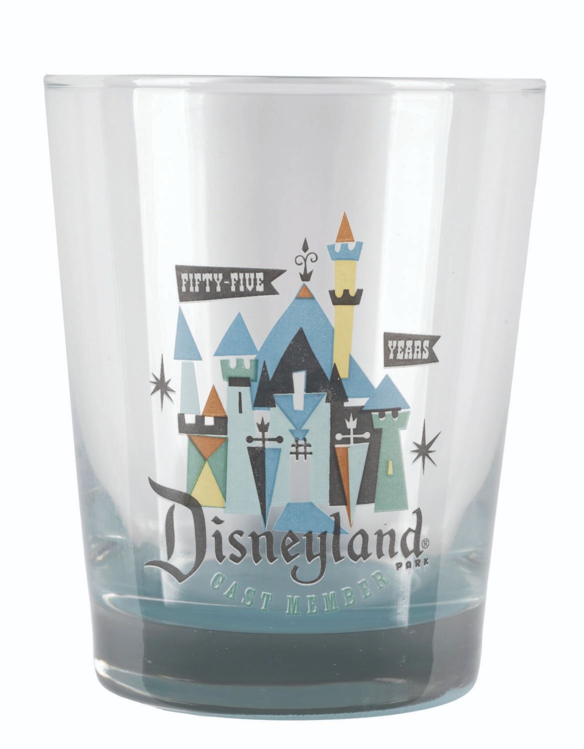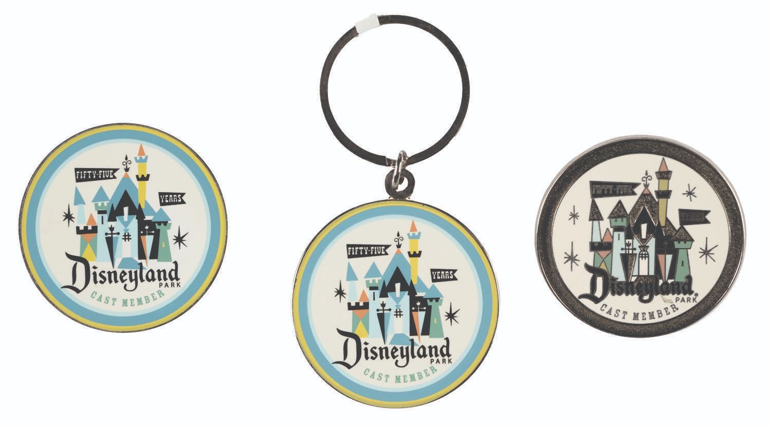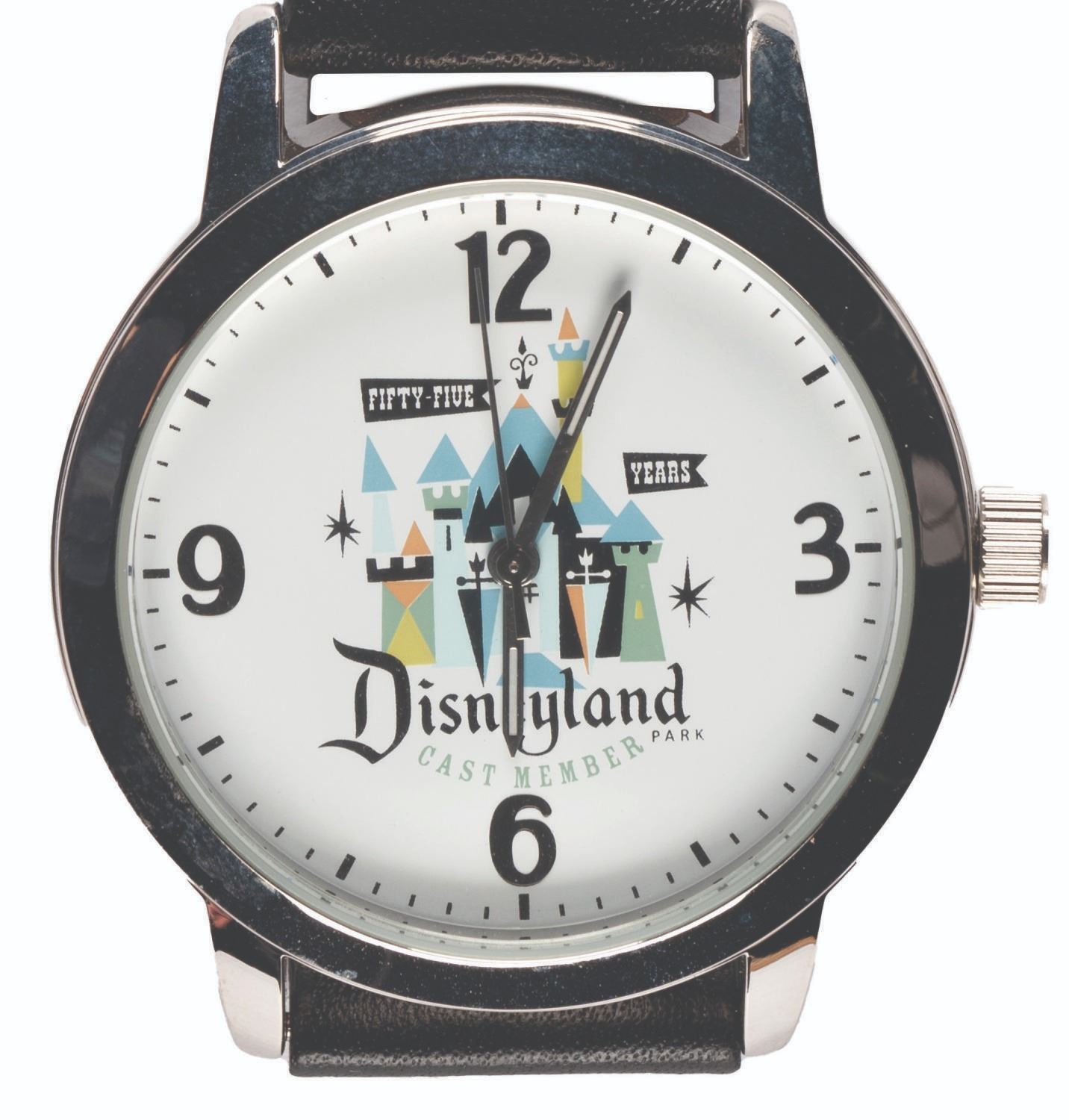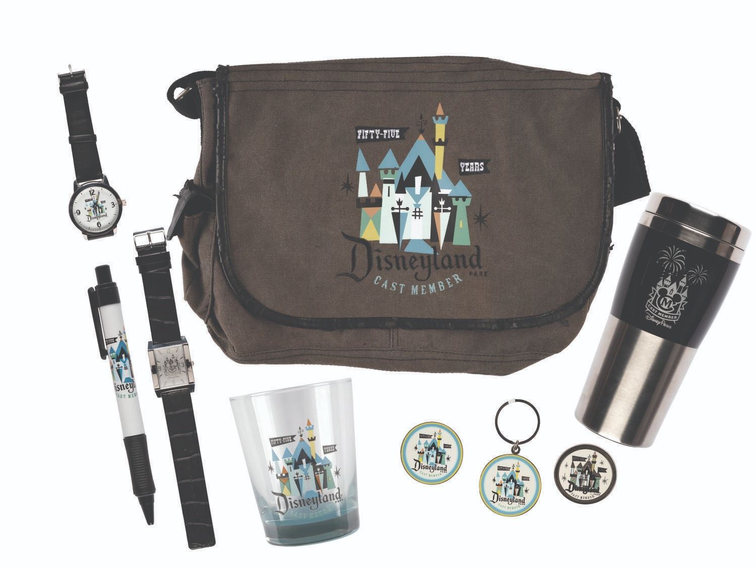 (Disneyland, 2010) A collection of Disneyland 55th Anniversary exclusive Cast Member merchandise. Among this 9-piece collection are (2) wristwatches, a pen, a Cast Exclusive pin, decorative magnet, keyring with fob, a coffee cup, rocks glass, and messenger bag. Measuring various sizes, the items range from fine to good condition, within a 15"x10" canvas bag. The coffee cup, and bag exhibit wear to some of their elements from use.