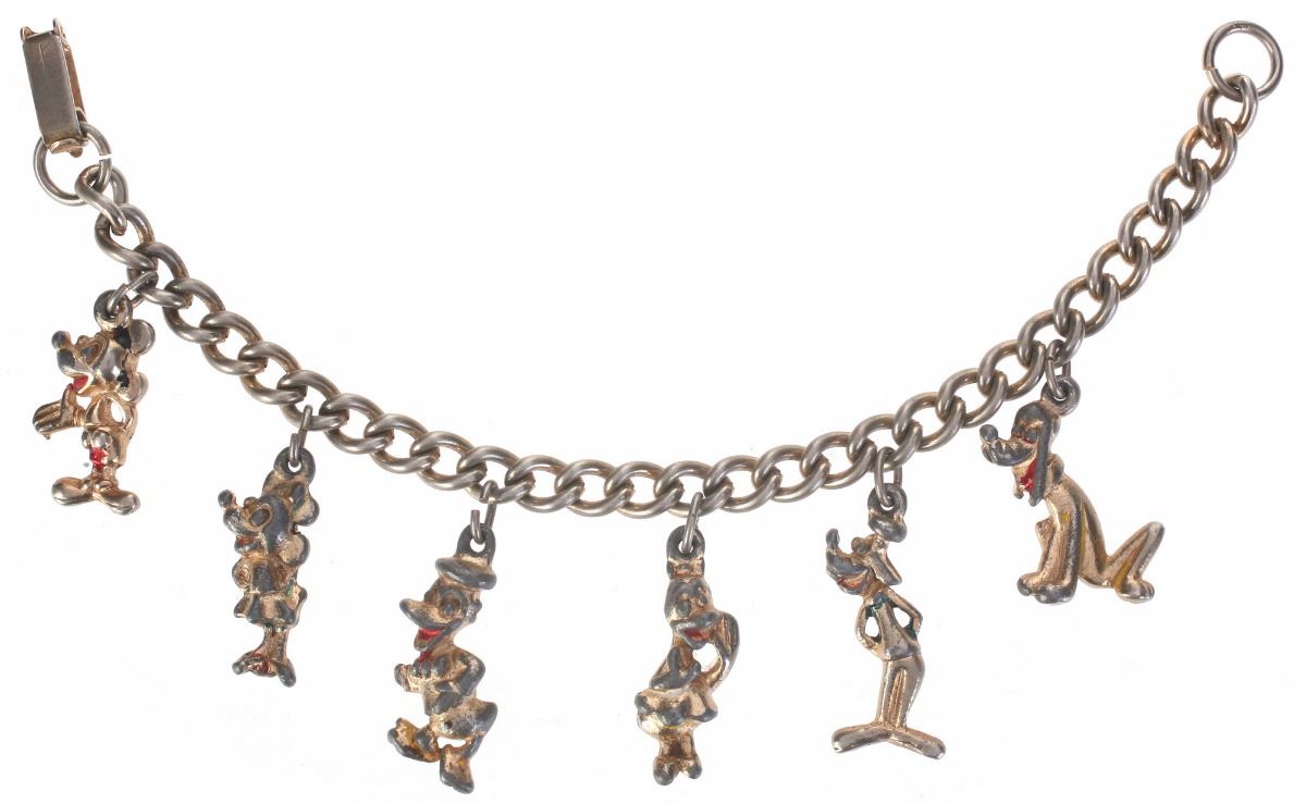 (Disneyland, 1950s) Charm bracelet featuring (6) Disney character charms. Chain measures 6" long. In good condition; color has mostly worn off from the metal charms.