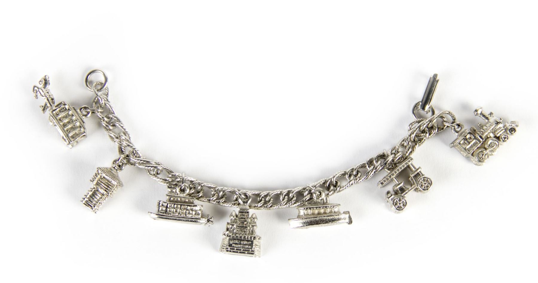 (Disneyland, 1960s) A charm bracelet featuring seven Disneyland attraction-themed charms. The chain measures 6.5" long and the bracelet is in very good condition.