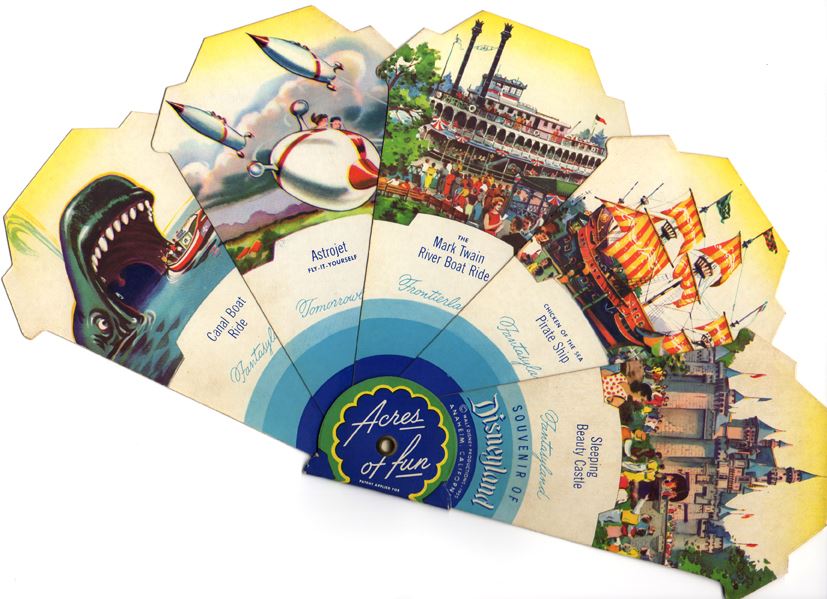 A stunning piece of ephemera from the early days of the park. These folding fans were sold at the many souvenir kiosks throughout Disneyland in 1956. Lovingly illustrated on both sides with various attractions. Yet another example of the pride and care Disney put into the promotion of the park through ephemera.
