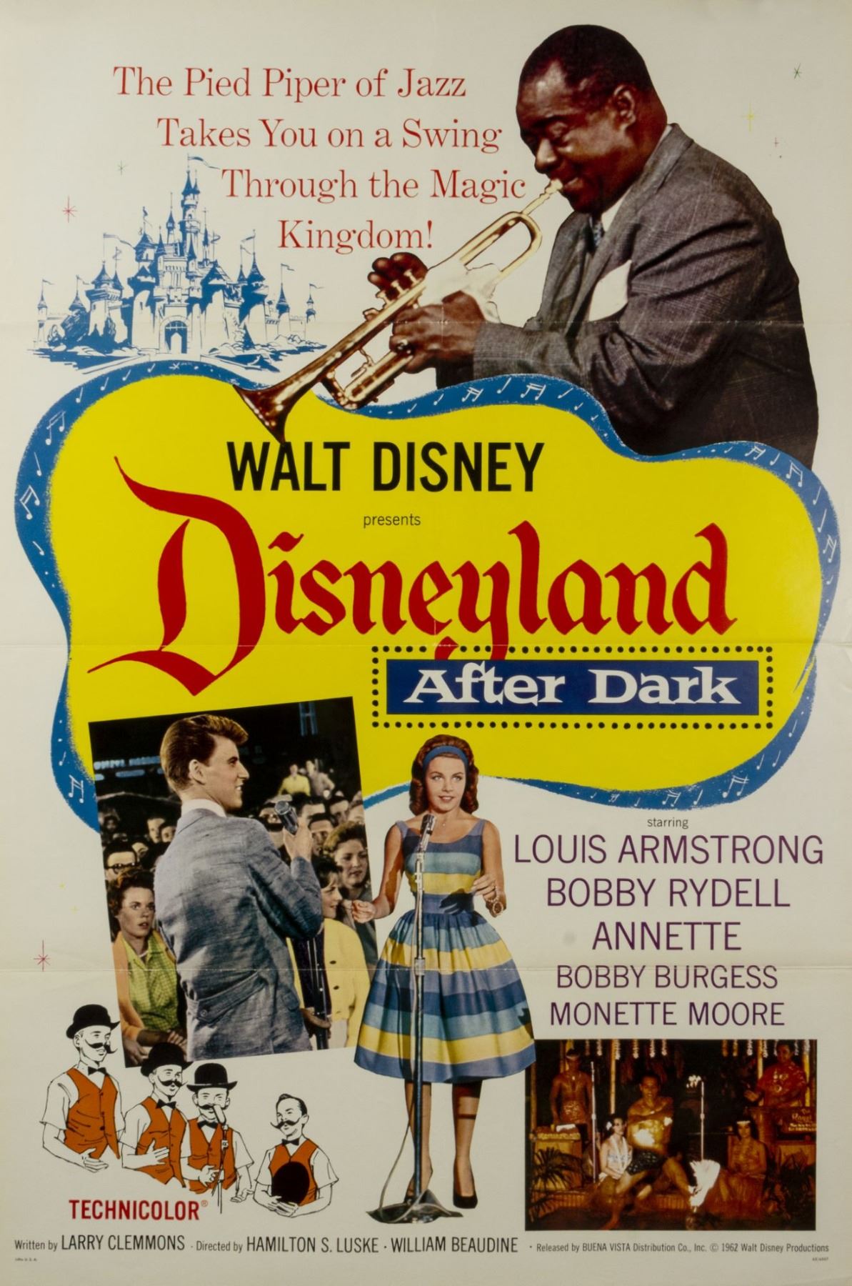 (Disneyland, c.1962) An original one sheet theatrical release poster for Disneyland After Dark, a promotional featurette starring Annette Funicello, Walt Disney, Louis Armstrong, and The Osmonds. The film focuses on many of these musicians performing at various locations within the park, and offers a rare look at the popular musical events during Disneyland's early years. The poster measures 41"x27" and is in good overall condition, with some wear to the original fold-lines. A few small areas on the back of the poster have been reinforced with tape.