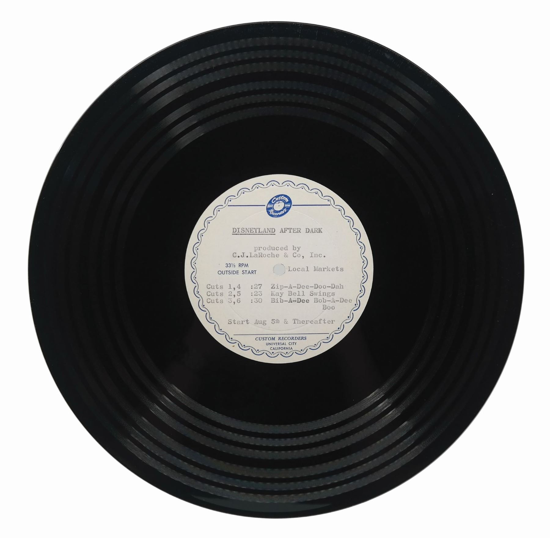 (Disneyland, 1962) A very rare 33 1/3 rpm promotional record for the theatrical release of Disneyland After Dark. This special promotional record has the production information listed on the label, and the songs on this single-sided record include Zip-A-Dee-Doo-Dah, Kay Bell Swings, and Bib-A-Dee Bob-A-Dee-Boo. Measuring 12" in diameter, the record comes in a white paper sleeve and is in very good condition with minor wear.