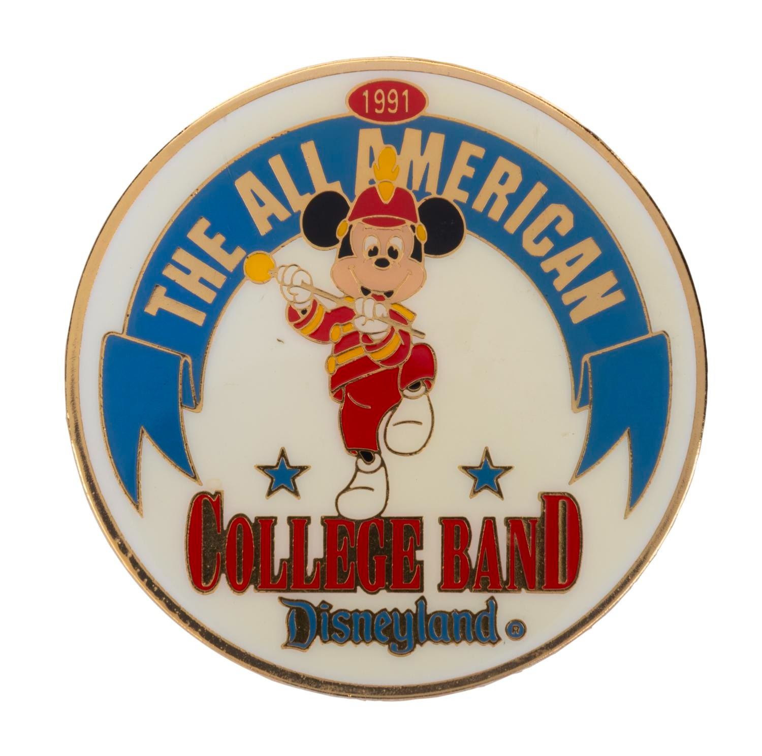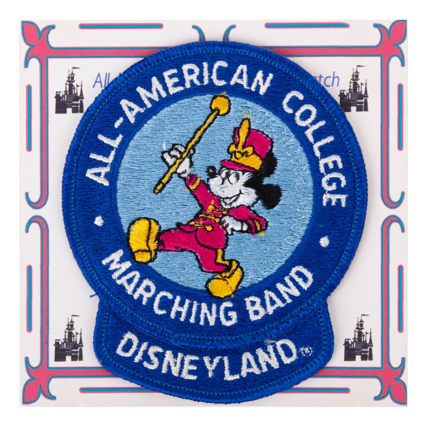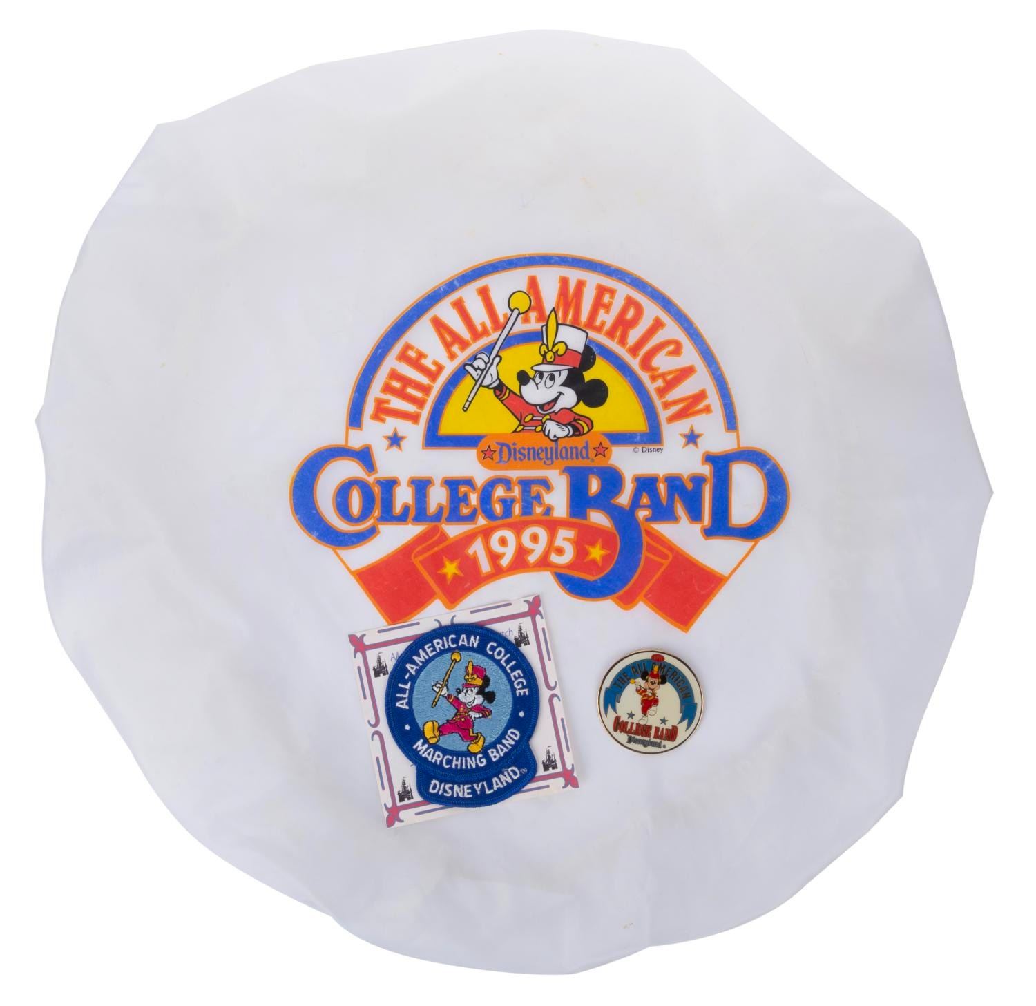 (Disneyland, 1990s) A collection of Disneyland All-American College Marching Band souvenirs. The All-American College Band was created during 1971, as a summer work program to cast new talented entertainers for Disneyland. Included is a commemorative lanyard medallion, tuba cover, and an embroidered patch gifted to program members. The medallion measures 2.5" in diameter, the patch is 3.5"x4.25", and the tuba cover is 23" in diameter. Each piece is in fine-to-very good condition with minor wear.