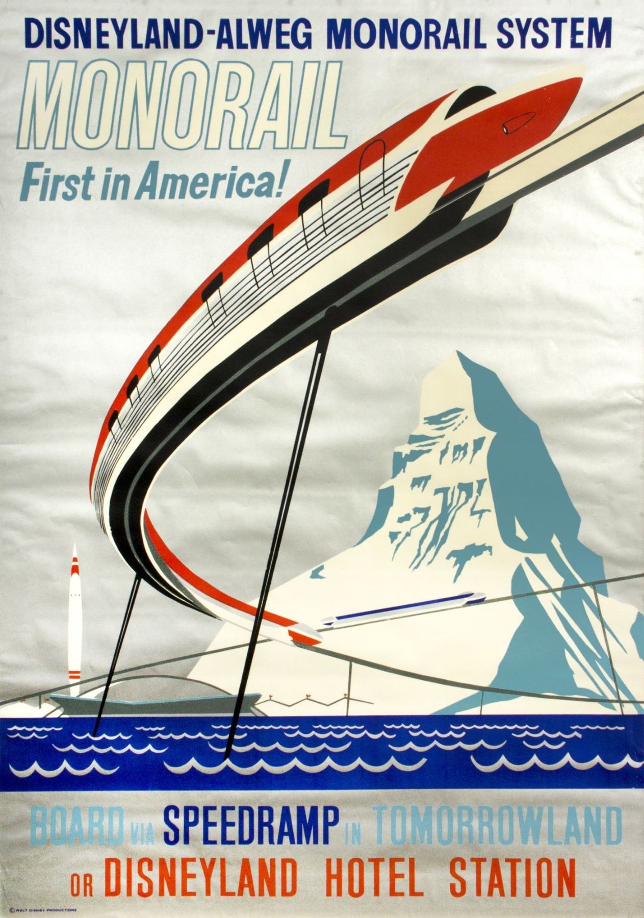 (Disneyland, 1961) A hand-silkscreened poster for the Disneyland-Alweg Monorail. Designed by Paul Hartley, this poster is known for its subtle metallic grey paint that has a shimmer in the right light. Measuring 54"x36", the poster is in good condition with some edge-wear throughout, including spots of darker discoloration along the border. The poster is adhered to a board backing for its preservation.