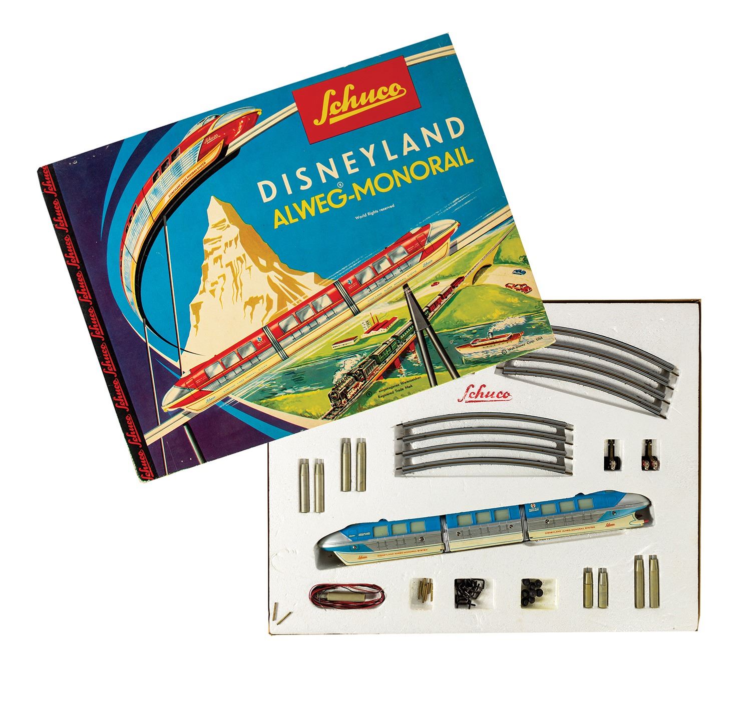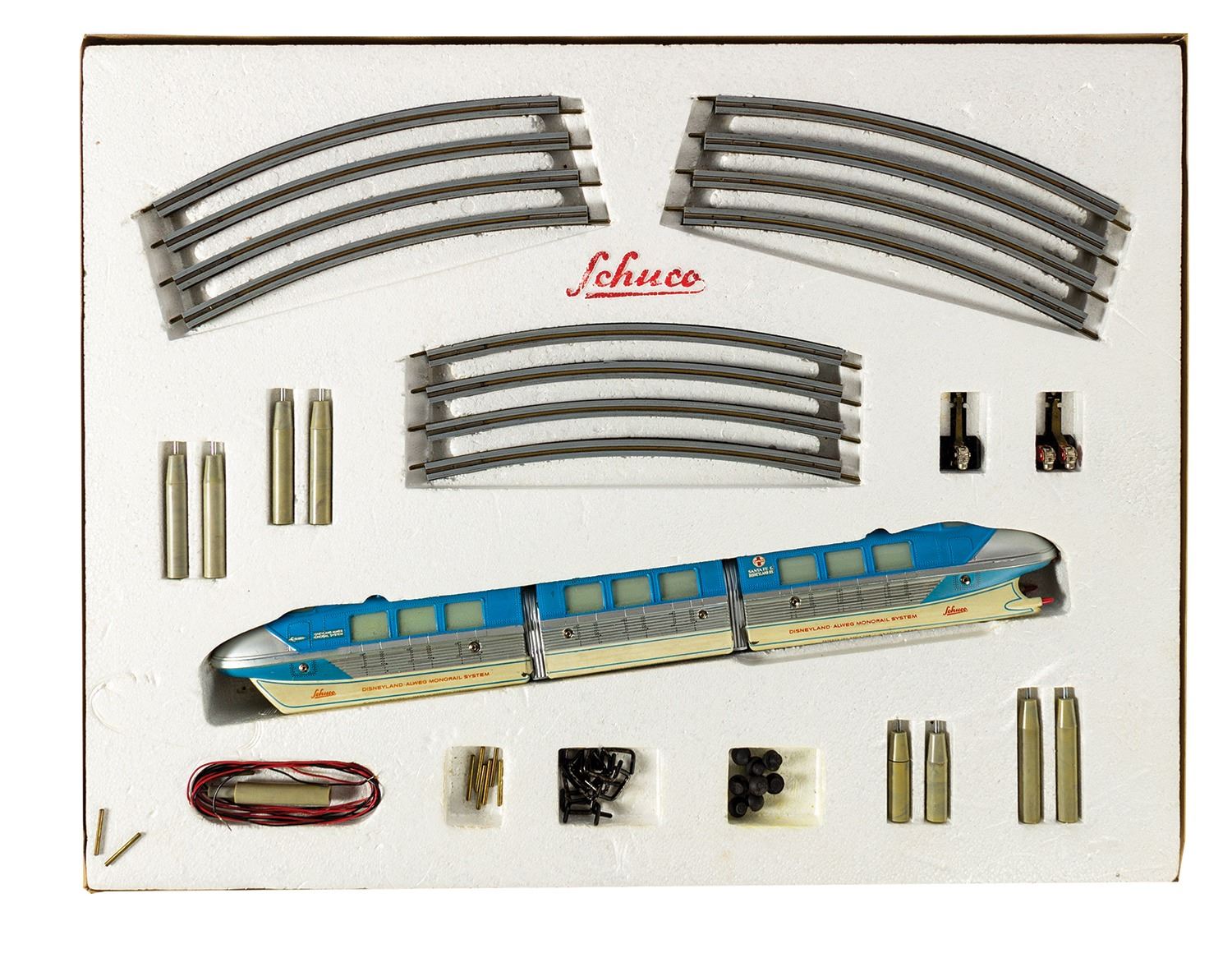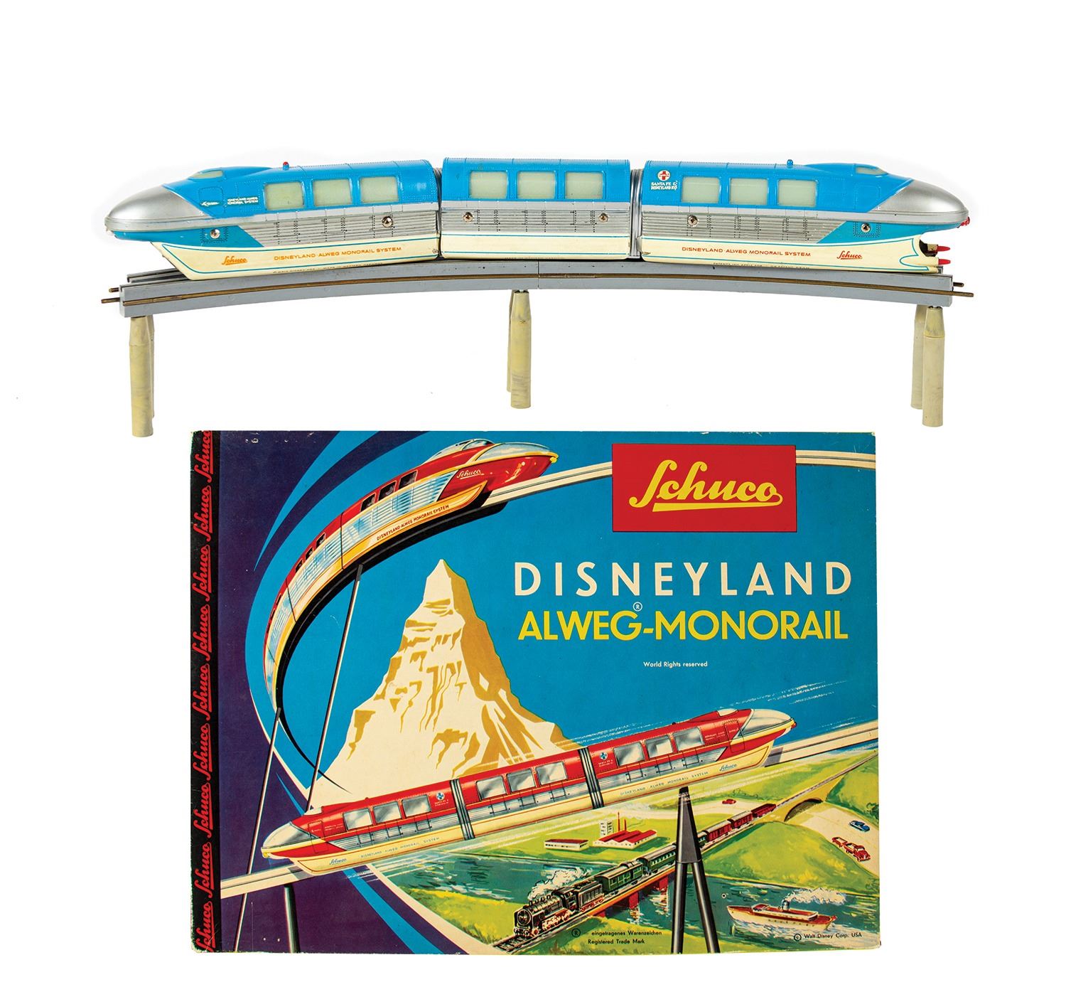 (Disneyland, c.1967) A rare vintage Alweg-Monorail set manufactured by Schuco. The electronic model is a 1:90 scale recreation of Disneyland’s Monorail and is product number 6333. The set is complete in its original cardboard box packaging with Schuco branded compartmentalized Styrofoam insert. It includes the original German and English language instruction manuals, D/C power warning, and accessory piece order form. Additionally, the set includes a box of many additional track and accessory components. The monorail measures 14.25” long and the box is 14.5”x19” and 1.75” deep. The model is in good to very good condition, exhibiting some use and wear. The electronics are untested. The packaging is in very good condition, exhibiting some split corners repaired with transparent tape and edge wear, though the colors remain remarkably vibrant.