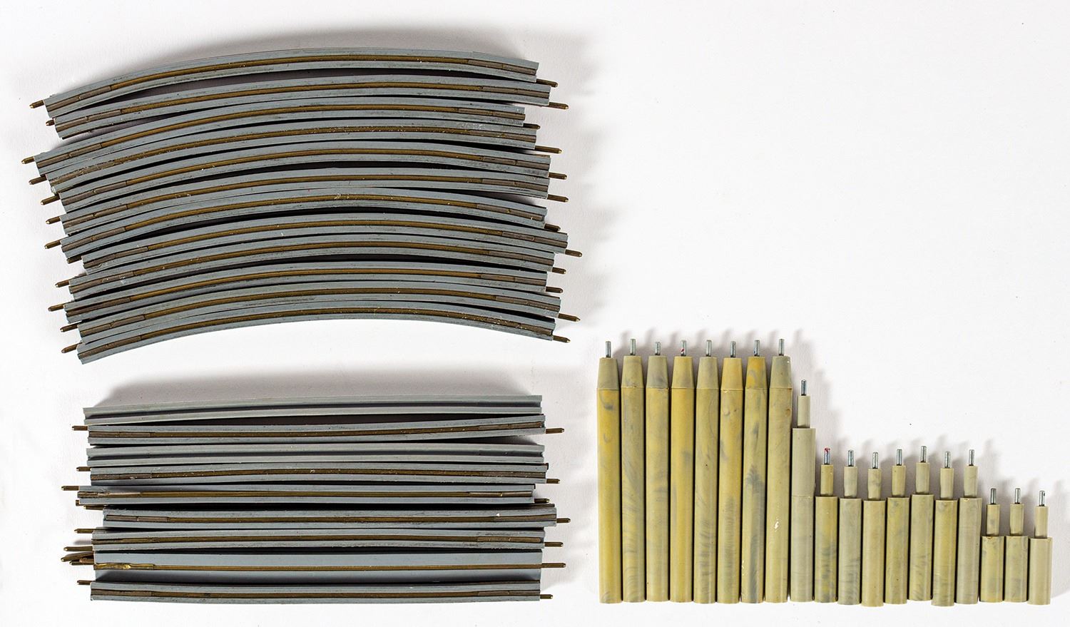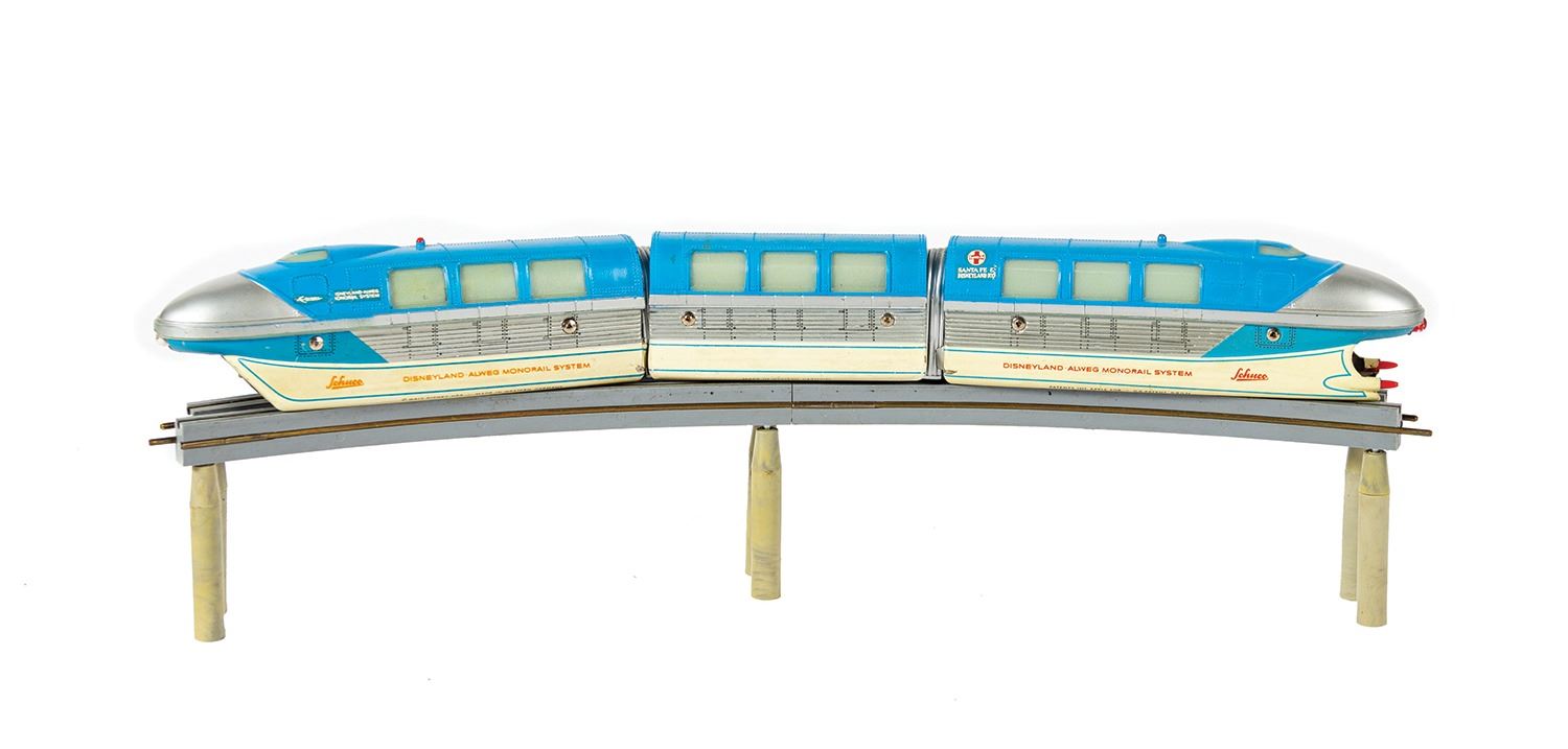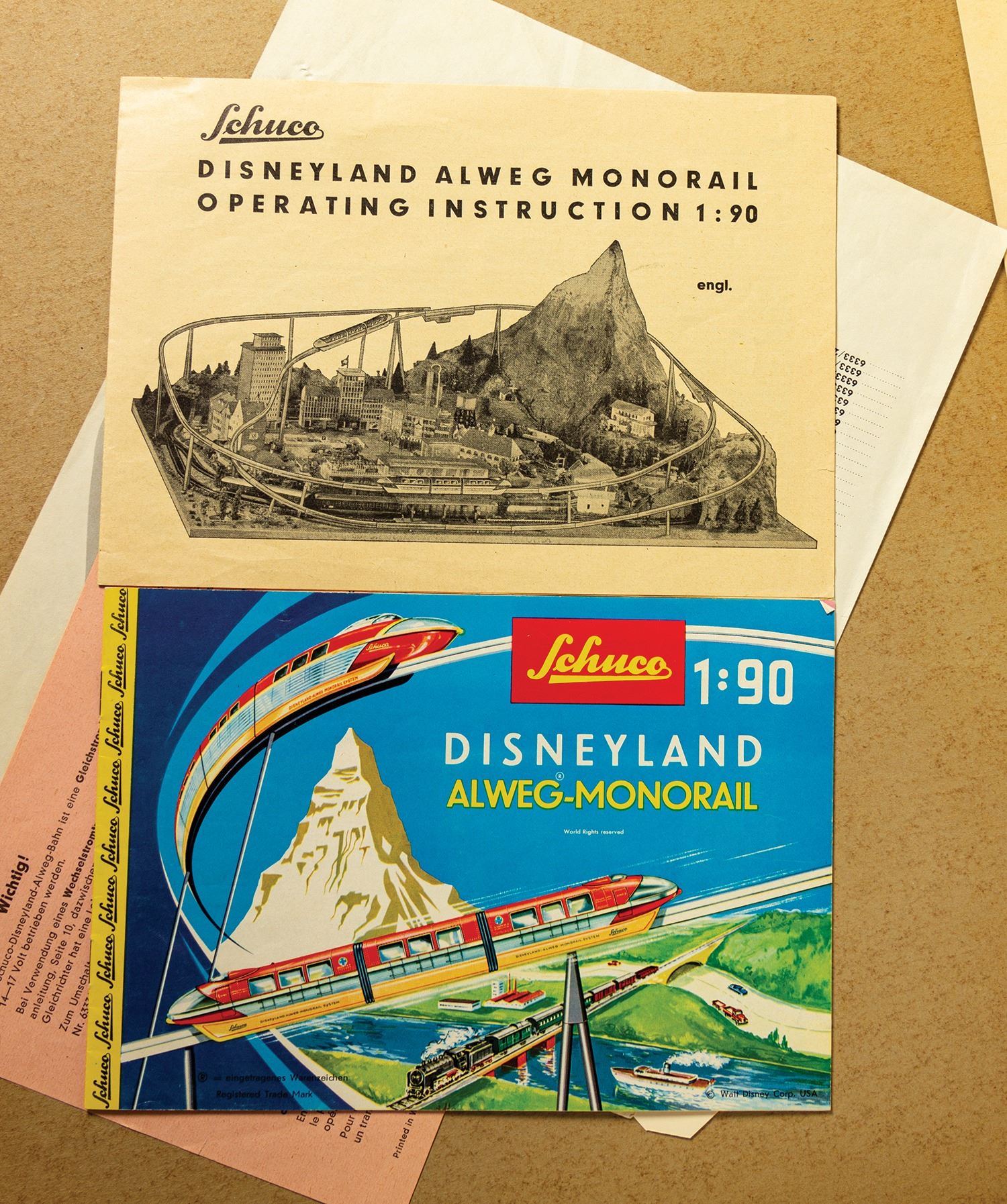(Disneyland, c.1967) A rare vintage Alweg-Monorail set manufactured by Schuco. The electronic model is a 1:90 scale recreation of Disneyland’s Monorail and is product number 6333. The set is complete in its original cardboard box packaging with Schuco branded compartmentalized Styrofoam insert. It includes the original German and English language instruction manuals, D/C power warning, and accessory piece order form. Additionally, the set includes a box of many additional track and accessory components. The monorail measures 14.25” long and the box is 14.5”x19” and 1.75” deep. The model is in good to very good condition, exhibiting some use and wear. The electronics are untested. The packaging is in very good condition, exhibiting some split corners repaired with transparent tape and edge wear, though the colors remain remarkably vibrant.