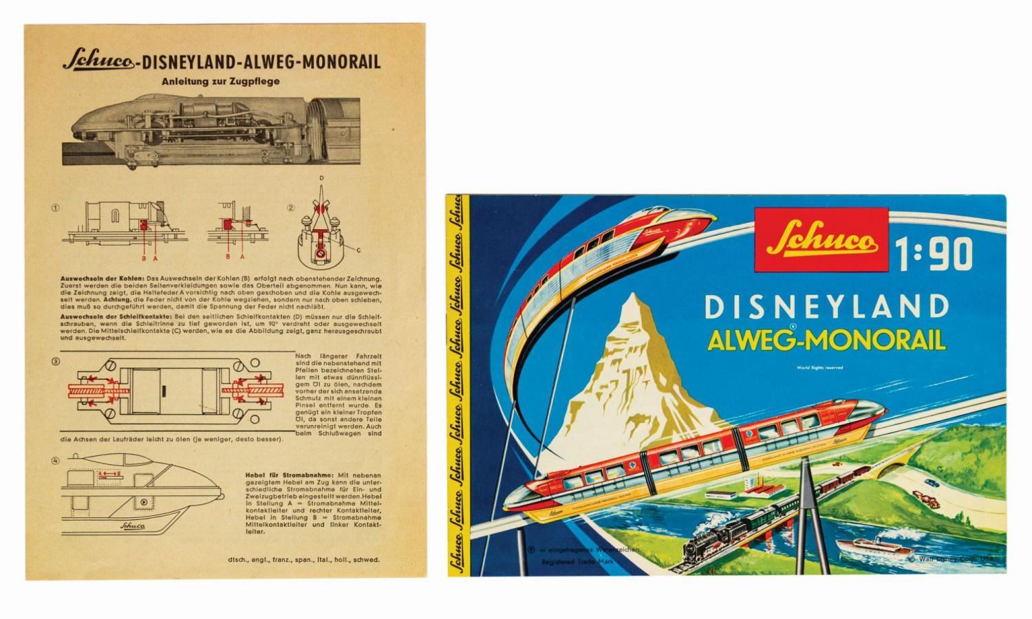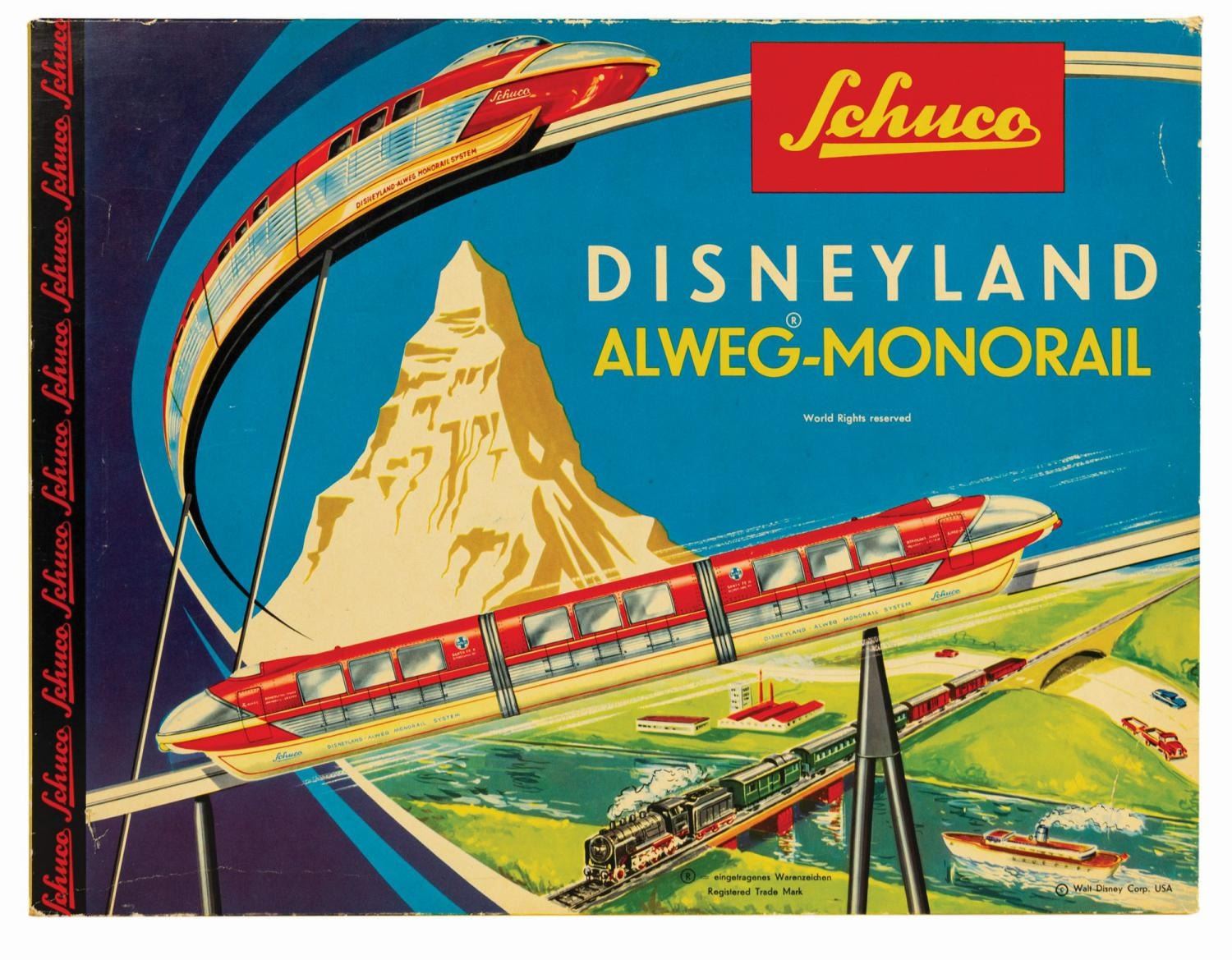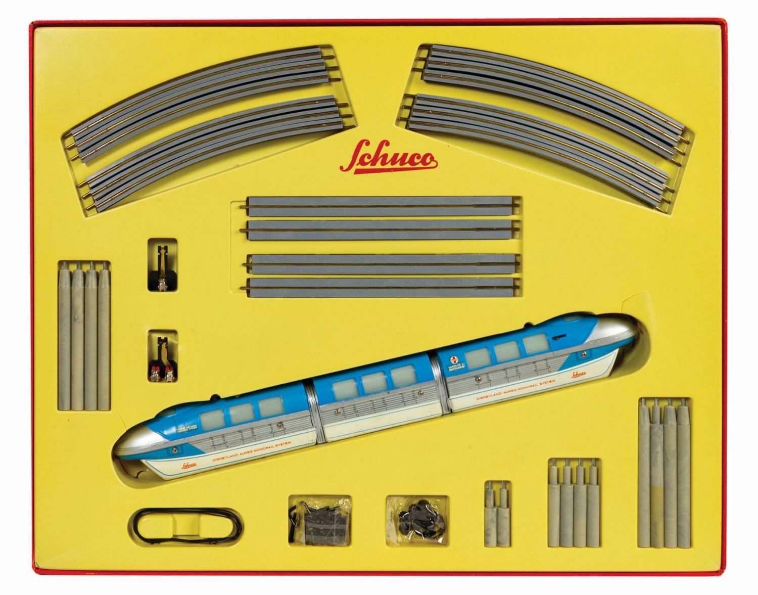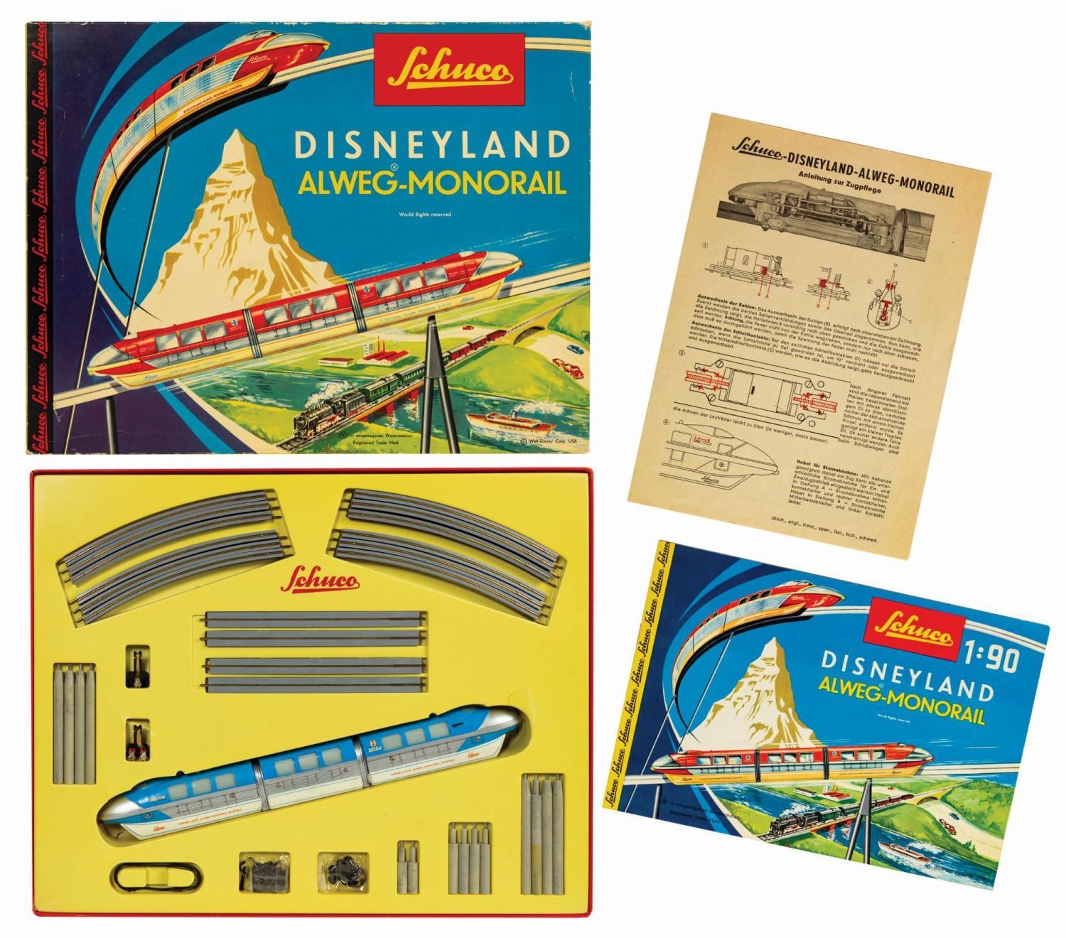 (Disneyland, c.1967) A rare vintage Alweg-Monorail set manufactured by Schuco. The electronic model is a 1:90 scale recreation of Disneyland's Monorail and comes in its original box. The set is almost complete, but is missing the red wire, and one of the 80mm support pillars has been replaced by two joined 40mm pillars, and lacks its conical end piece. The monorail measures 14.5" long and the box is 14.5"x18.75" and 1.75" deep. The model is in good condition, exhibiting some use and wear, including spots of paint wear. The electronics are untested. There are a few repaired splits to the box.