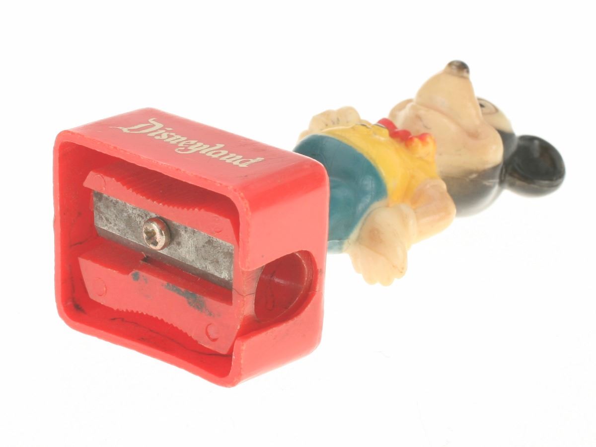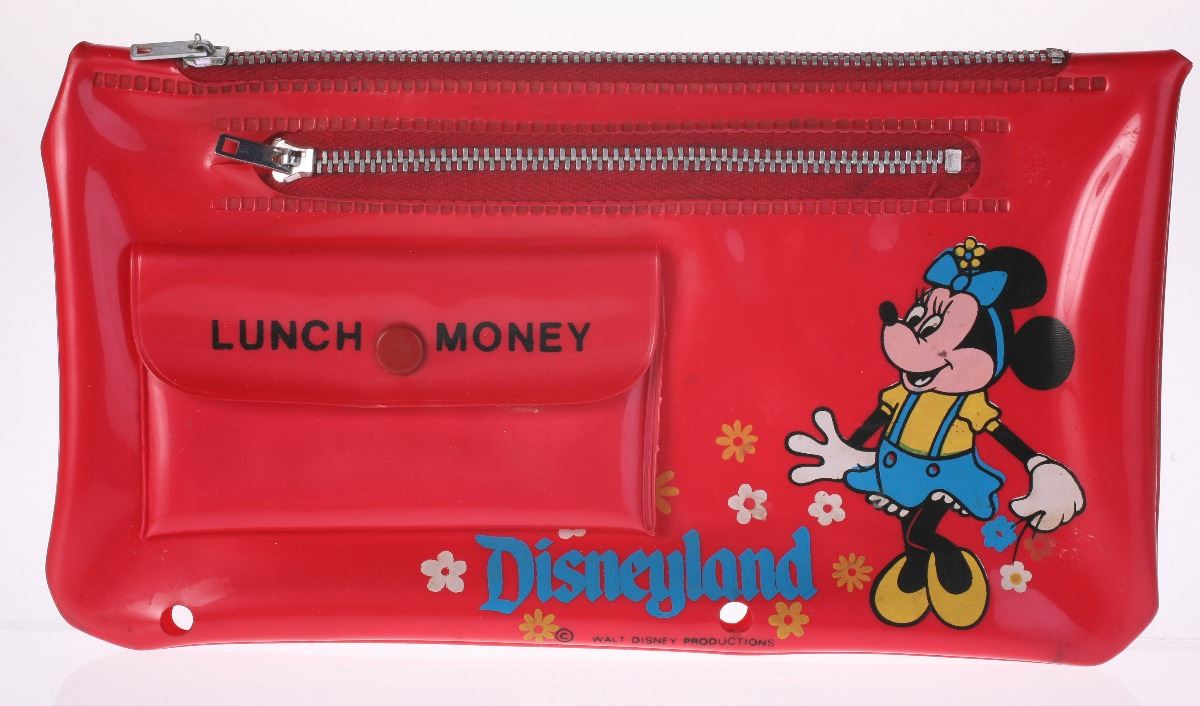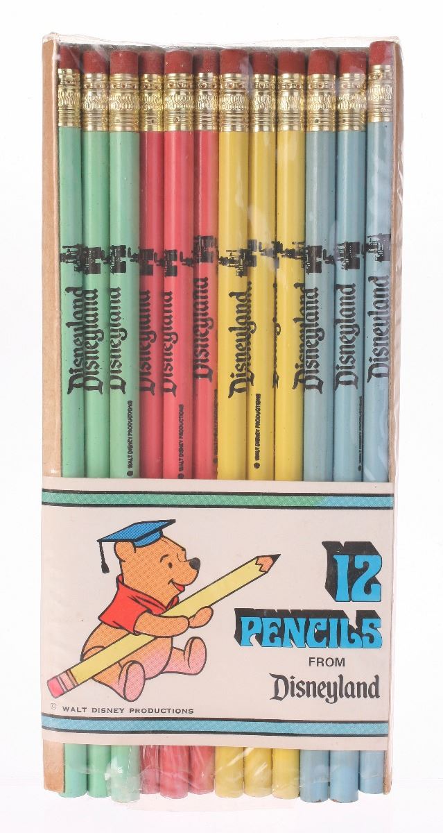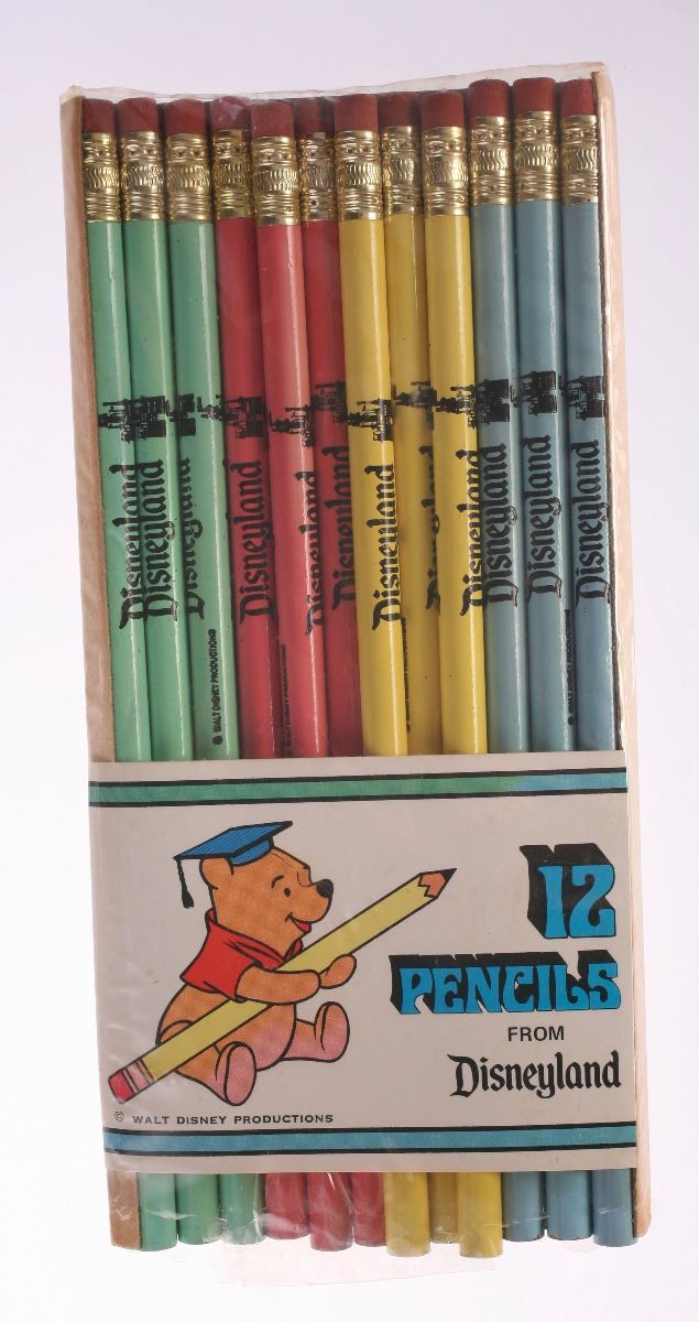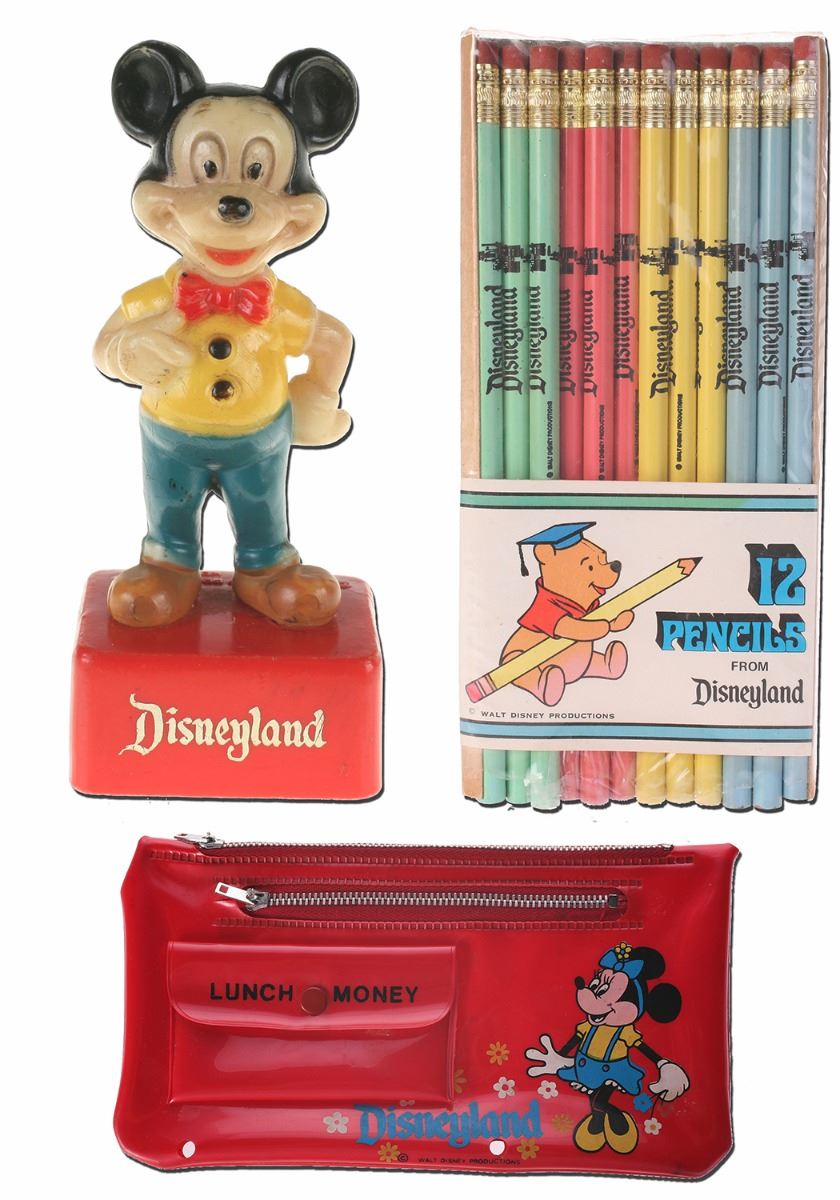 (Disneyland, 1950s-60s) Includes (1) red vinyl pencil pouch with Minnie Mouse on the front, (1) Mickey pencil sharpener, and (1) package of "12 pencils from Disneyland" with Winnie the Pooh label. Set is in good condition with minor wear.