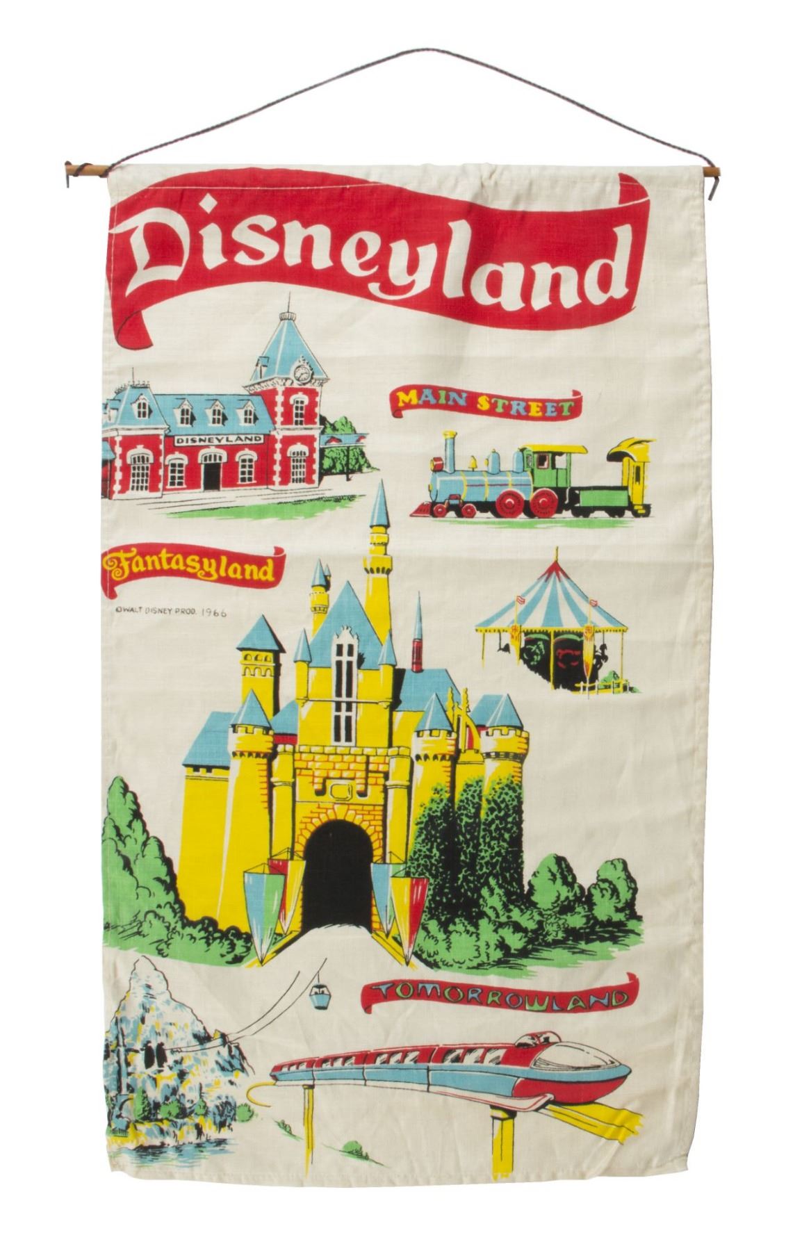 (Disneyland, 1966) A beautiful hanging tapestry featuring several of Disneyland iconic attractions. The fabric tapestry uses red, yellow, green, and blue, to depict attractions including the "Disneyland Railroad", "King Arthur Carrousel", "Sleeping Beauty Castle", "Skyway", and "Monorail". Across the top, the title "Disneyland" appears below the wooden dowel used for hanging the tapestry. Measuring 28"x16", the tapestry is in good condition with some yellowing from age.