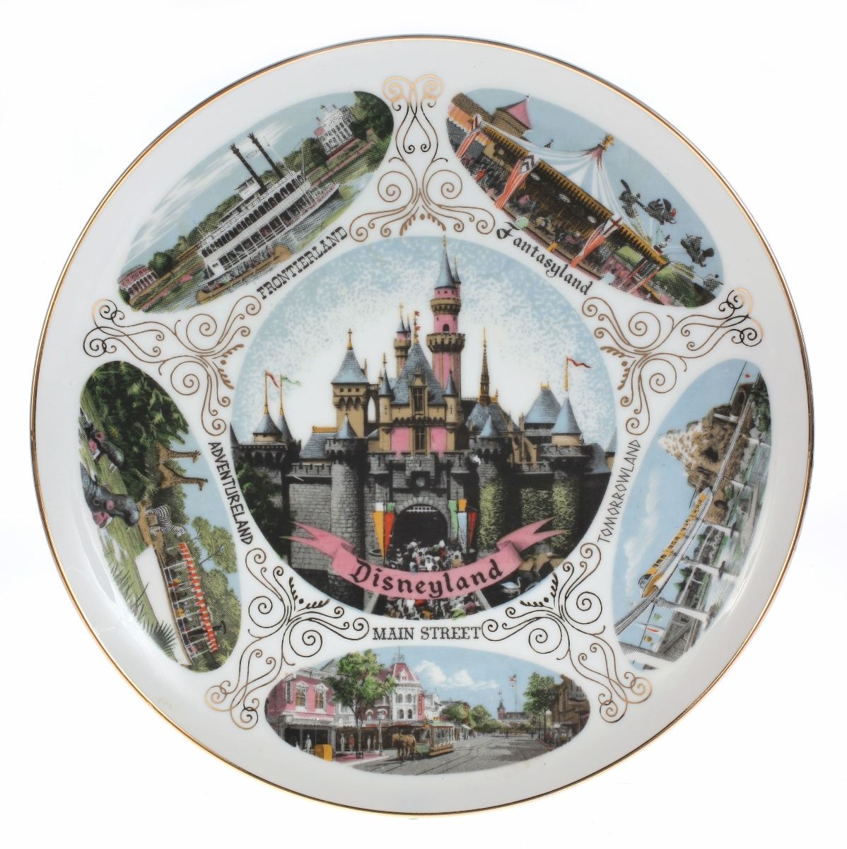 (Disneyland, 1950s) Color-illustrated hanging Disneyland plate featuring artwork of the different lands on the surface. Comes with string attached to the back for hanging the plate. Measures 9.5" in diameter and 1" tall. In good condition with minimal wear.
