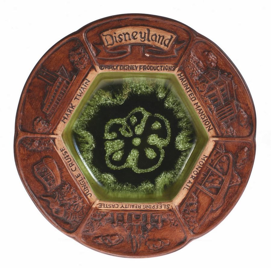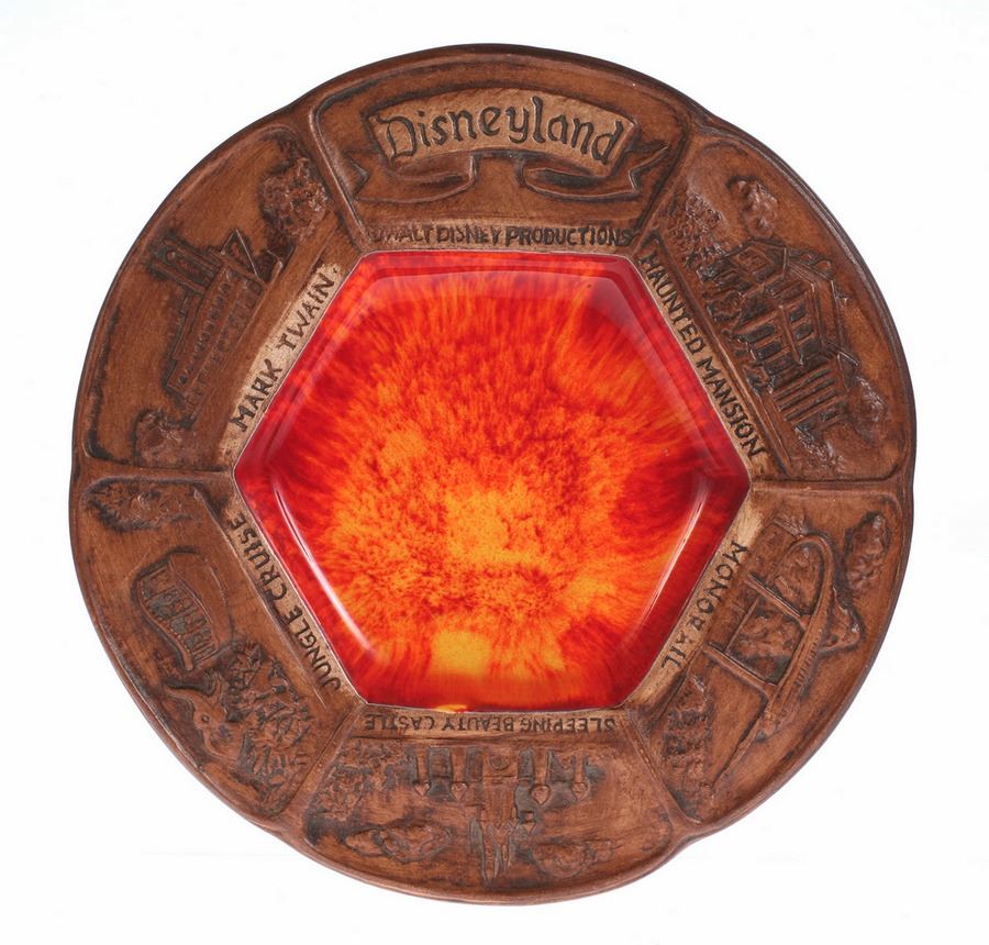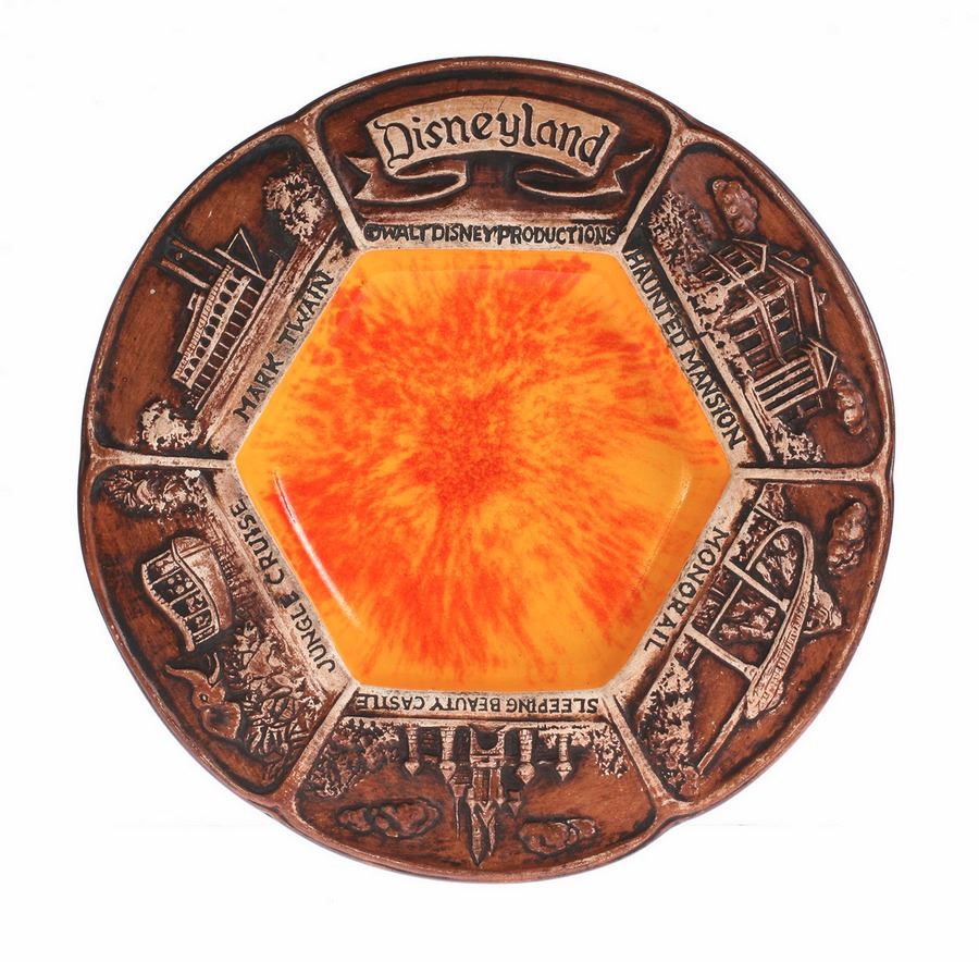 (Disneyland, 1970s) Disneyland attractions plate set including (3) ceramic plates featuring popular attractions from the park. Created by Treasure Craft Pottery, the plates measure 7.75" in diameter and 1" tall, each. Set is in good condition.