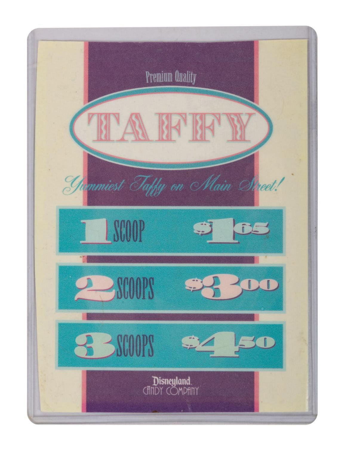 (Disneyland, c.1990s) A Park-used Disneyland Candy Company taffy scoop price list. The popular confectionary treat has been manufactured at Disneyland since the second fabulous decade of operation. The sign advertises the "yummiest taffy on Main Street" and the prices for Premium Quality Taffy Scoops. Measuring 6.75"x5", the laminated Park-used sign is in very good condition with minor wear.
