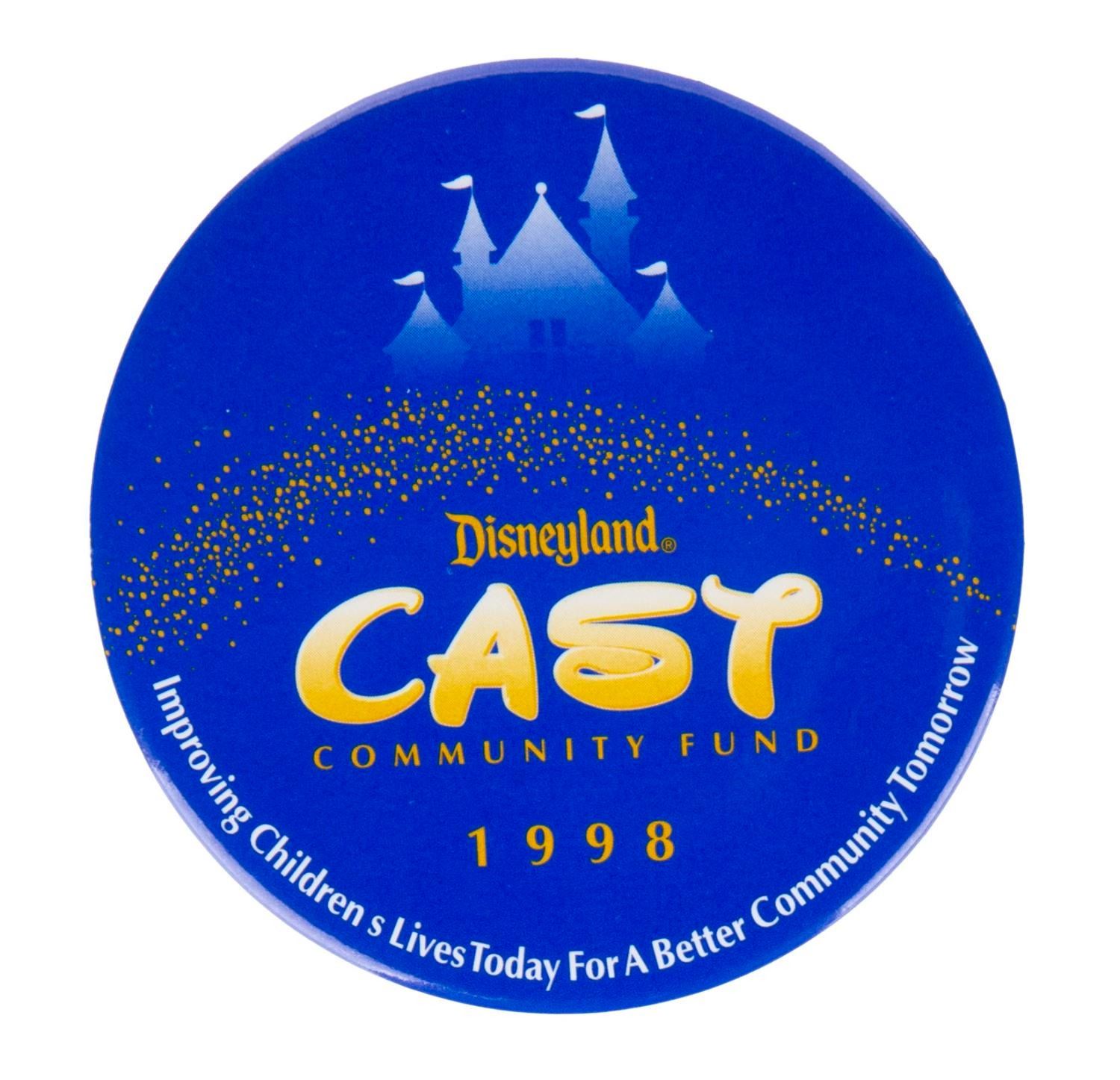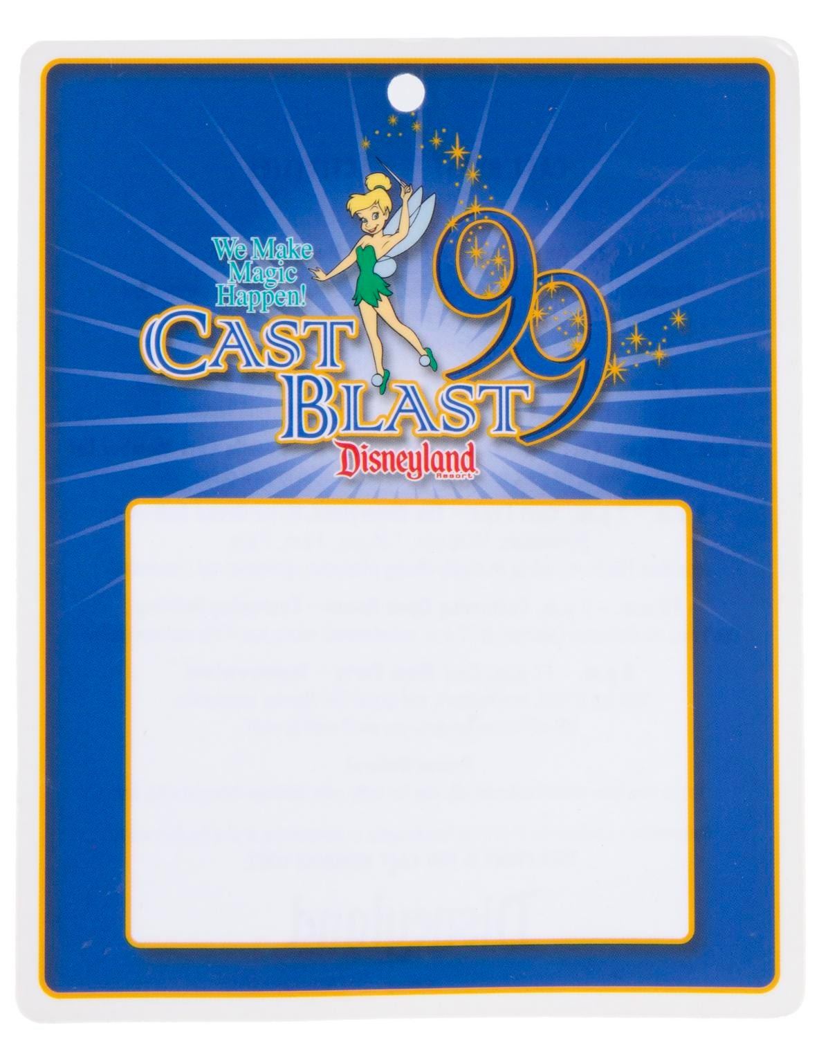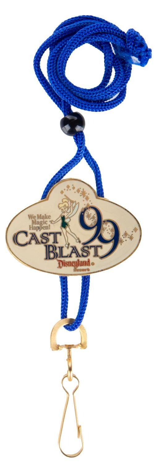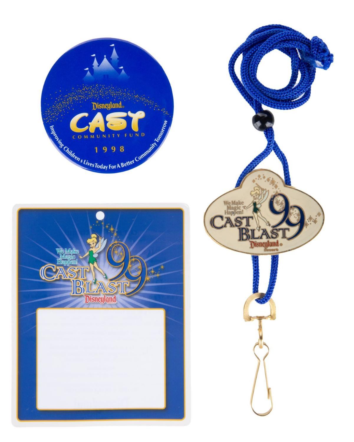 (Disneyland, 1998/99) A Disneyland Cast Community Fund pinback button and two Cast Blast event souvenirs. The button, lanyard with charm, and name tag card were given to attendees. The lanyard measures 18" long, the button 3" in diameter, and the card 4" x 5". Each piece is in very good condition exhibiting faint scuffs and wear.