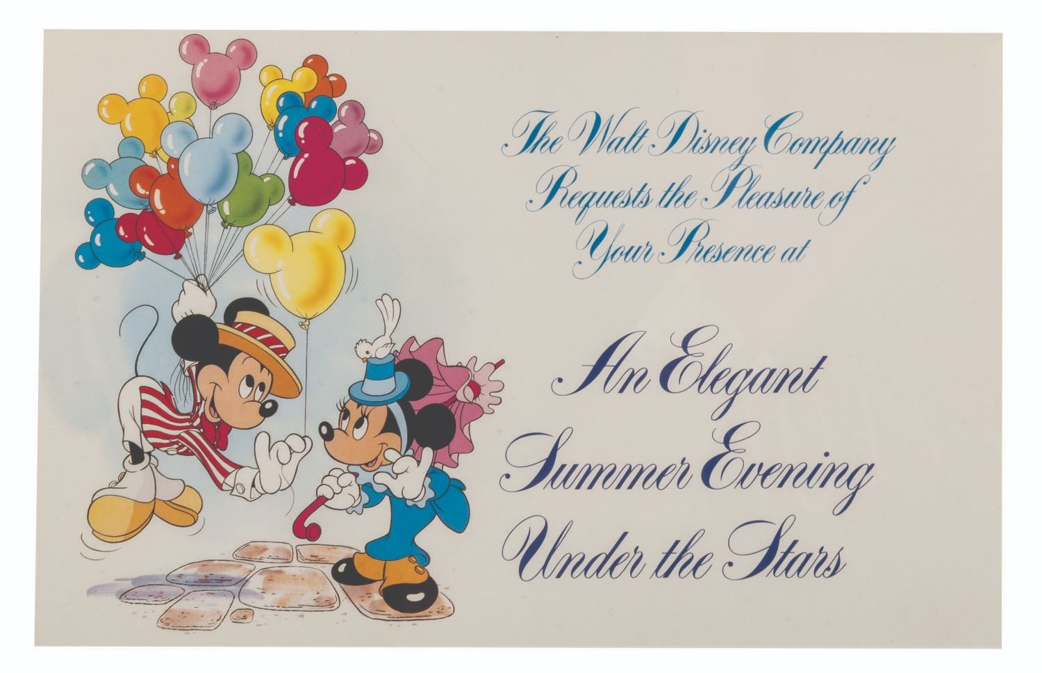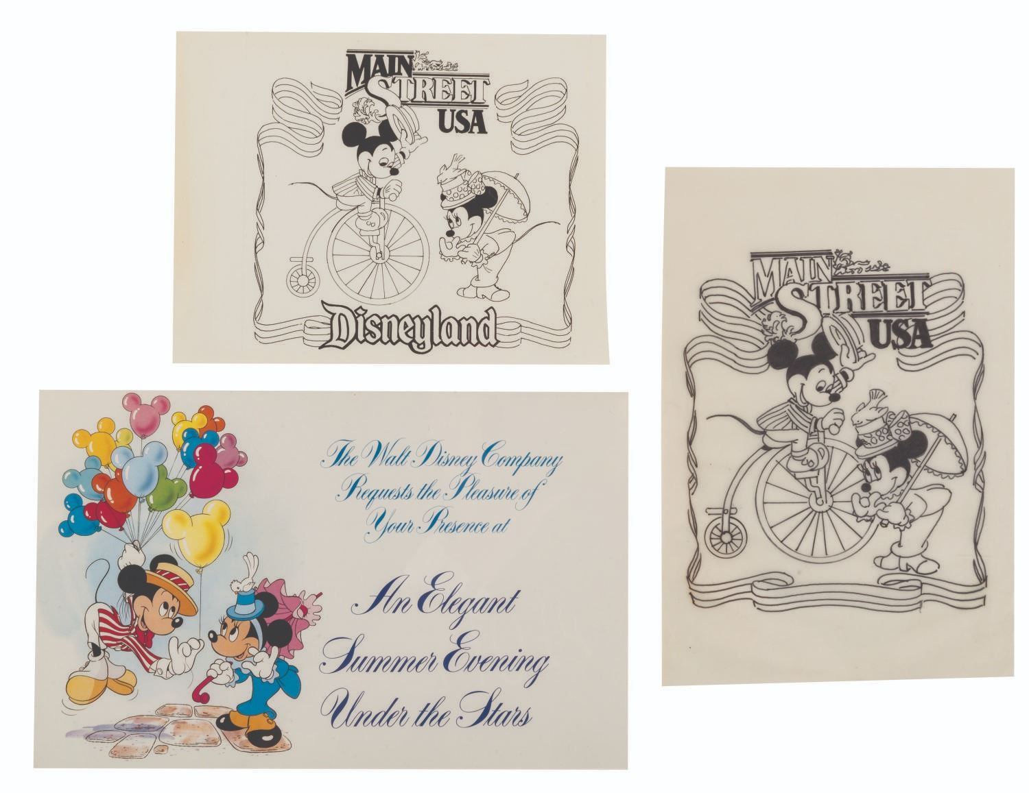 (Disneyland, 1988) Two pieces of concept art and the final card for An Elegant Summer Evening Under the Stars, a Cast Member appreciation event. Ranging in size from 5.25" x 6.75" to 6" x 9.25", the card and concepts are in very good condition with light creases, edge wear, and discoloration from age.