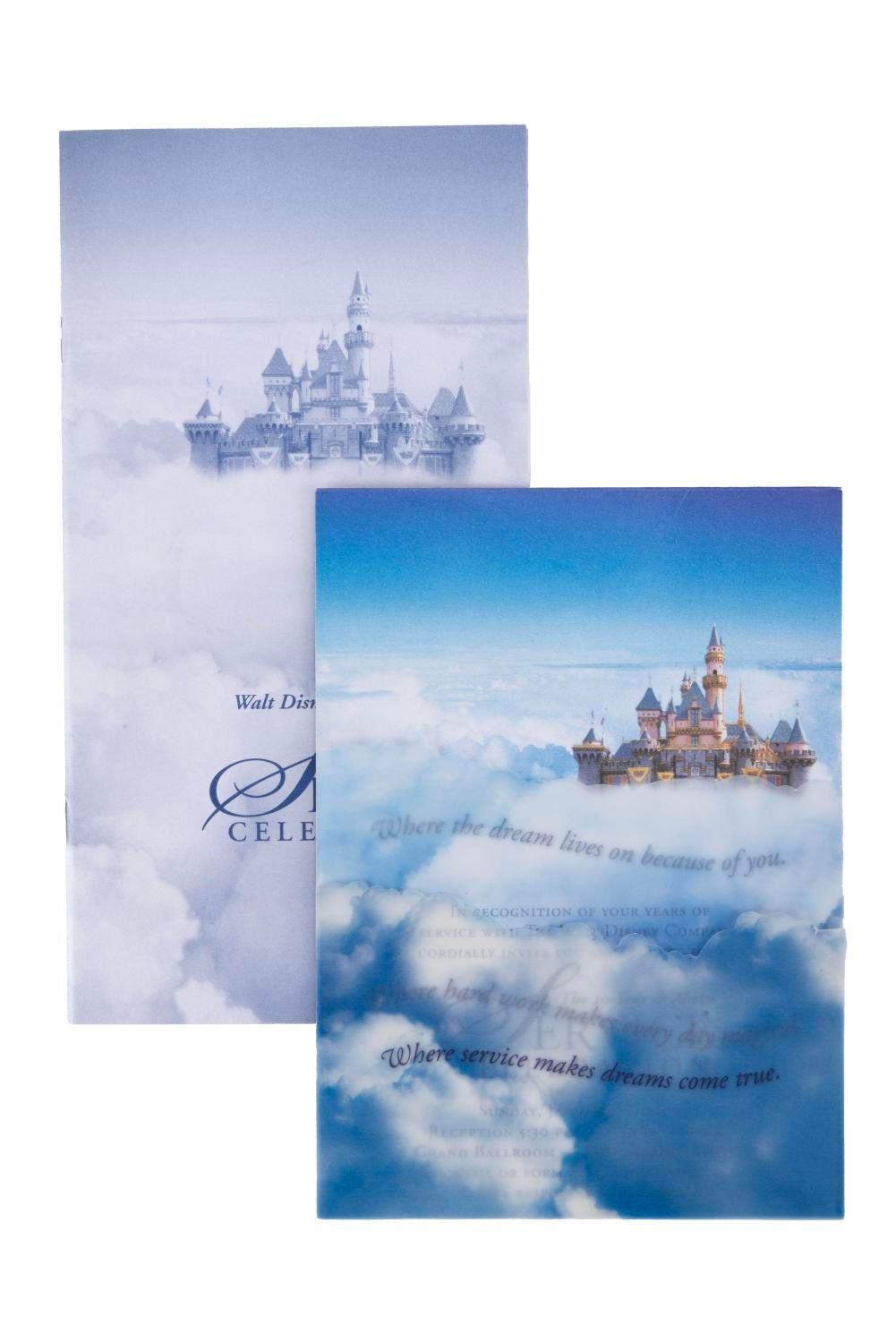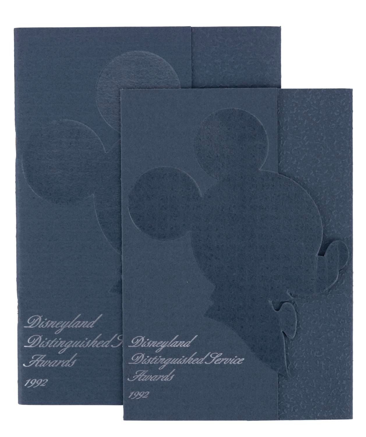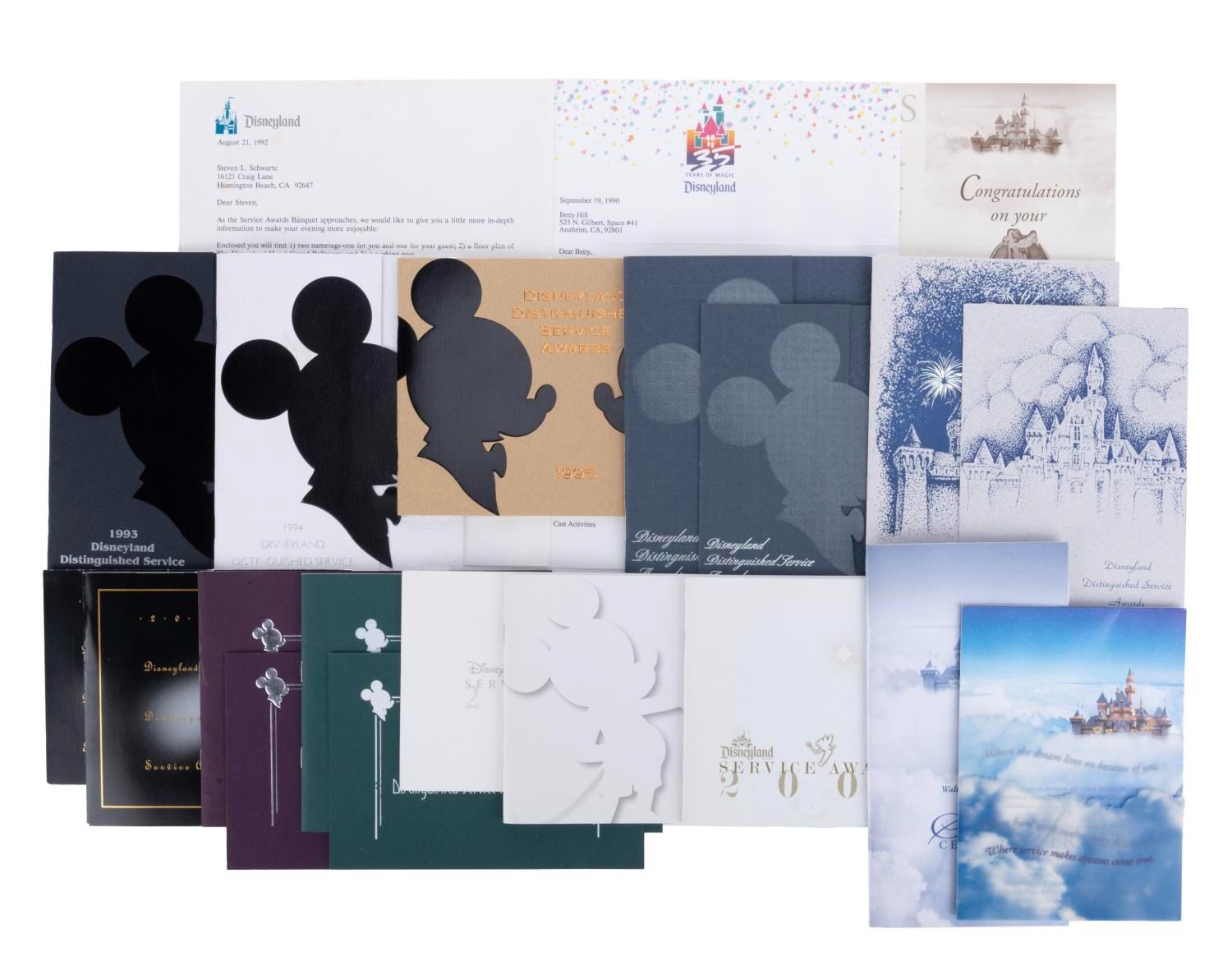 (Disneyland, 1990-2007) A collection of 31 Disneyland Cast Member Service Awards souvenirs including place cards, programs, invitations, and more, spanning 17 years of Disneyland Resort banquets honoring employee anniversaries and distinguished service. Measuring 2.75" x 2.25" to 8.5" x 11", each piece is in very good to fine condition, some exhibiting minor creases or wear.