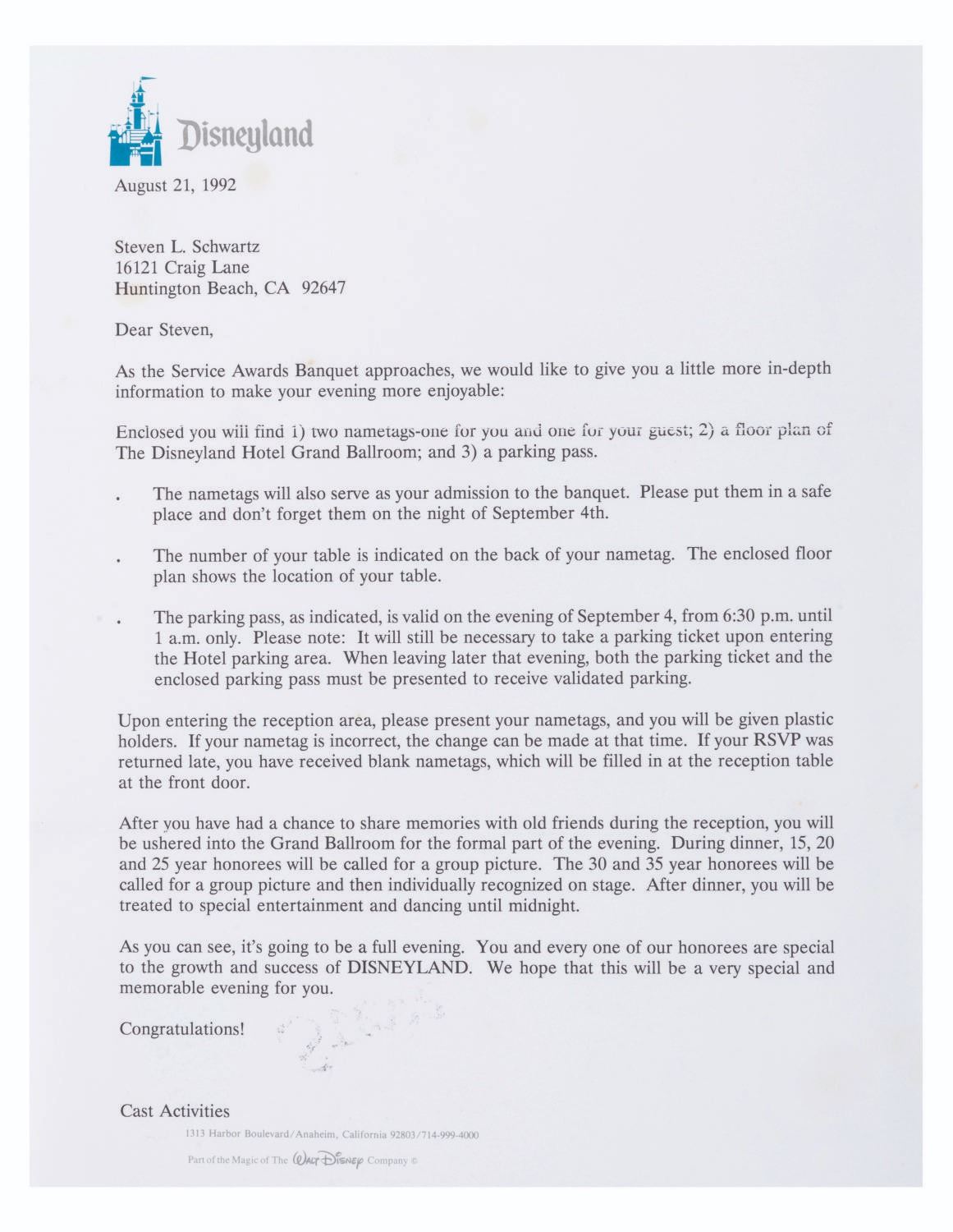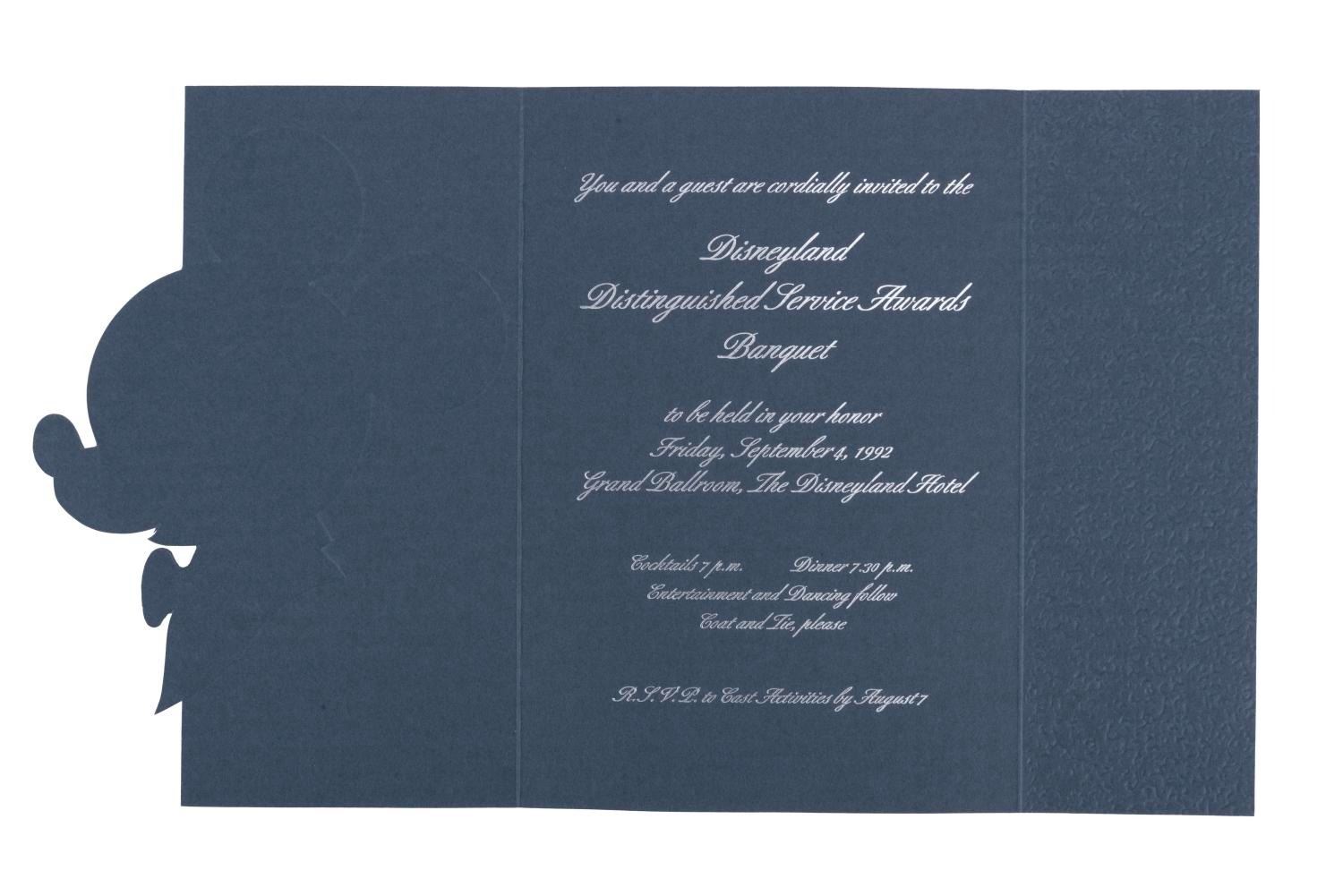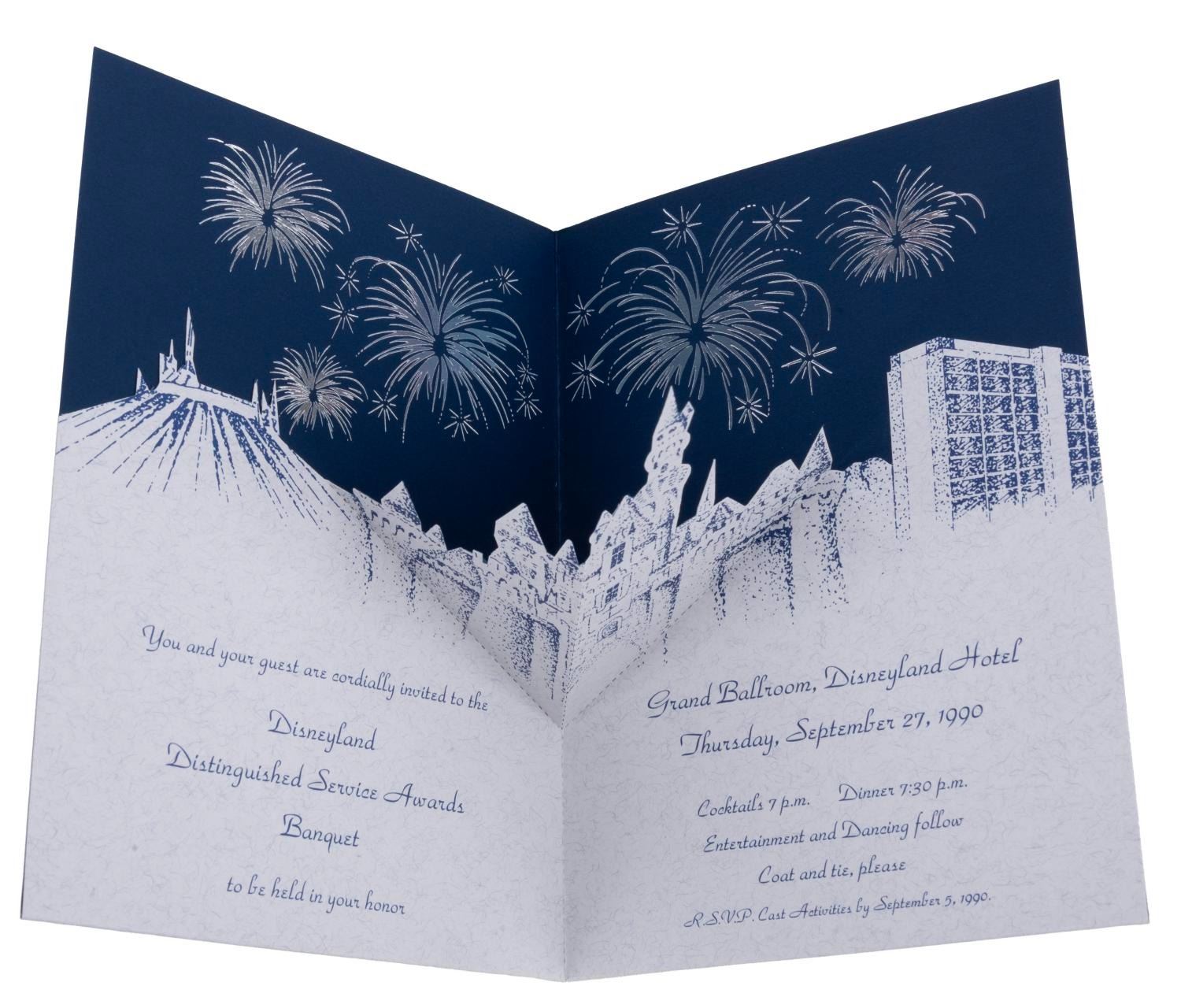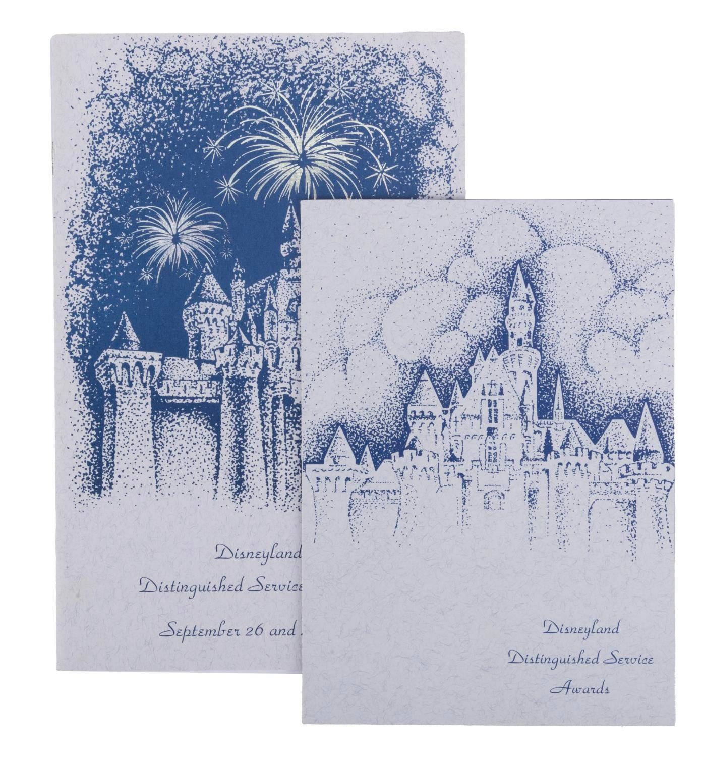 (Disneyland, 1990-2007) A collection of 31 Disneyland Cast Member Service Awards souvenirs including place cards, programs, invitations, and more, spanning 17 years of Disneyland Resort banquets honoring employee anniversaries and distinguished service. Measuring 2.75" x 2.25" to 8.5" x 11", each piece is in very good to fine condition, some exhibiting minor creases or wear.