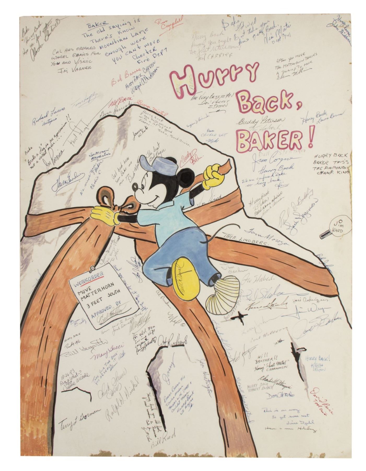 (Disneyland, 1983) A Disneyland cast member "get well soon" card for an employee named "Baker". The card was hand-drawn on artist's board and features a large illustration of Mickey Mouse on the Matterhorn, with the message "Hurry Back, Baker!". The card features the signatures and well-wishes of numerous Disneyland cast members from a wide variety of positions. Measuring 24"x18", the card is in good condition with some wear from age and use including some paper-tearing along the bottom-edge and some tape on the back-side of the card.
