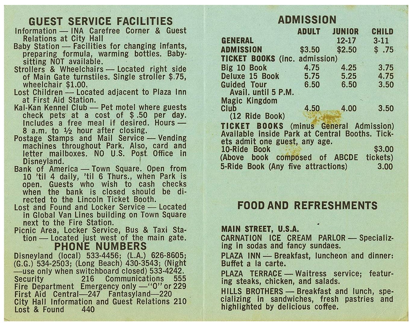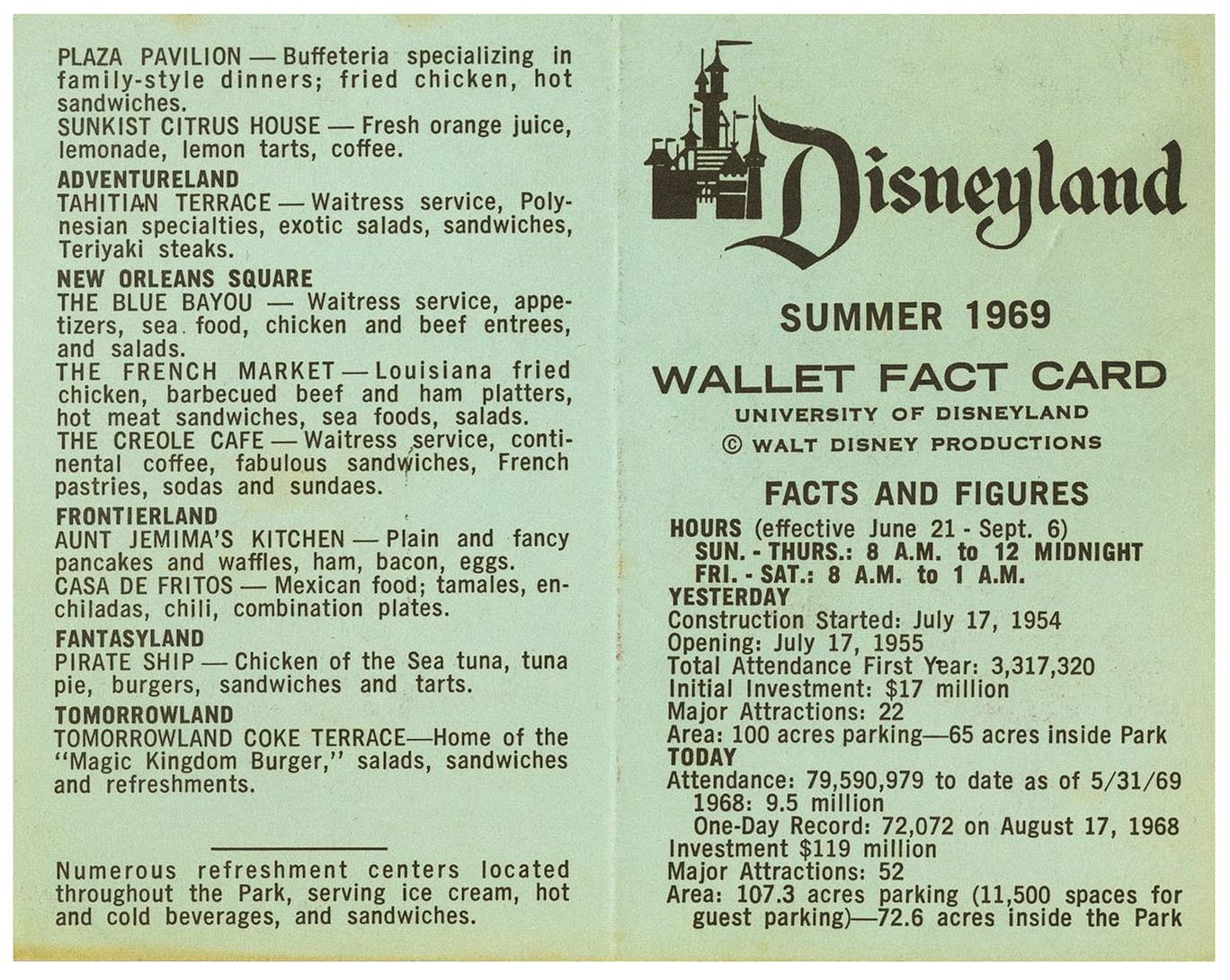 (Disneyland, 1969) A scarce "Wallet Fact Card" created by the University of Disneyland for Disneyland cast members that contains useful information that guests are likely to inquire about. The card lists details on the creation of Disneyland, total attendance up until 1969, and where certain guest service facilities and restaurants are located within the park, among other information. Measuring 3.5"x4.5", the card is in very good condition with minor wear from use.