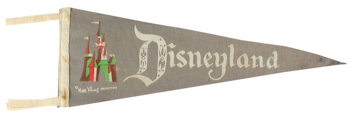 (Disneyland, 1960s) Grey pennant with off-white lettering and imagery of Sleeping Beauty Castle. Measures 8.5"x23.5". In fair displayed condition with a bent tip.
