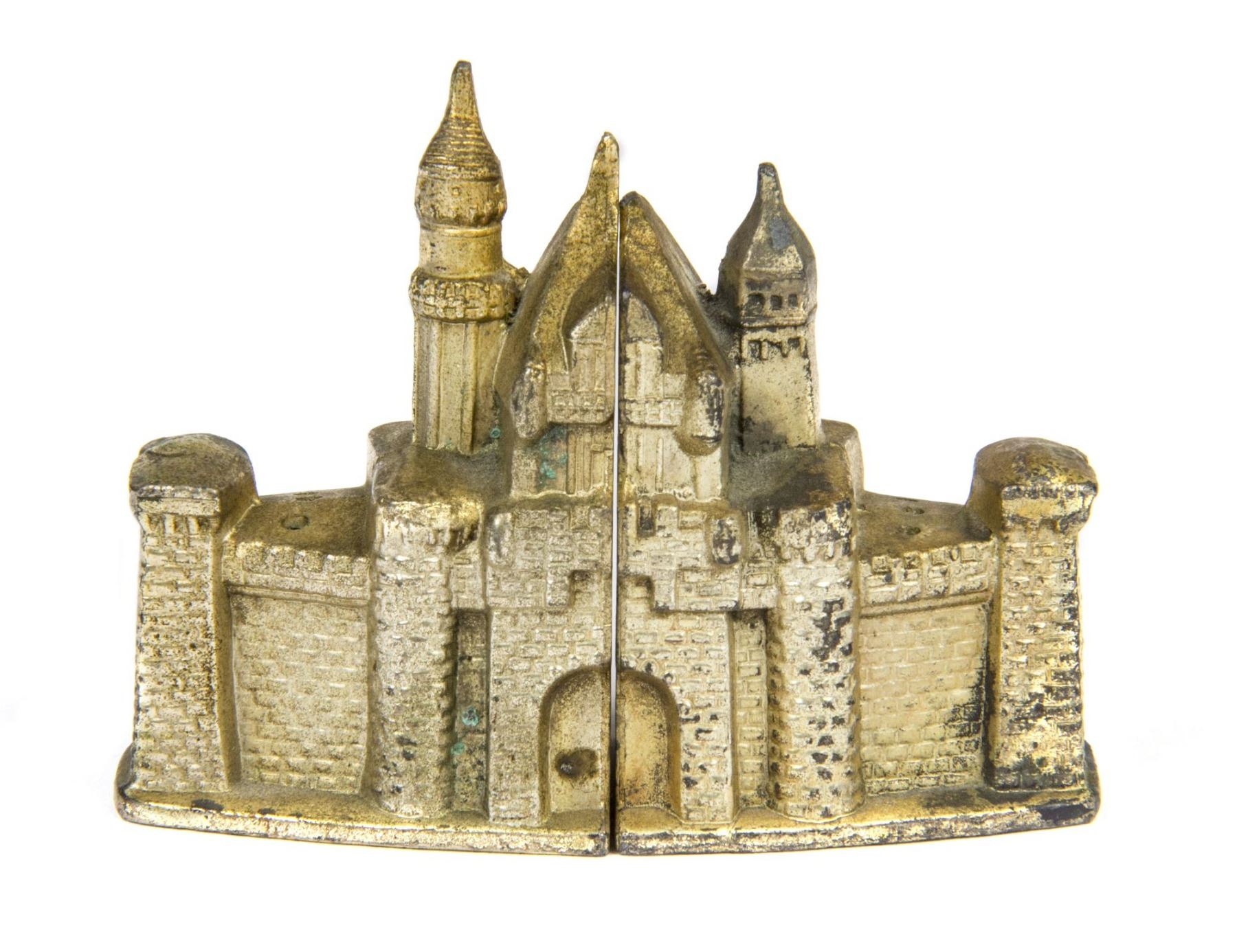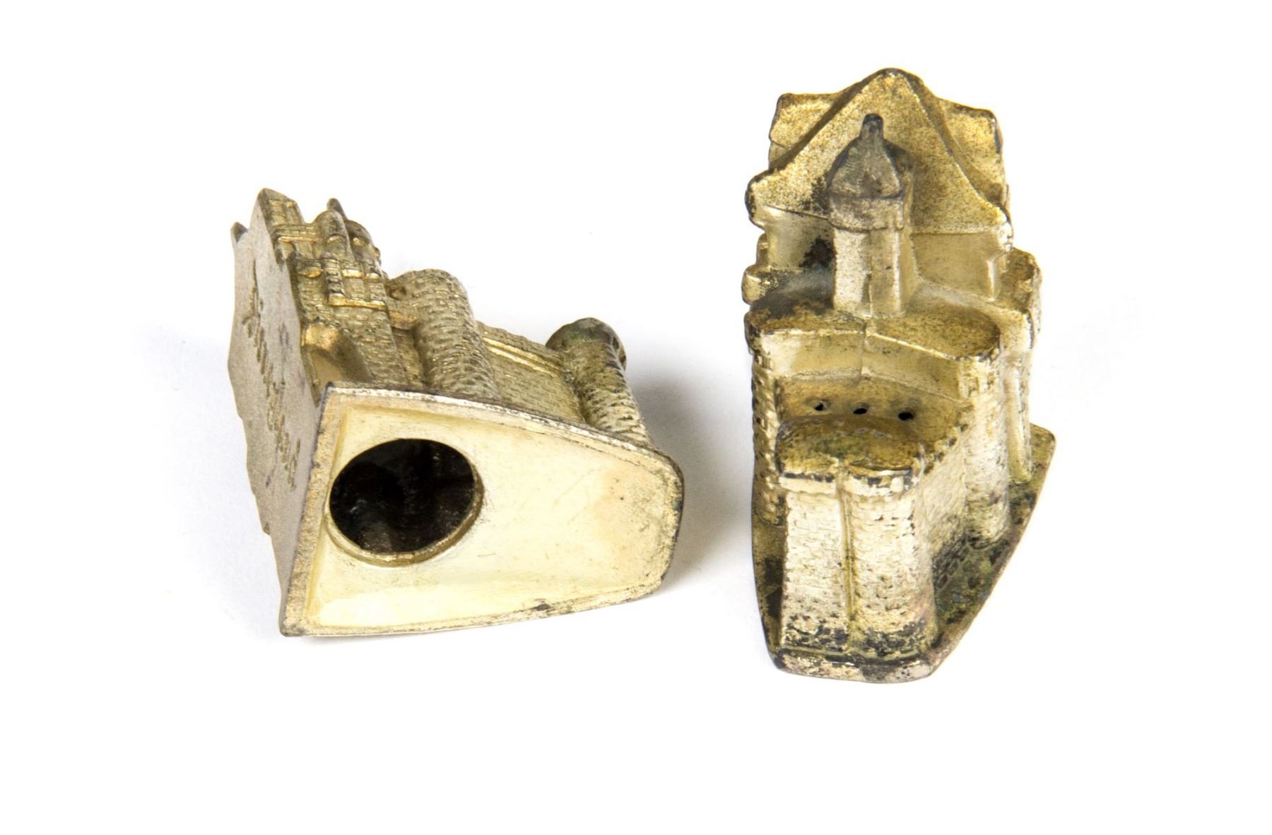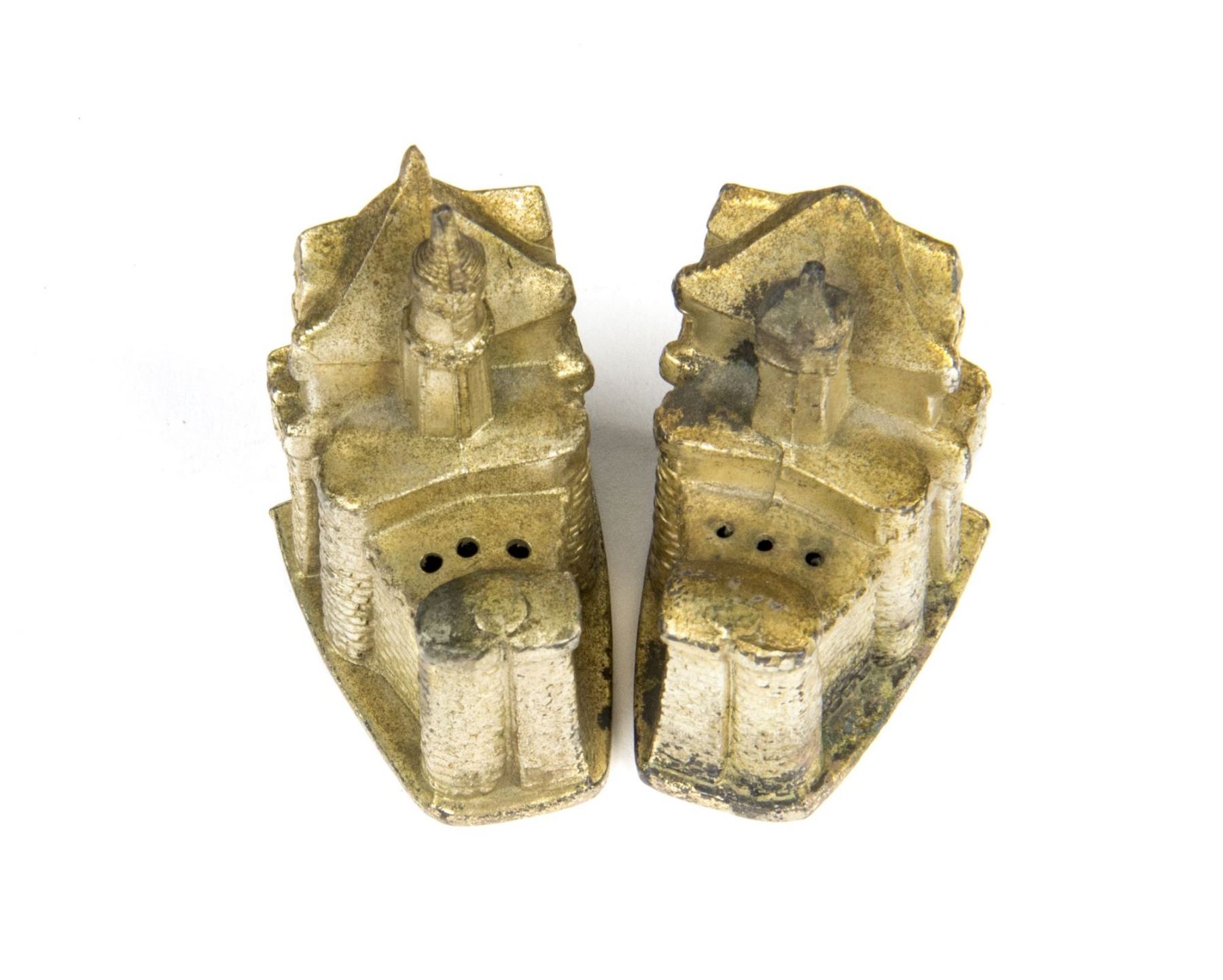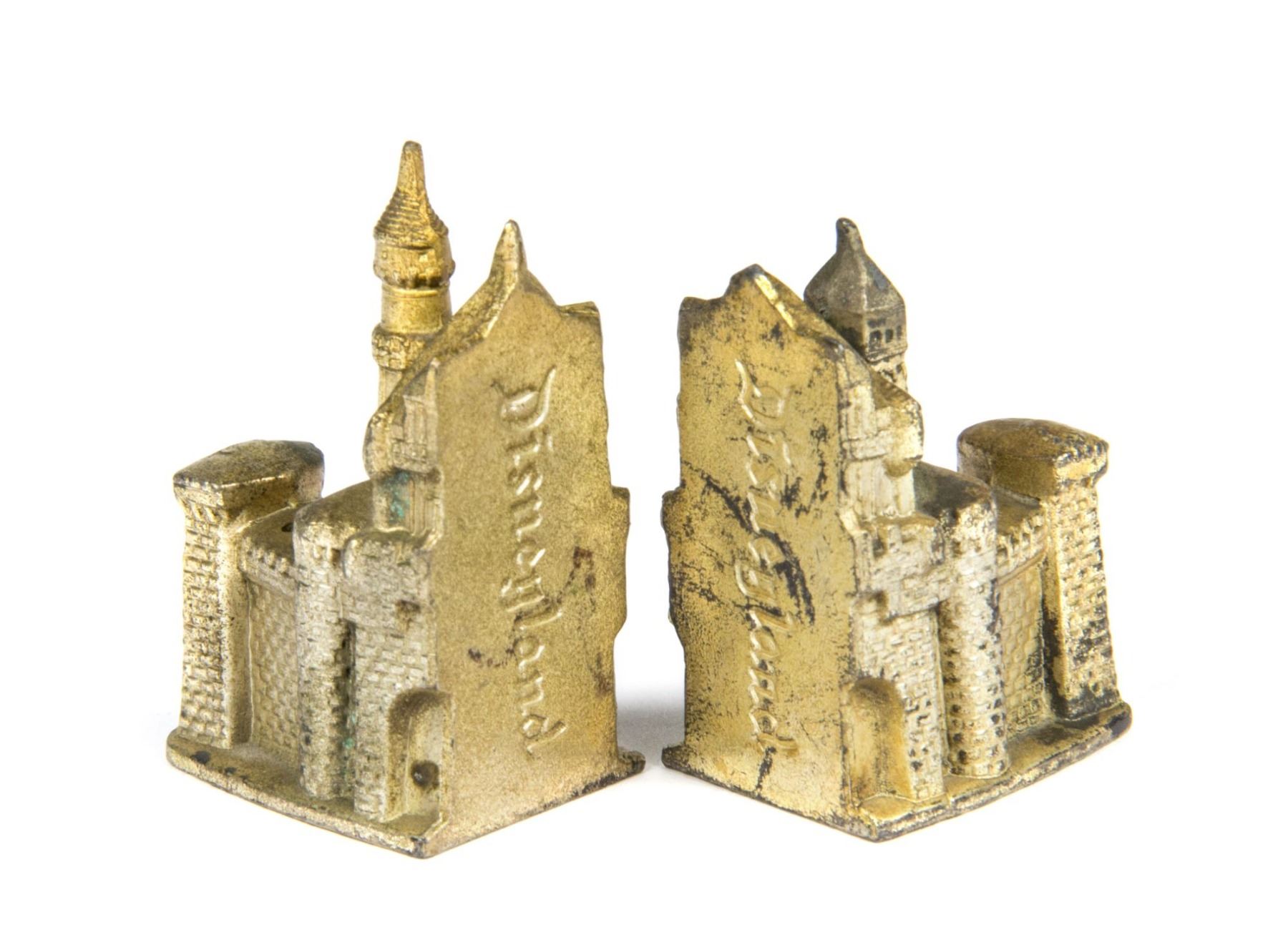 (Disneyland, c.1958) A metal salt and pepper shaker set modeled after Disneyland's iconic Sleeping Beauty Castle. The shakers each form one half of the castle, and are marked "Disneyland" on the sides that touch. The set measures 2.5" tall and 3" long, and the condition is fair to good overall with some wear from use. The shakers do not have stoppers on the bases.