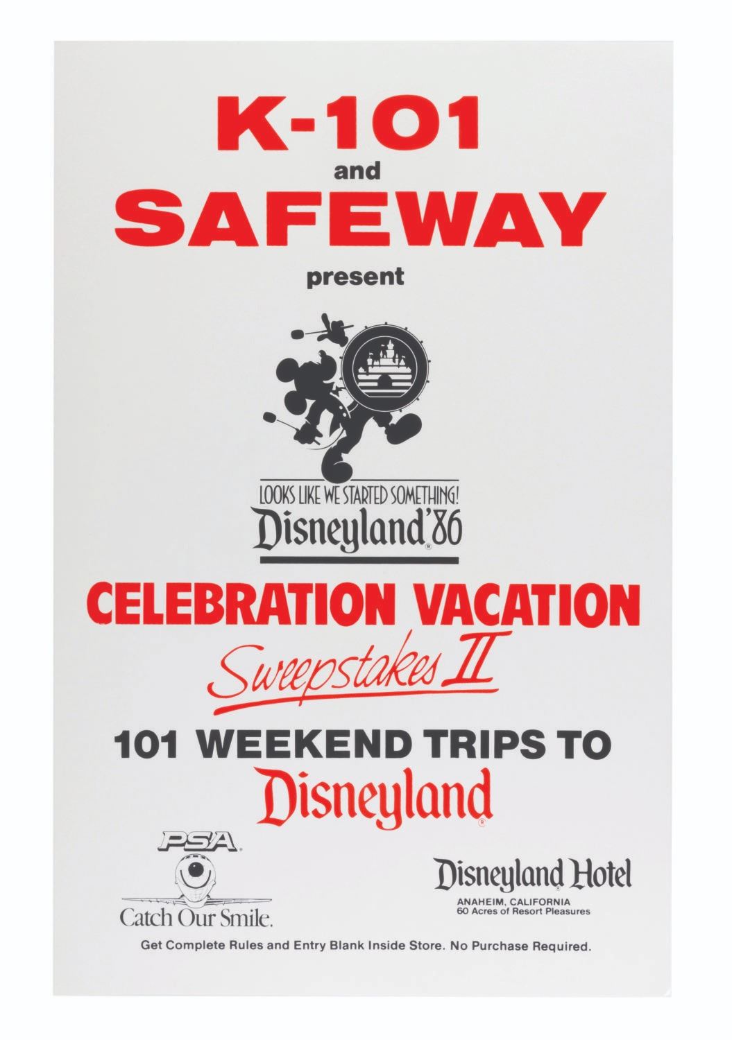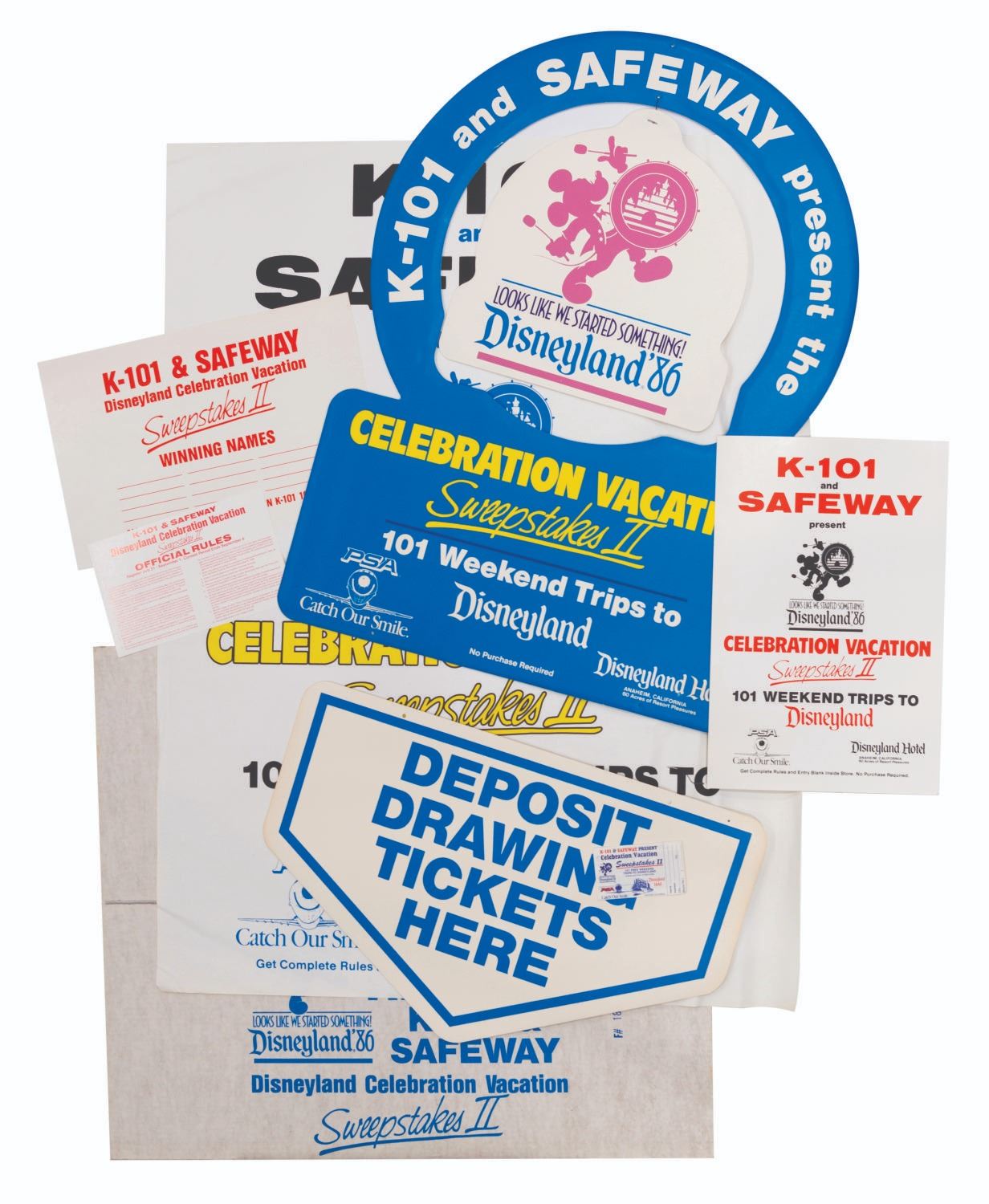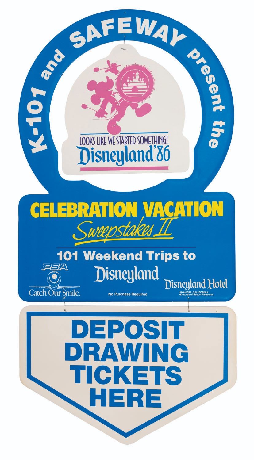(Disneyland, 1986) A Looks Like We Started Something Celebration Vacation Sweepstakes II display kit. Presented by K-101, Safeway, and Pacific Southwest Airlines, the sweepstakes awarded 101 weekend trips to Disneyland. Included in the mobile display kit are a large poster, a display ring, a dangler, a store display sign, an official rules cards, a winning names board, a ticket box, and ten sweepstakes entry tickets. Ranging in size from the 3” x 5” entry tickets to the 39.5” x 49.75” poster, the display is in very good condition with light wear, creases, and folds from storage.