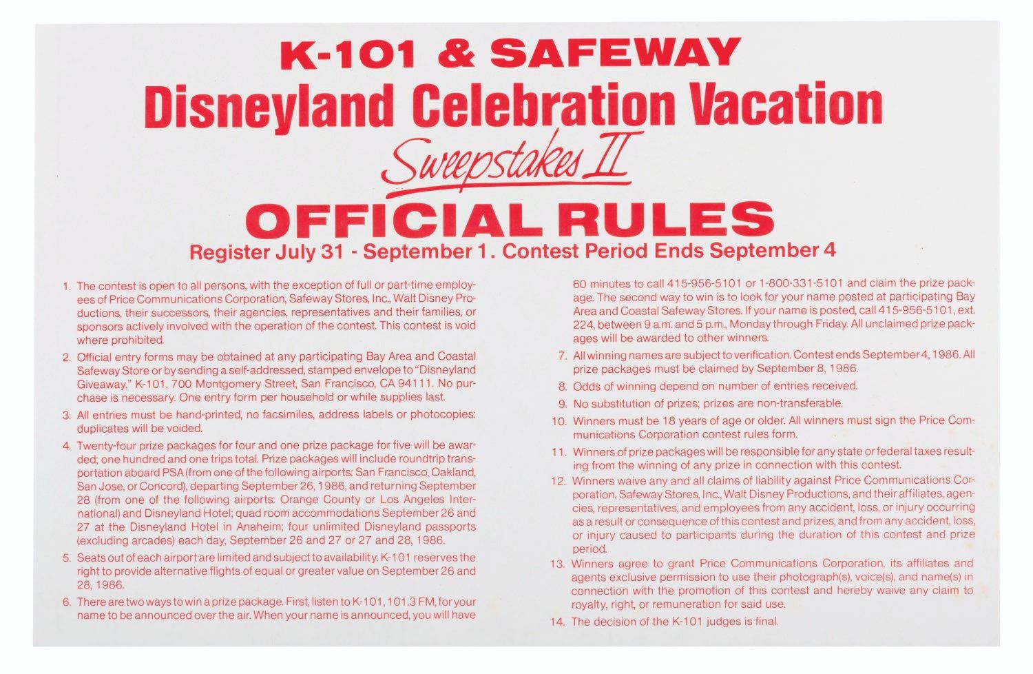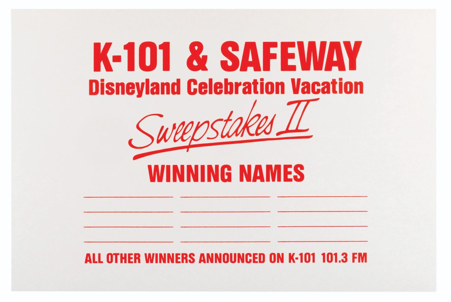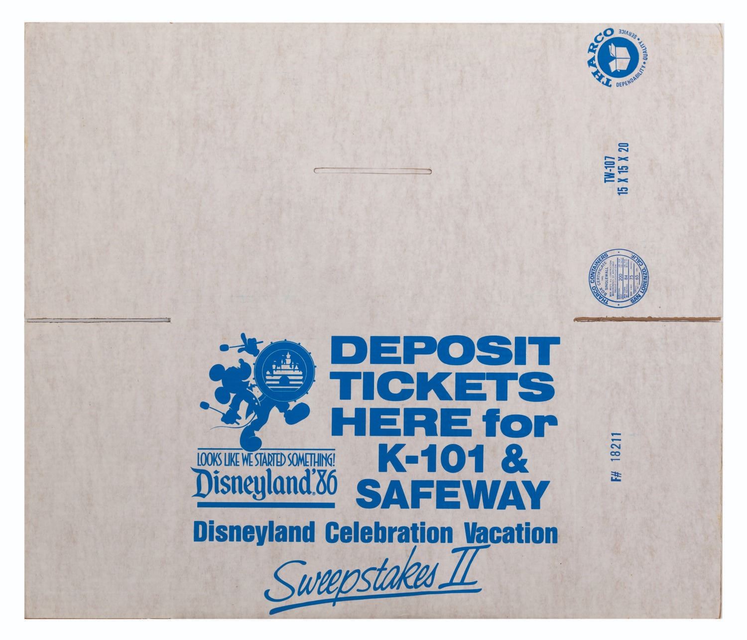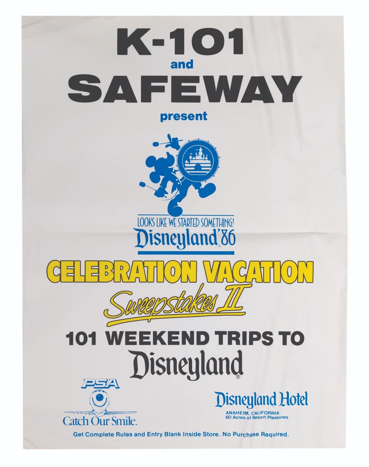 (Disneyland, 1986) A Looks Like We Started Something Celebration Vacation Sweepstakes II display kit. Presented by K-101, Safeway, and Pacific Southwest Airlines, the sweepstakes awarded 101 weekend trips to Disneyland. Included in the mobile display kit are a large poster, a display ring, a dangler, a store display sign, an official rules cards, a winning names board, a ticket box, and ten sweepstakes entry tickets. Ranging in size from the 3” x 5” entry tickets to the 39.5” x 49.75” poster, the display is in very good condition with light wear, creases, and folds from storage.