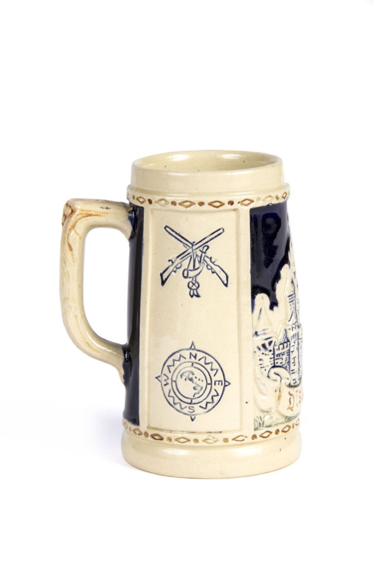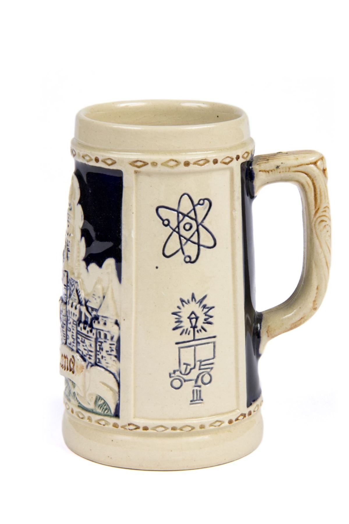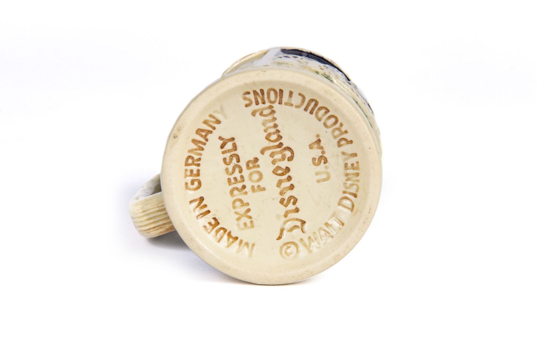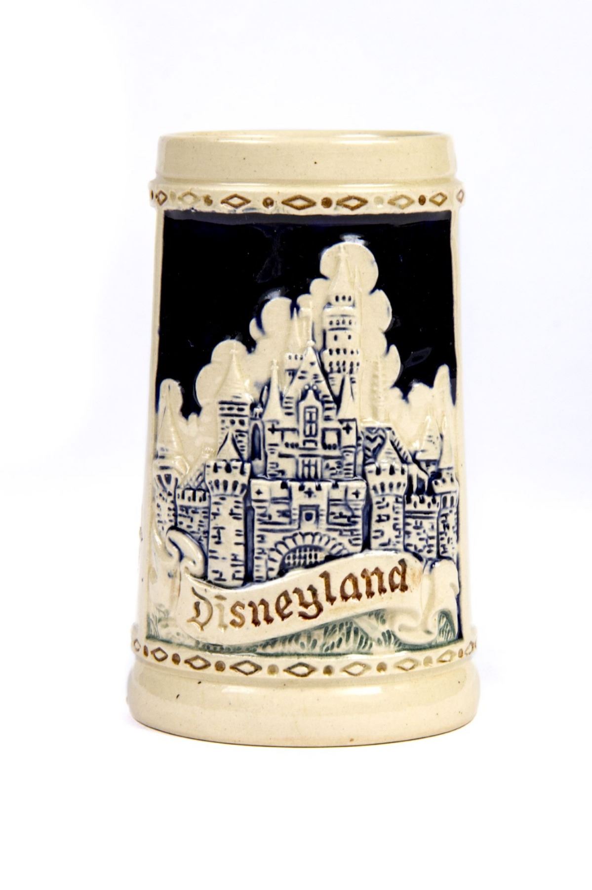 (Disneyland, c.1956) A decorative souvenir ceramic stein featuring imagery of Sleeping Beauty Castle with symbols representing the park's different lands. The stein measures 3.25" in diameter and 5.5" tall and is in fair to good condition with some wear throughout and no lid. The base reads "Made in Germany Expressly for Disneyland".