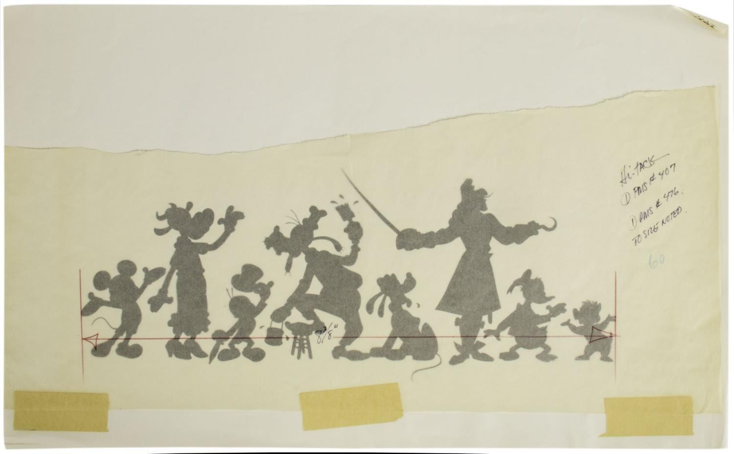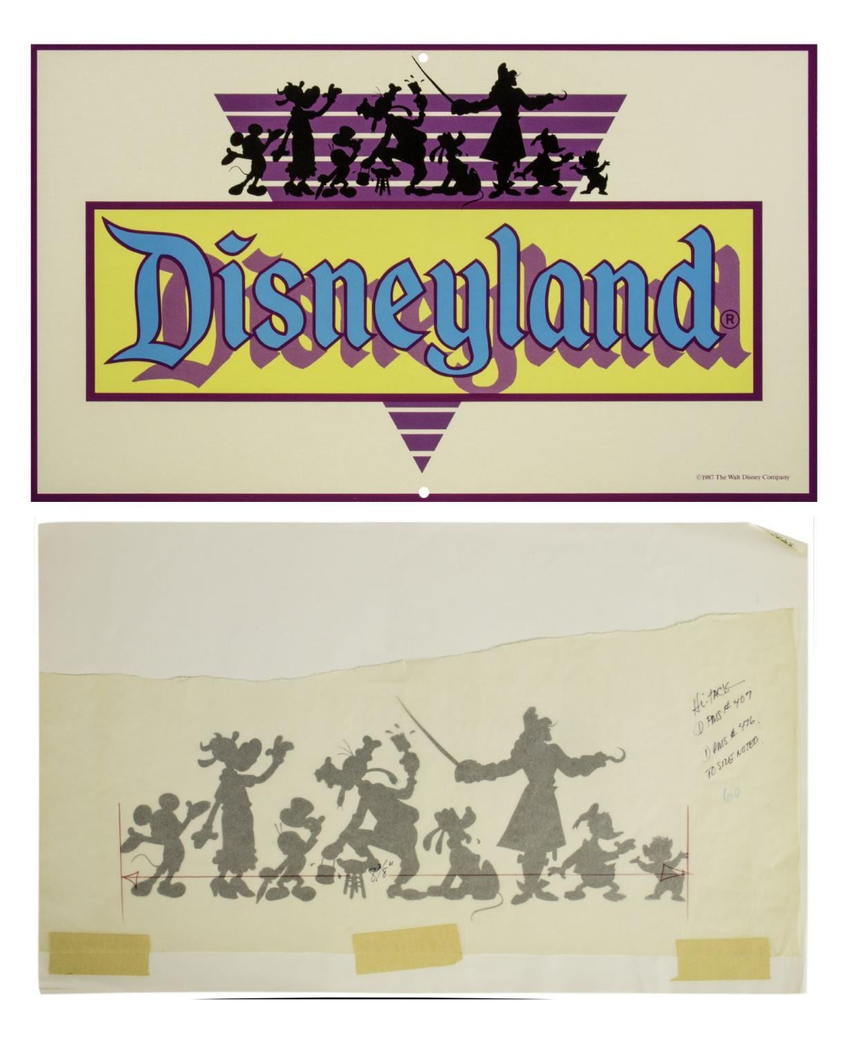 (Disneyland, 1987) The original art for silhouettes of characters used with a Disneyland logo in 1987. Including Mickey, Clarabelle Cow, Jiminy Cricket, Goofy, Pluto, Captain Hook, Donald, and Chip, this illustration is accomplished in black paint on artist's paper. Included is a promotional sign for the 50th Anniversary of "Snow White and the Seven Dwarfs” with the logo and silhouettes on the reverse. The art measures 11.75" x 19.25" and is in very good condition with an overlay and light wear from production use. The sign measures 6.75" x 11.5” and is in very good condition.