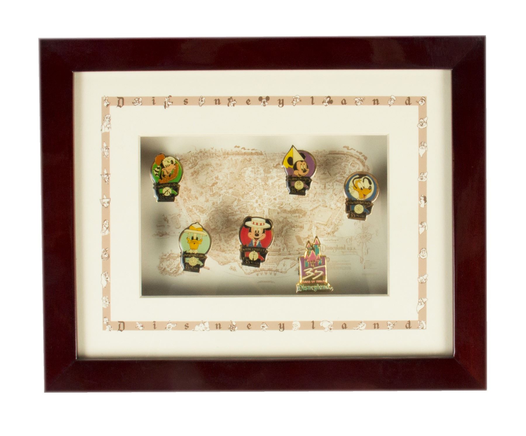 (Disneyland, 1990) A special pin set created to celebrate Disneyland's 35th Anniversary. The (6) pins are displayed in a beautiful frame over a backdrop of the 1958 souvenir park map. The pins use characters to represent the different lands of the park, with each character in a land-specific costume. The framed pin set measures 8"x10" and 1.5" thick and the condition is very good.