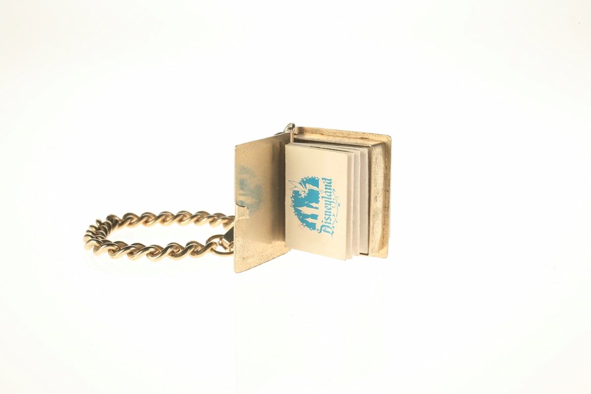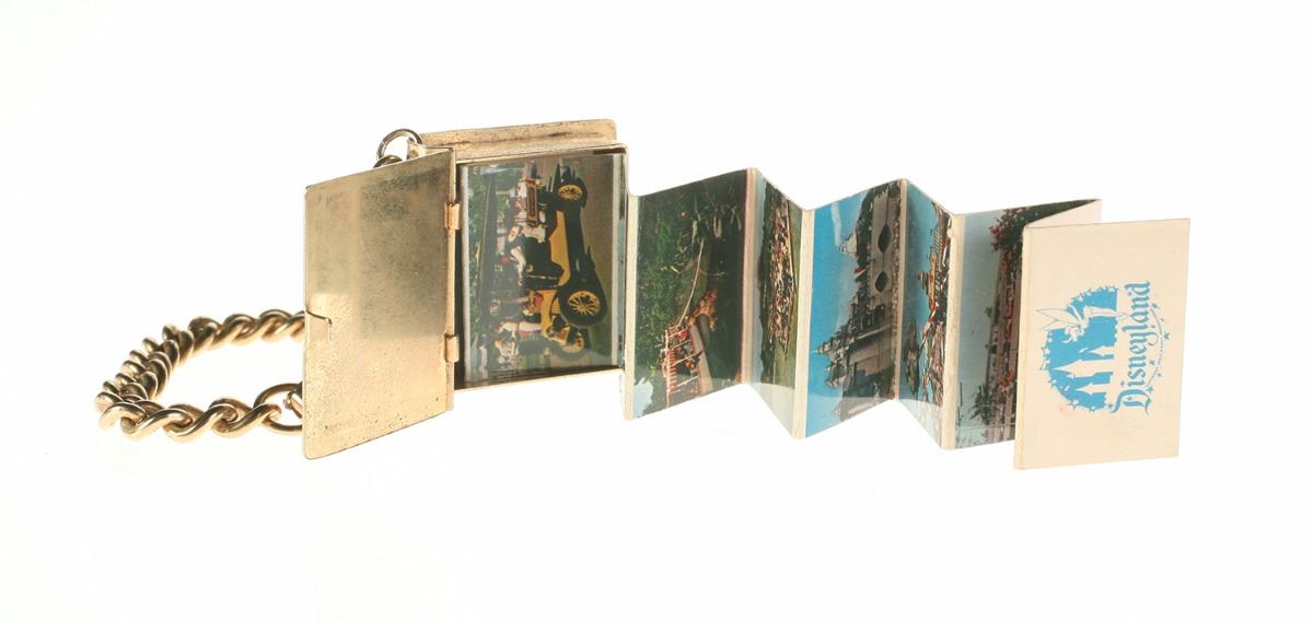 (Disneyland, 1950s) Mother of pearl covered Disneyland book charm bracelet containing (10) color pictures of Disneyland. Rare to find with pictures intact. The charm measures 1”x1.25”, the bracelet is 6" long. In good condition, with some tarnishing and discoloration.