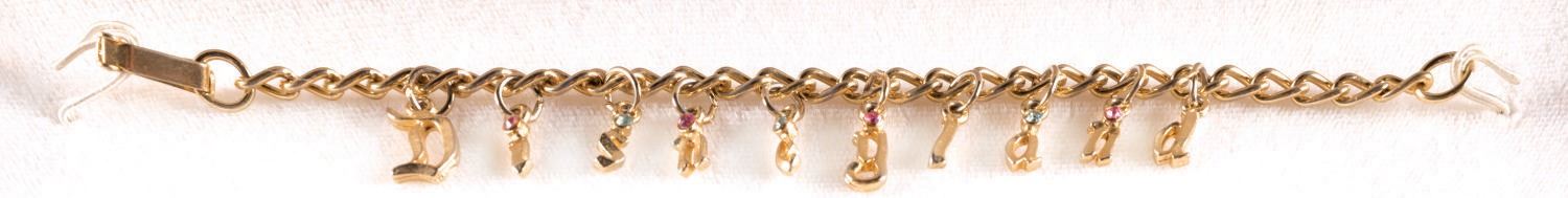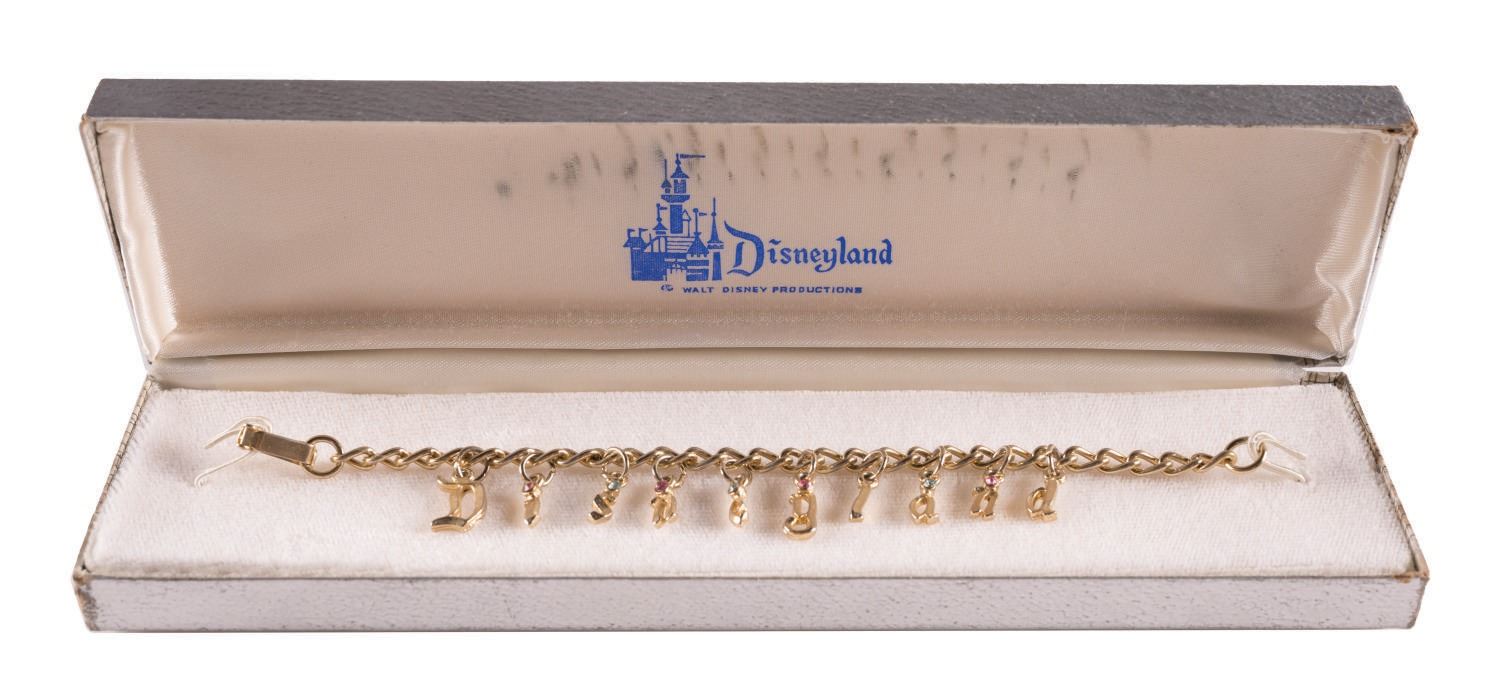 (Disneyland, 1960s) A souvenir "Little Miss" gold finish charm bracelet from Disneyland. This bracelet features 10 charms that spell out "Disneyland" in Old English typestyle accented with small colorful stones. The bracelet measures 6" and is in fine condition in its souvenir Disneyland jewelry case box.